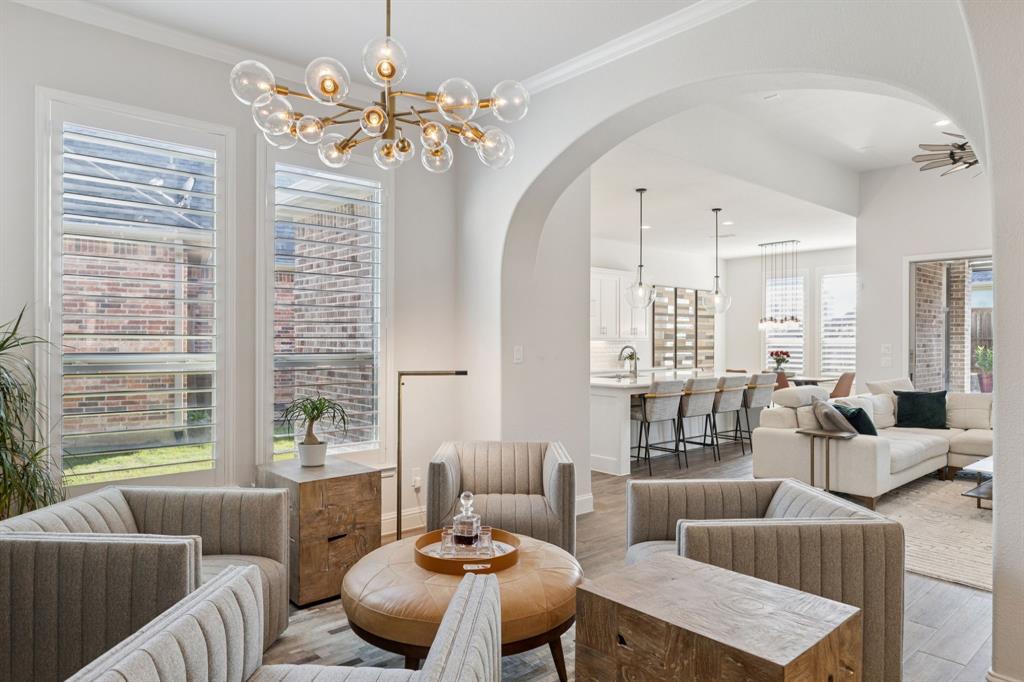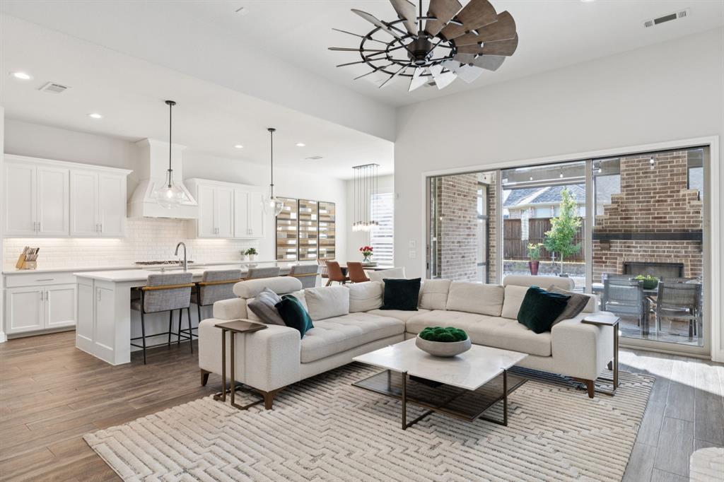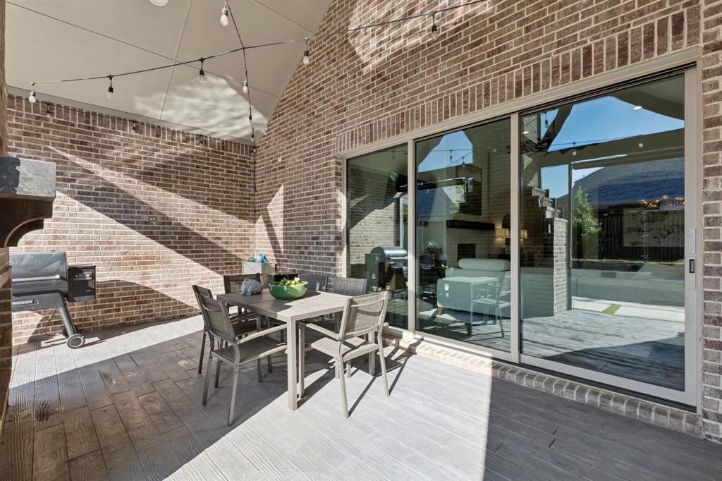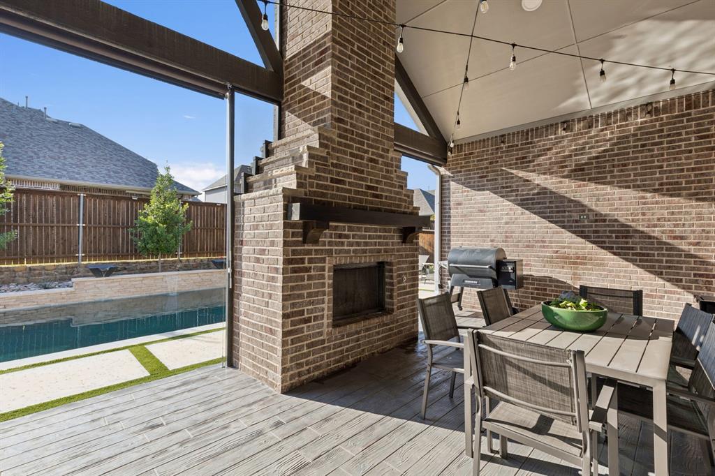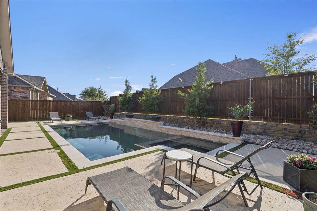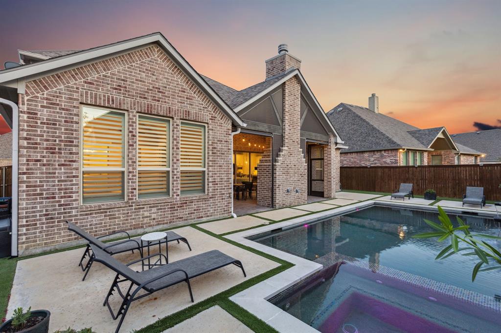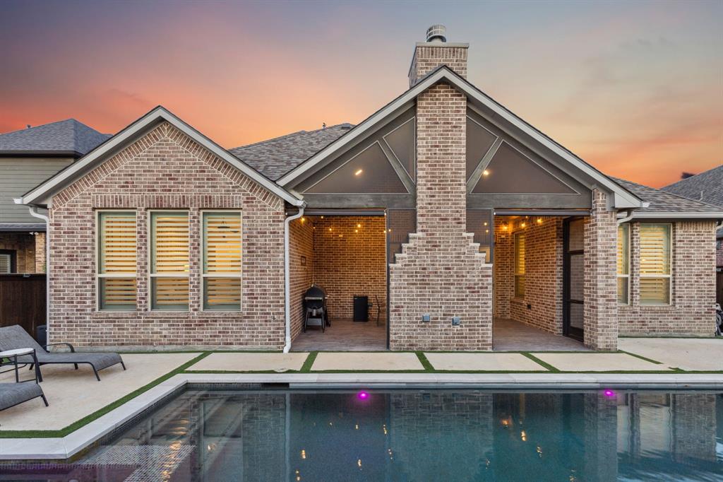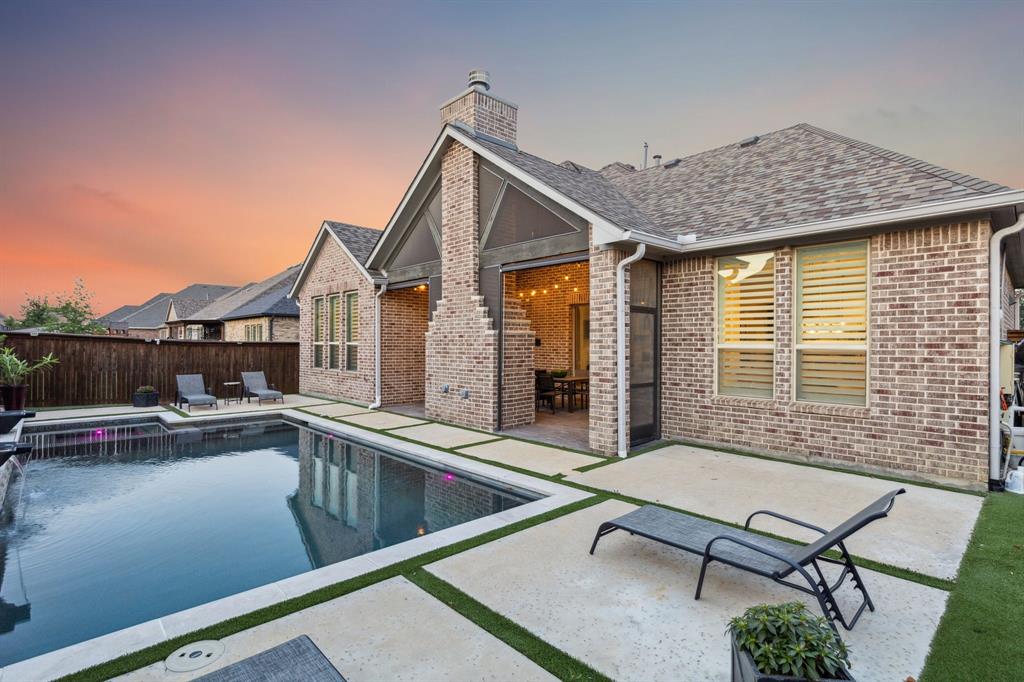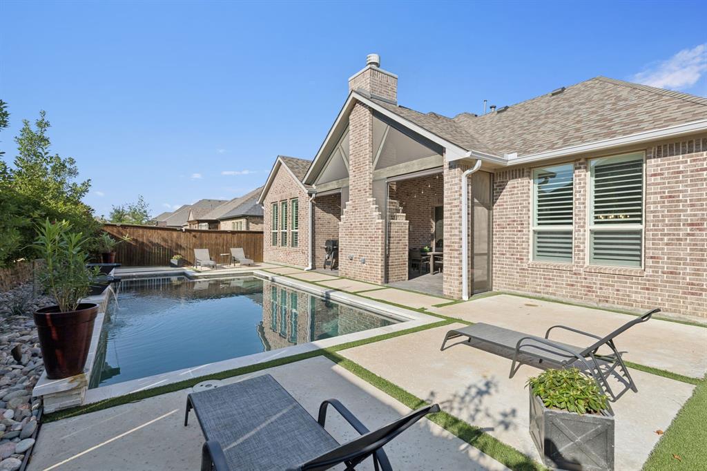 Luxurious active living in this gorgeous Light Farms home with backyard OASIS! This 4 bedroom designer home features a private separate office, two spacious dining areas, light & bright family room & kitchen in a thoughtful open floor plan. Family room features cozy fireplace with beautiful sliding glass doors for access to patio & pool. Chef's kitchen features white cabinets, stainless steel appliances, gas cooktop, large island with bar seating, under counter lighting & ample pantry. Primary suite is oversized with seating area, soaking tub, walk in shower, dual sink & vanity & large walk-in closet. Secondary bed & full bath downstairs. Upstairs find large game room PLUS media room with two additional bedrooms & full bath. DREAM BACKYARD features pool with spa & water feature, large covered patio with fireplace, spacious uncovered patio space to enjoy the sun, beautiful landscaping, artificial turf, automatic screens on patio for your comfort! SO MANY EXTRAS in this one including designer touches throughout from lighting to hardware to wall treatments in tasteful transitional colors, plantation shutters, lots of storage space, 3 car garage & more. Located in highly sought after Prosper ISD with all the active amenities you and your family could want! Don't miss this one!