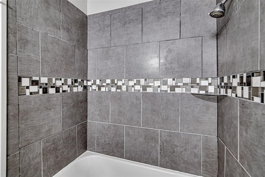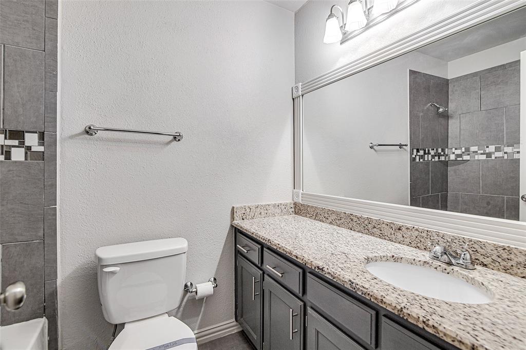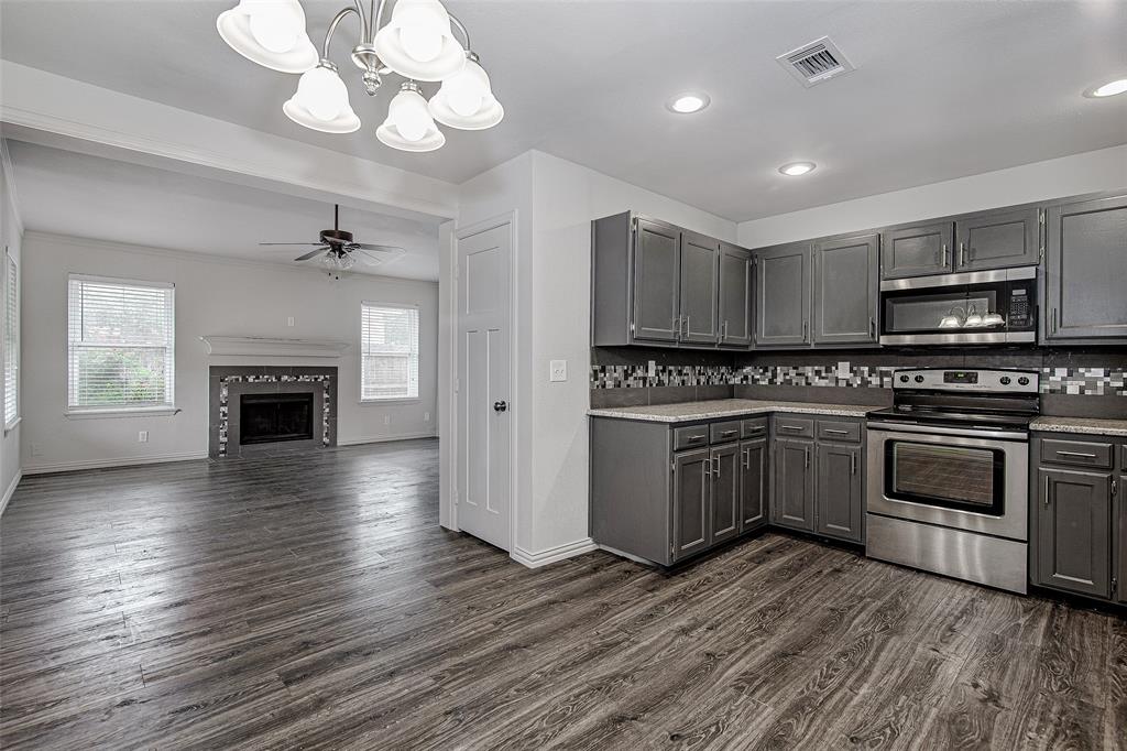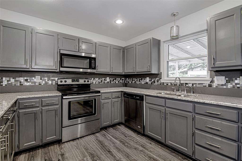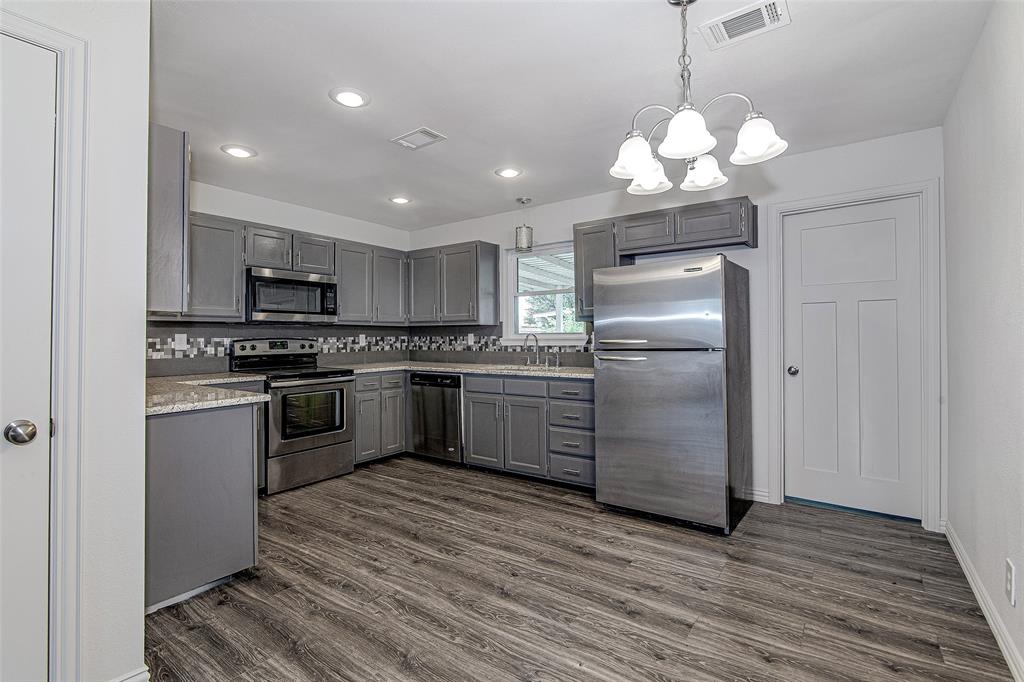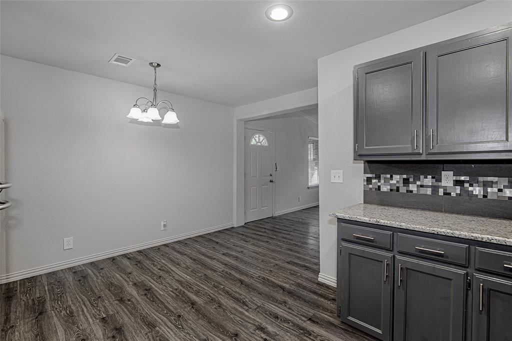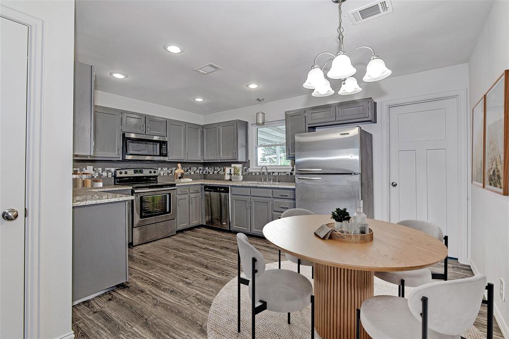 The fully updated kitchen boasts modern convenience with ample cabinet space, sleek granite countertops, updated appliances, and a stylish tile backsplash. The adjoining dining space accommodates a larger dining table.
