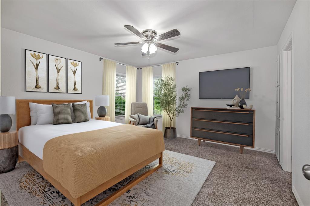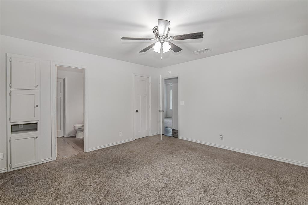 The primary suite offers generous closet space, built-in cabinet storage, and an ensuite bathroom. Two additional bedrooms provide plenty of space, each complemented by great closet storage and access to a second full bathroom.