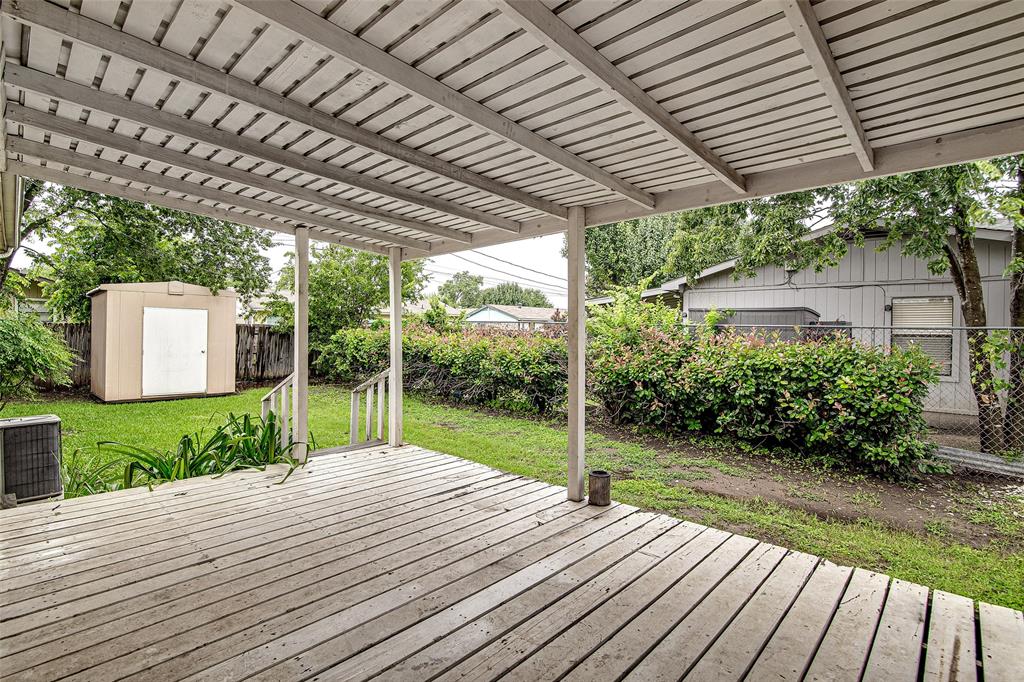 Step outside into a tranquil backyard featuring an extended covered patio deck, ideal for outdoor furniture and enjoying the beauty of the mature trees and lush greenery. A convenient storage shed completes the space, providing extra room for tools, lawn equipment, and more.