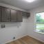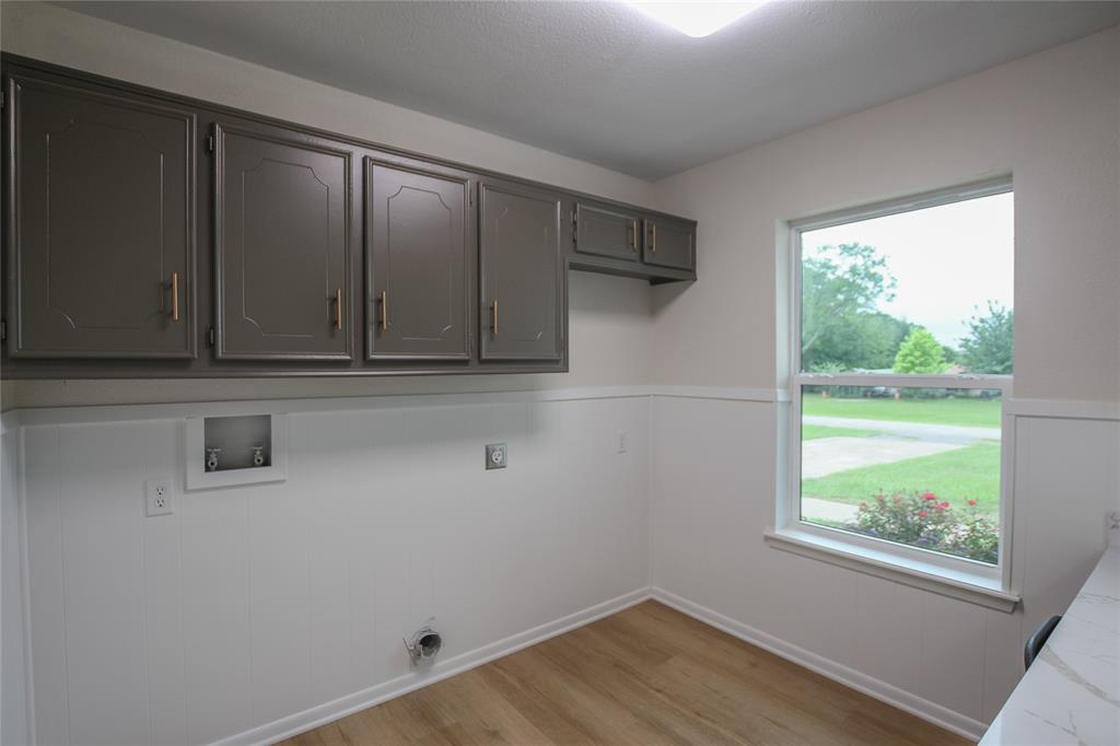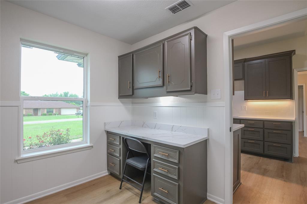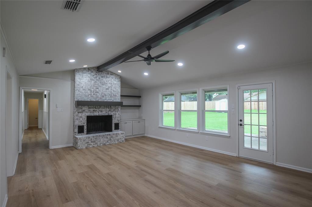 Adjacent to the kitchen is a practical utility room with washer and dryer hookups, plus a built-in office nook—perfect for work, study, or staying organized. The heart of the home lies in the large living area, complete with a brick fireplace and expansive windows that frame beautiful backyard views.