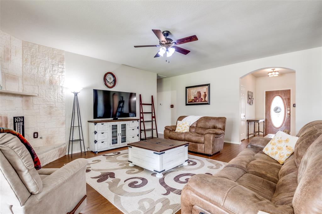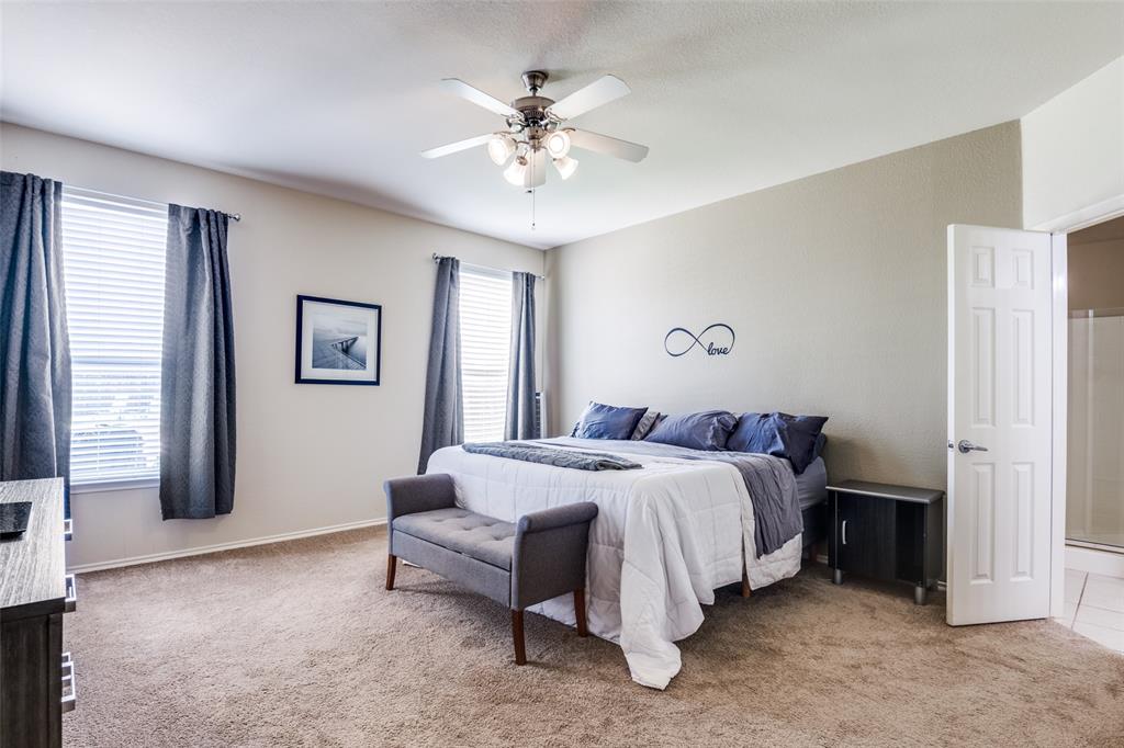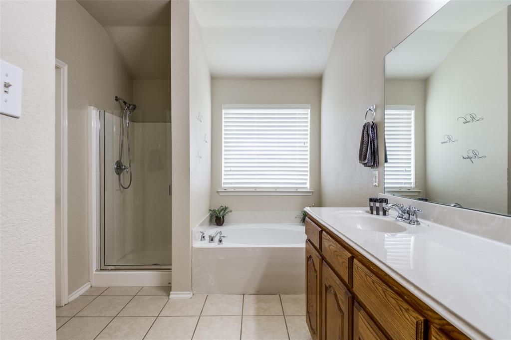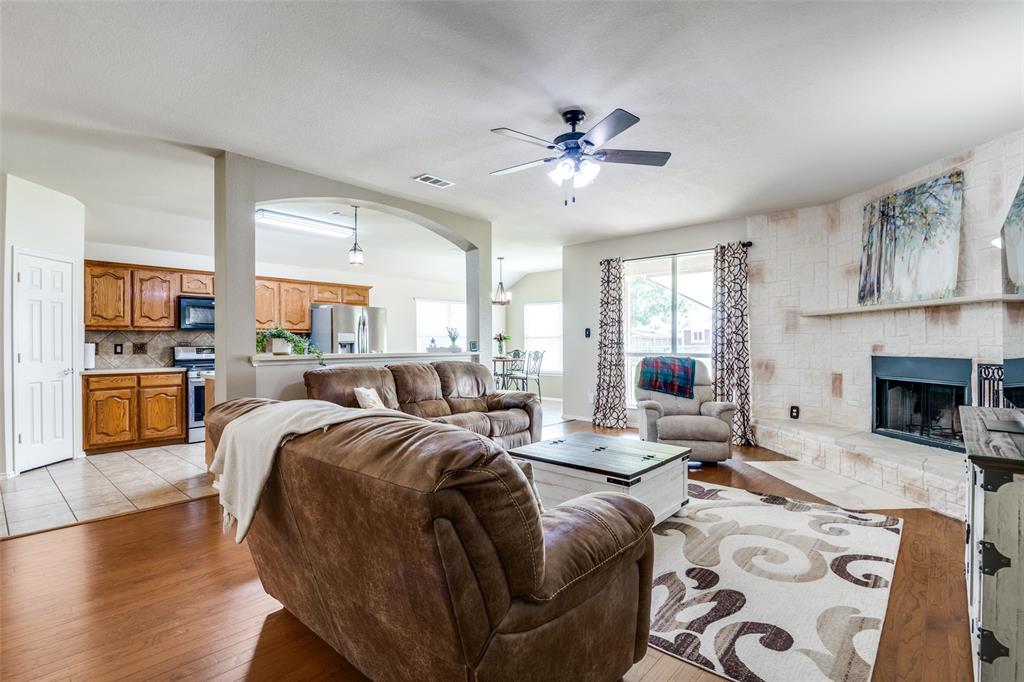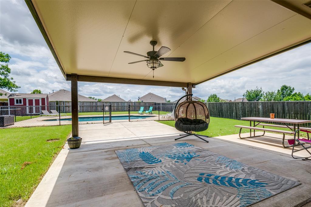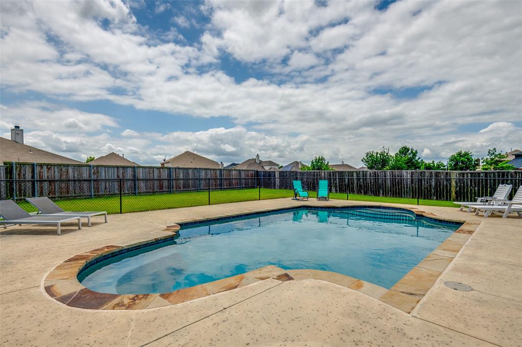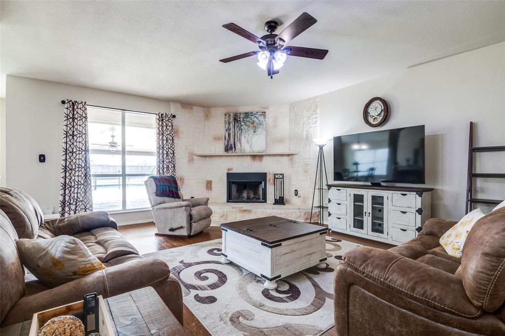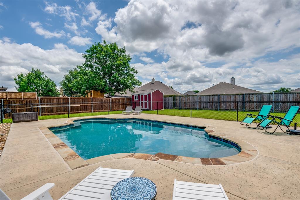 Move-In Ready Home with Pool, Game Room, and Flexible Office Space in Forney, TX. This stunning 1.5 story home offers a private backyard oasis featuring a sparkling gunite inground pool with a premium PebbleTec surface—perfect for cooling off and entertaining. The interior welcomes you with a spacious open-concept layout, highlighted by a custom floor-to-ceiling stone fireplace, wood flooring throughout living room, dining room and hallways, with abundant natural light. The living area flows into a generous dining space and a well-appointed kitchen featuring stainless steel appliances, extensive cabinetry, and a charming breakfast nook with views of the backyard. All bedrooms are located on the main level, including the spacious primary suite with a large walk-in closet and a private bath complete with a jetted garden tub, separate walk-in shower, and dual vanities. Two additional bedrooms are privately situated away from the main living area, with convenient access to the second full bathroom. A dedicated home office with built-in desk provides a quiet and functional workspace. This room can also serve as a fourth bedroom with the simple addition of a closet door, offering flexibility to adapt to various needs. The upper level includes a large game room, ideal for use as a media room, exercise area, play space, or second living room. The covered patio offers a shaded outdoor seating area, while the expansive backyard features a gunite inground sporting pool, with PebbleTec flooring designed for durability and year-round beauty. A large storage shed adds extra space for tools, equipment, or seasonal items. Additional features include decorative lighting, ceiling fans throughout, a two-car garage, and a location near major highways, shopping, dining, and local schools. A full 3D Matterport Tour is available, allowing you to explore every room of the home virtually with 360-degree views.