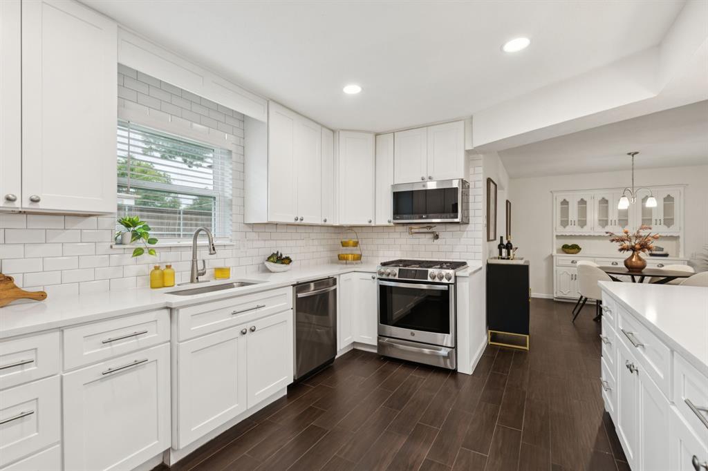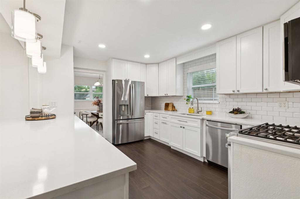 Step inside to an open, sunlit layout featuring a designer eat-in kitchen with quartz countertops, stainless steel appliances, recessed lighting, a pot filler, and a breakfast bar. The kitchen flows into a cozy breakfast nook with views of the newly landscaped backyard, now equipped with extended drip-line irrigation.