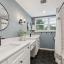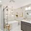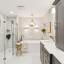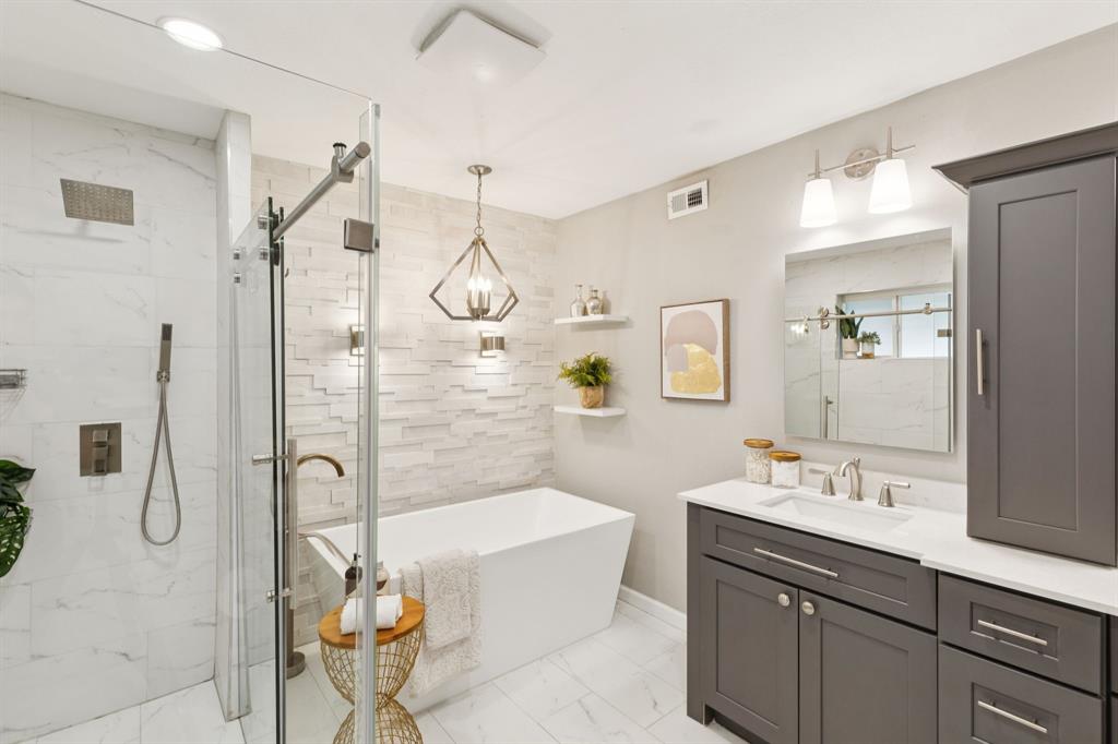 The oversized primary suite features a spa-like bath with a freestanding tub, glass-enclosed shower, dual quartz vanities, and a large walk-in closet. Upstairs, three bedrooms with walk-in closets share a fully updated bath.