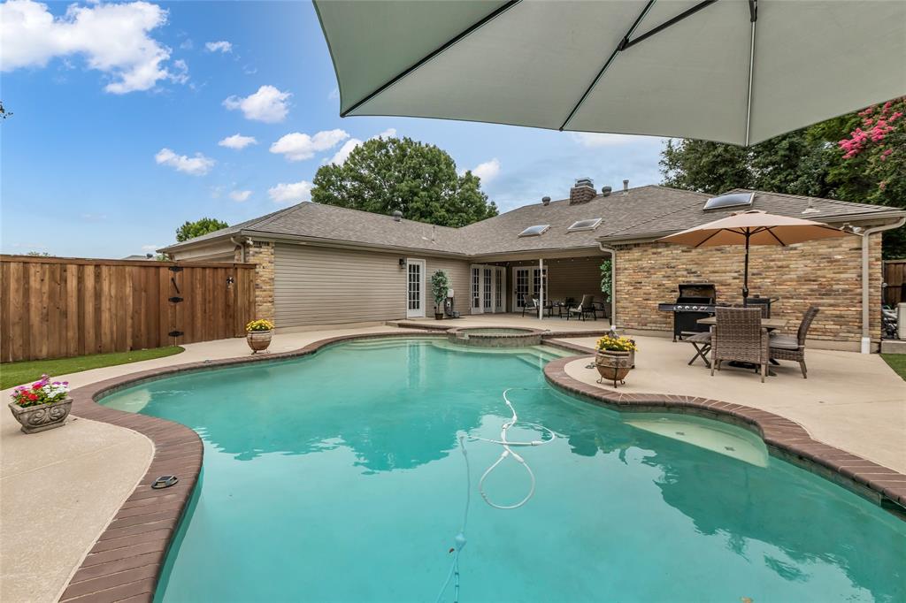 Single-story perfection with a backyard oasis in the heart of west Plano. 2217 Loch Haven Drive offers 4 bedrooms, 2.5 baths, & the layout, location, & outdoor living space buyers dream of. The backyard features a curvy Marseille-style pool with integrated spa, abundant decking, evergreen turf, & a covered porch for year-round relaxation. Multiple French doors open to the pool—including direct access from the primary suite, living room, & den. Inside, the main living room centers on a gas-start brick fireplace with wide hearth & wainscot wrap, flanked by built-ins & crown molding. Skylights fill the home with natural light, while updated flooring includes engineered hardwoods & Versailles-pattern tile. The kitchen offers granite counters, recent appliance updates, crisp white cabinetry, a bay window dining nook, & a garden window above the sink. The spacious primary suite features dual vanities, a jetted tub, separate shower, & generous closet storage. Outside, you’ll love the classic curb appeal, shady mature trees, contoured landscaping, and carefree brick & vinyl siding. Board-on-board fencing adds privacy. Ideally located in Plano ISD near parks, schools, shops, & dining, with quick access to 75, DNT, & PGBT. Whether you’re hosting poolside or unwinding in private tranquility, this home offers the lifestyle you’ve been searching for.