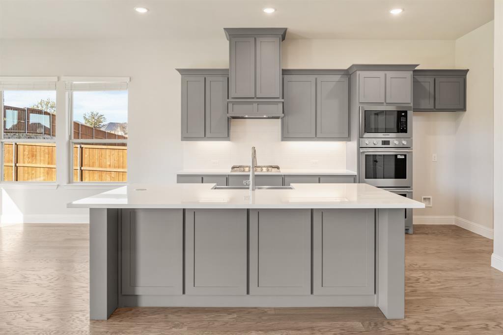 The chef-inspired kitchen features quartz countertops, custom cabinetry, a generous island, and Professional Series appliances with double ovens and a five-burner gas cooktop. Pot and pan drawers, under-cabinet lighting, a butler’s pantry, and walk-in food storage add convenience and functionality.