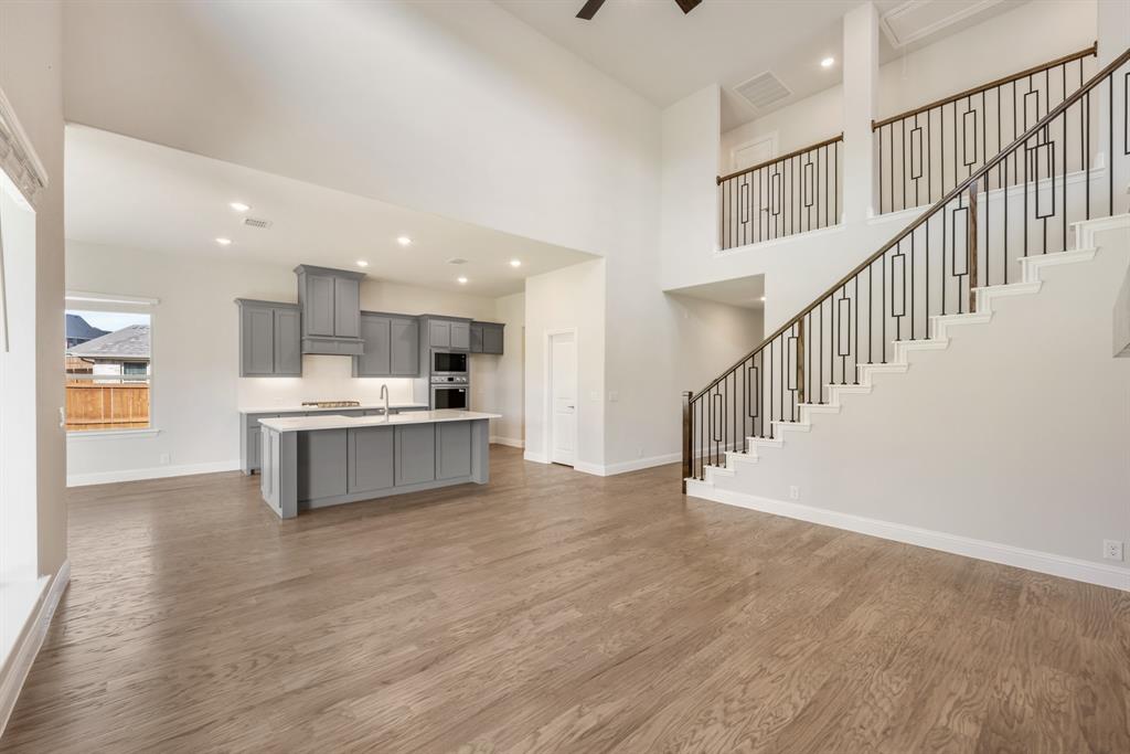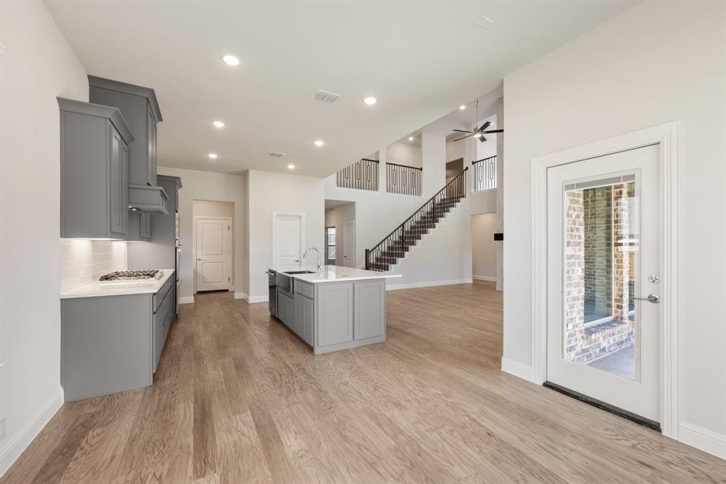 Hand-scraped hardwood flooring flows through the first-floor common areas, creating warmth and character. The large family room makes a bold impression with a tile-to-ceiling fireplace, offering a stylish setting for both quiet evenings and lively gatherings.