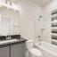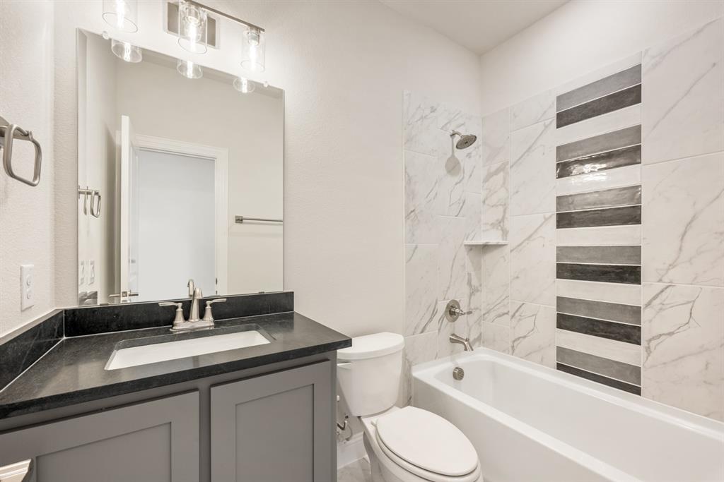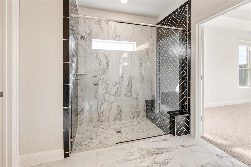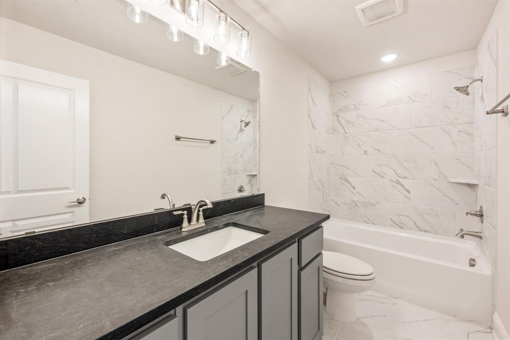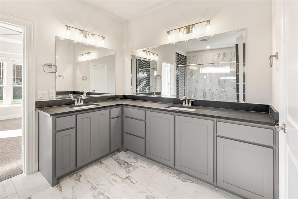 The luxurious primary suite includes dual vanities, granite countertops, an oversized walk-in shower, and a large walk-in closet. All four bathrooms are finished with modern fixtures and granite countertops.