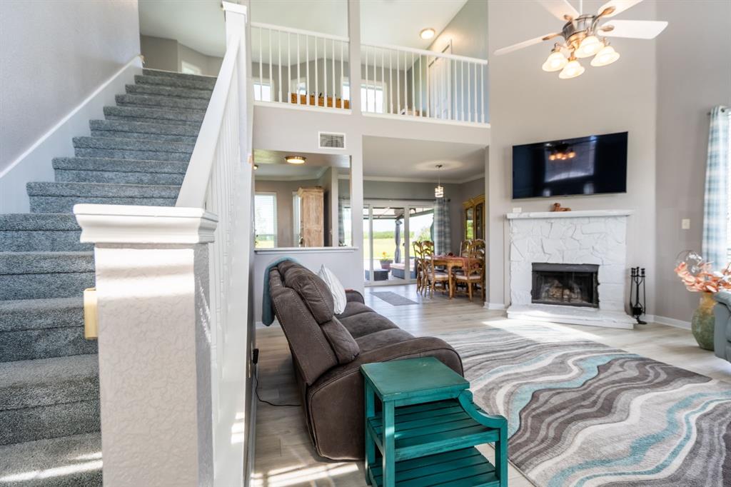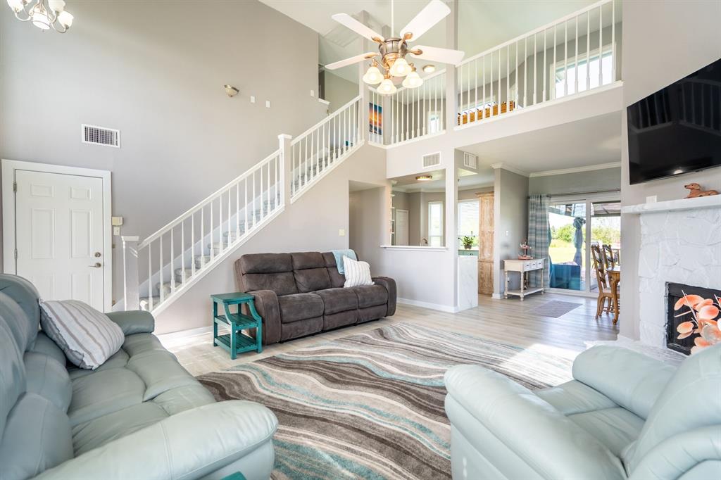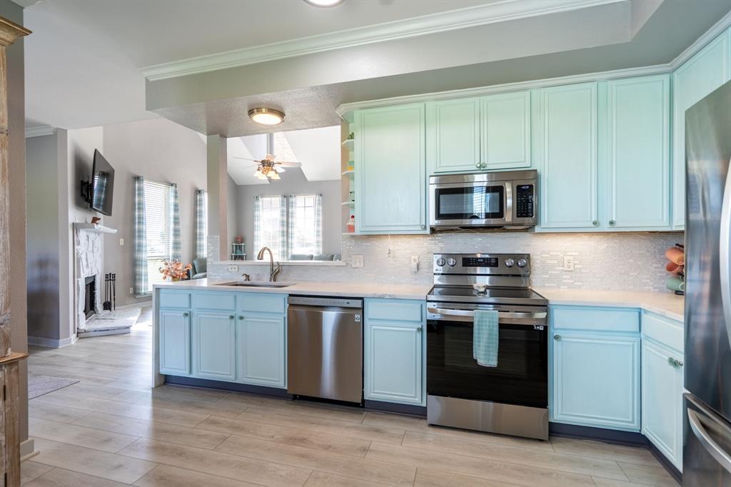 opening in August 2025. Fresh interior & exterior paint with a light, airy feeling throughout the home. The main living area features vaulted ceilings, a woodburning stone fireplace & adjacent to kitchen & dining. The kitchen includes gorgeous quartz countertops, mosaic tile backsplash, electric range, deep stainless-steel sink, pantry, & bay window breakfast nook. The dining area opens to the backyard through a new sliding glass door. The