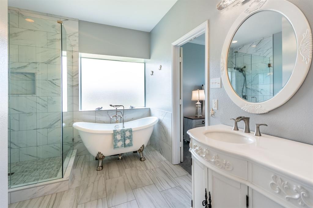 primary suite offers crown molding, & a stunningly updated ensuite bath with a clawfoot tub, frameless