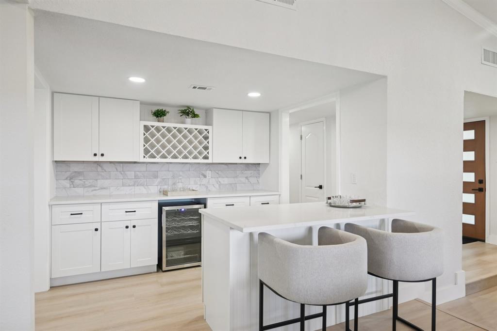 The open-concept floor plan flows seamlessly from the front living area to the dining room, featuring a custom-built dry bar with wine fridge—ideal for entertaining. The spacious den opens into a bright sunroom, perfect for relaxing or hosting guests.