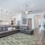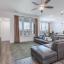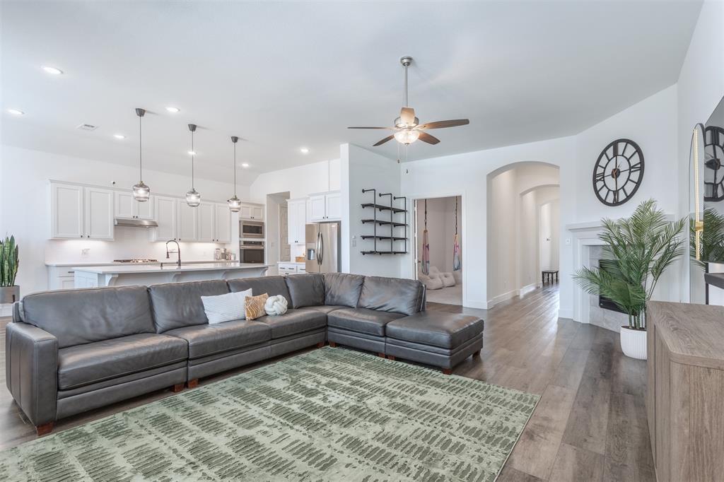 The heart of the home features an oversized island, pendant lighting, ample counter space, and custom tilework. The open layout flows seamlessly into the living area, anchored by a gas fireplace with natural stone surround — perfect for cozy gatherings.