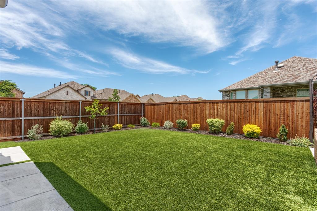 The east facing backyard was professionally designed with pet grade turf, a tranquil fountain, and low maintenance landscaping. Landscape and fountain lights are controlled via the Wyze app, and the 16 zone sprinkler system is managed through Rainbird.