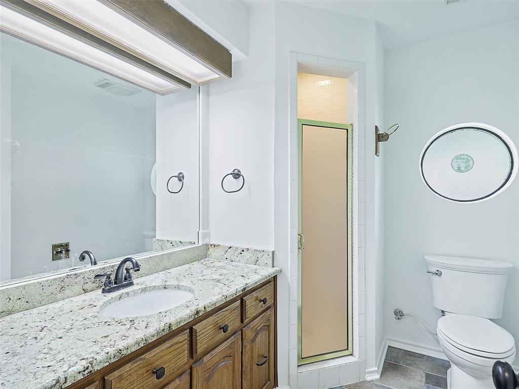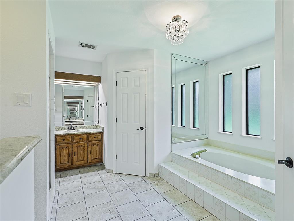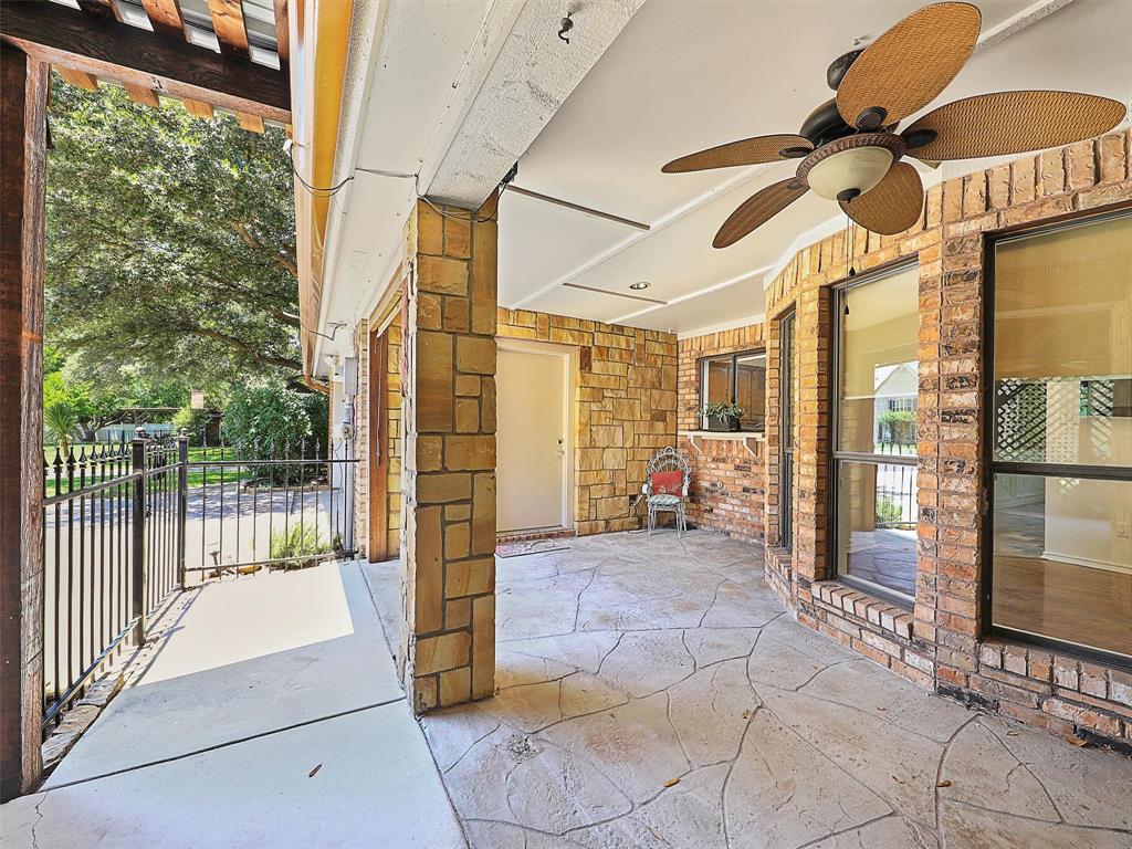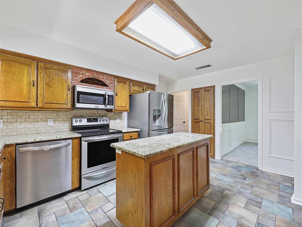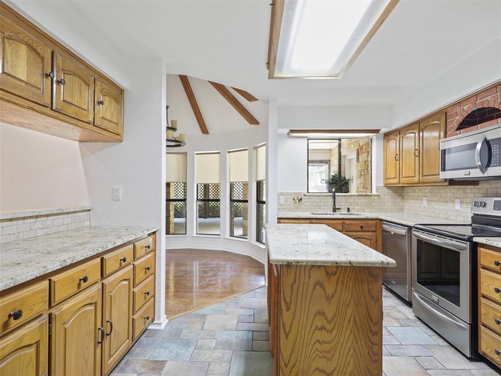 The kitchen overlooks peaceful lake views right from the sink and opens to an extended covered patio that offers privacy and shade, making it ideal for outdoor entertaining or relaxing while enjoying the lush, manicured backyard. Stainless steel appliances complete the kitchen, and the refrigerator conveys with the home.