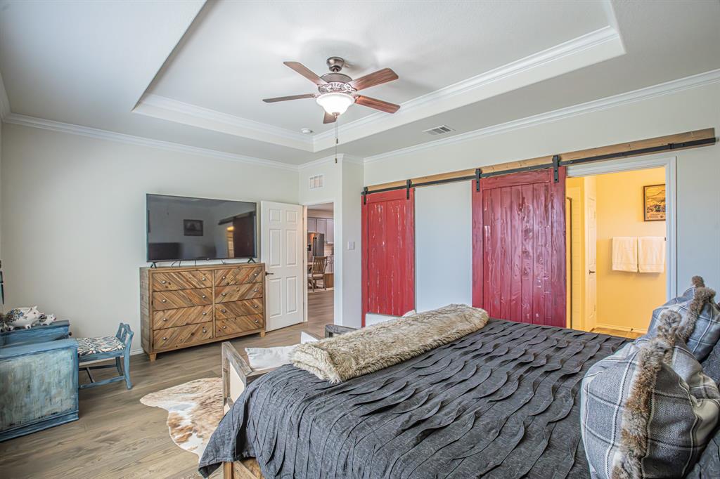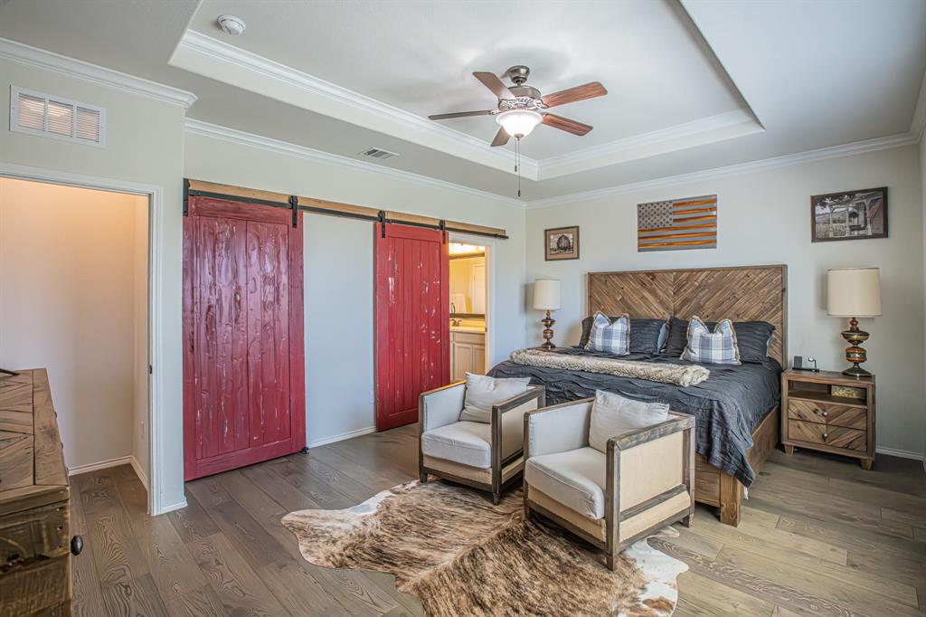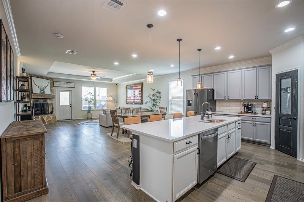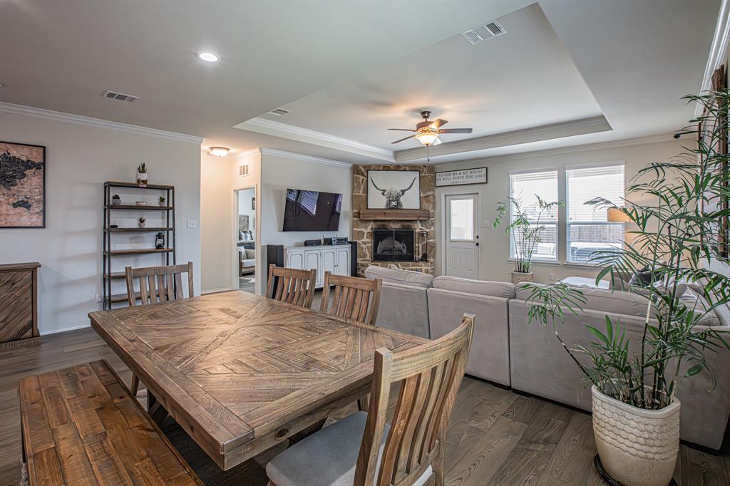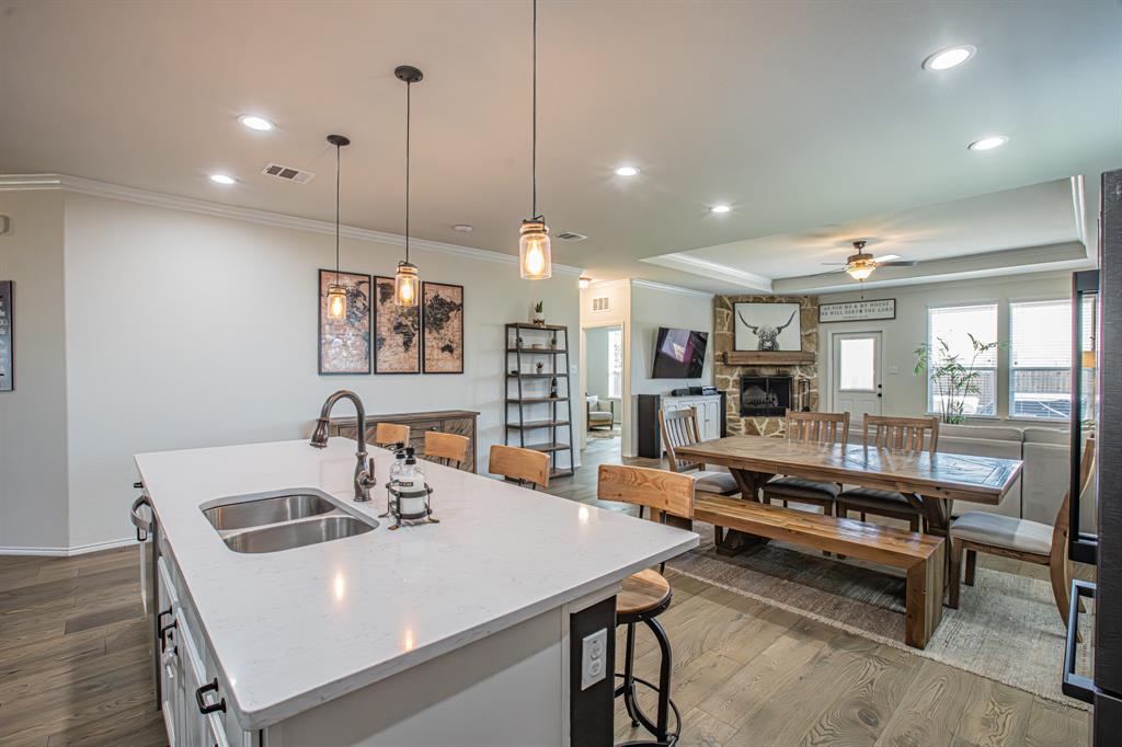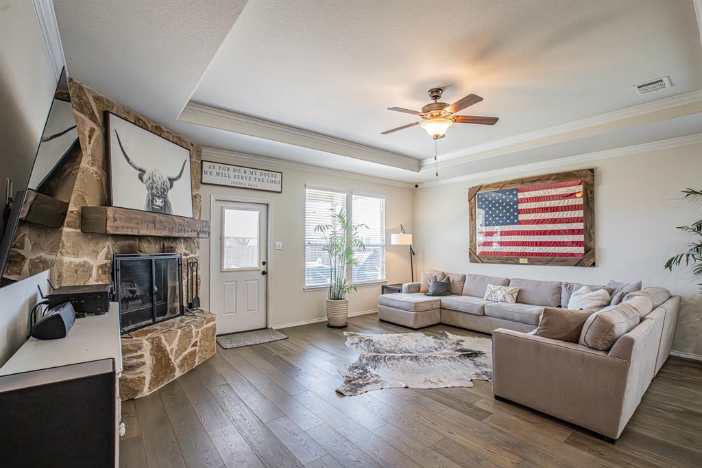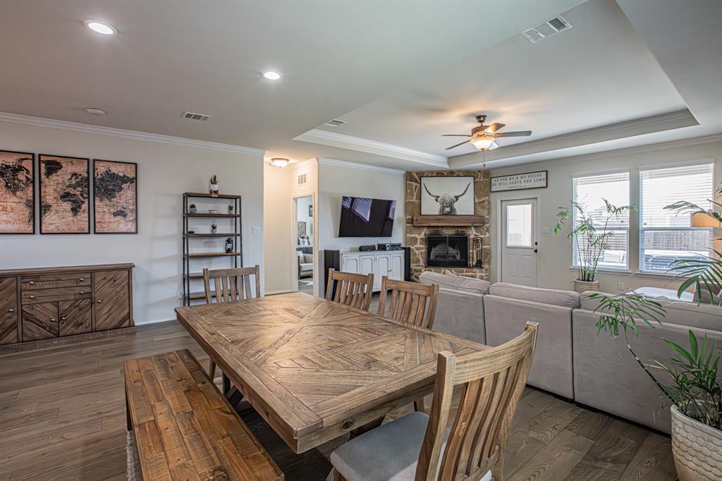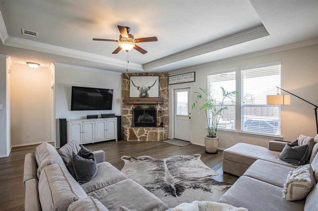 Welcome to this one-owner stunning Pulte home! Seller is offering buy down &or paying off Sunnova solar system, you choose! Updated landscaping leading up to custom brick entrance invite you to the gorgeous, custom front door. This home was built without floor transitions and widened doorways, making wheelchair use a possibility. Office behind large barn door boasts pine wall and extra room for seating! Laundry room has custom door, full size WD space and room for extra fridge. Open kitchen-dining-living areas with huge island and all quartz countertops! All white kitchen, including backsplash, upgraded lighting and pantry door. Large, bright living room with custom rock wood burning fireplace and hand scraped mantle. Primary bedroom has recessed ceiling, crown molding, barn doors for walk-in closet and bathroom. Rain shower head in custom primary shower, dual sinks, quartz counter and upgraded mirror make this primary bath a spa! 220 plug and water softener in garage. Back covered porch with fan and additional rock patio, and enough room for play, make this backyard perfect for gatherings. 2 Pools, 5 miles of walking trails, dog park and more in this community! Home directly across from pool with splashpad.