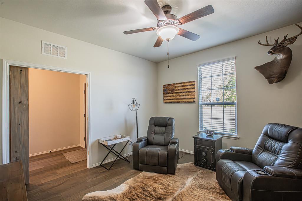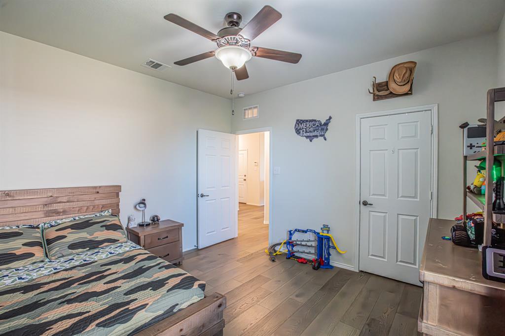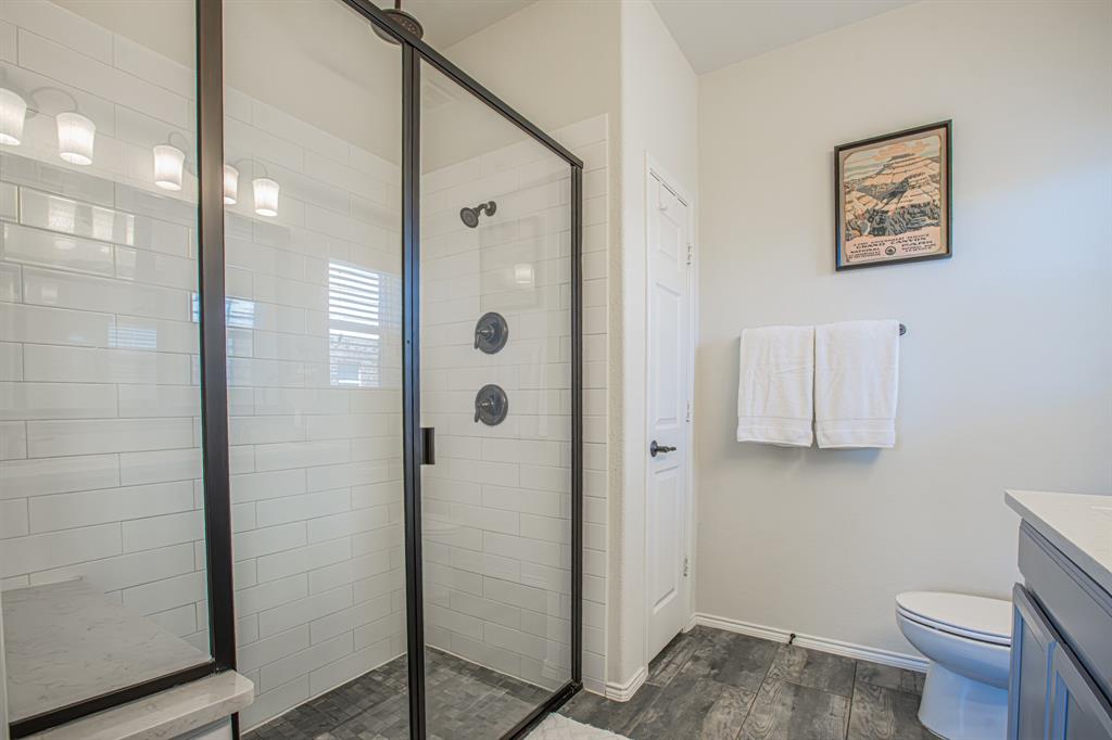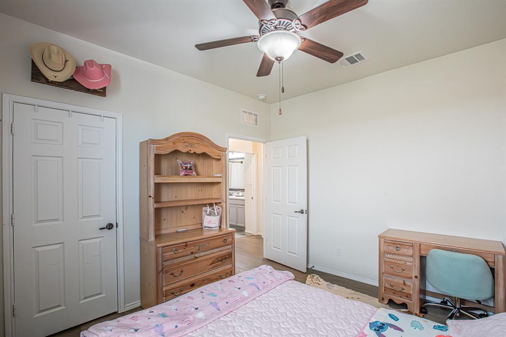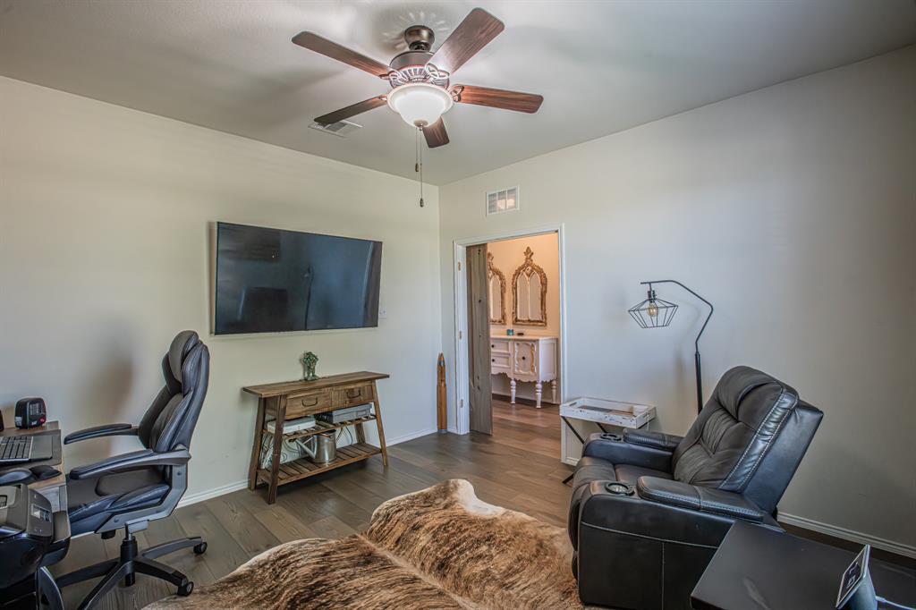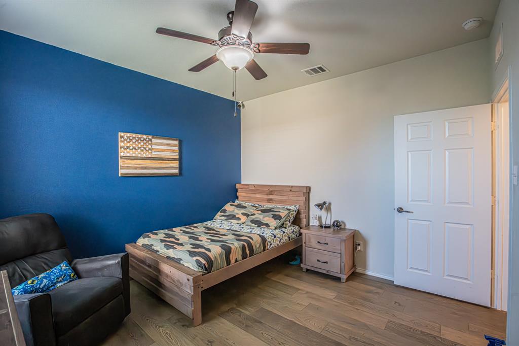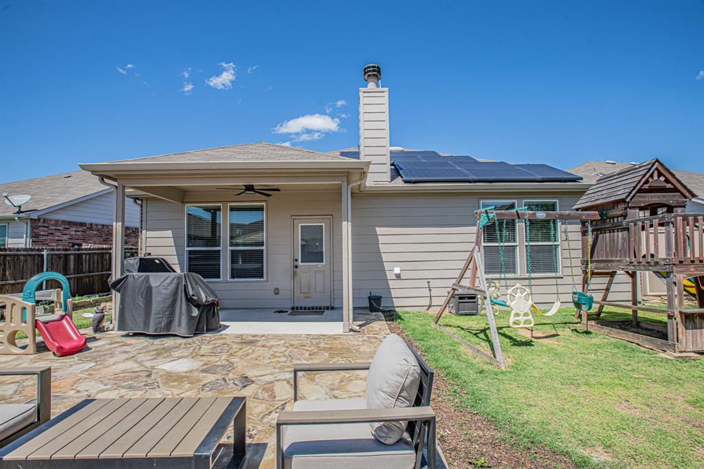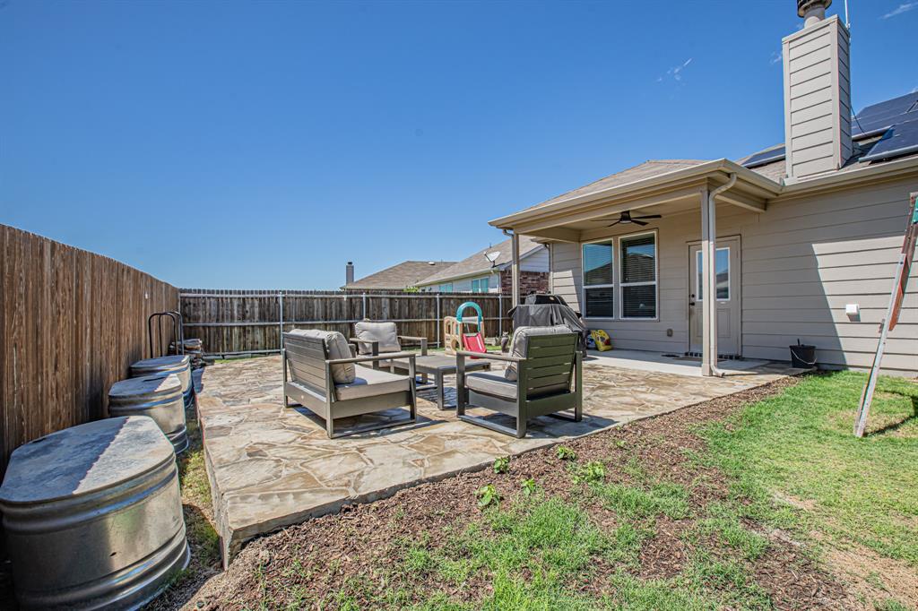 Welcome to this one-owner stunning Pulte home! Seller is offering buy down &or paying off Sunnova solar system, you choose! Updated landscaping leading up to custom brick entrance invite you to the gorgeous, custom front door. This home was built without floor transitions and widened doorways, making wheelchair use a possibility. Office behind large barn door boasts pine wall and extra room for seating! Laundry room has custom door, full size WD space and room for extra fridge. Open kitchen-dining-living areas with huge island and all quartz countertops! All white kitchen, including backsplash, upgraded lighting and pantry door. Large, bright living room with custom rock wood burning fireplace and hand scraped mantle. Primary bedroom has recessed ceiling, crown molding, barn doors for walk-in closet and bathroom. Rain shower head in custom primary shower, dual sinks, quartz counter and upgraded mirror make this primary bath a spa! 220 plug and water softener in garage. Back covered porch with fan and additional rock patio, and enough room for play, make this backyard perfect for gatherings. 2 Pools, 5 miles of walking trails, dog park and more in this community! Home directly across from pool with splashpad.