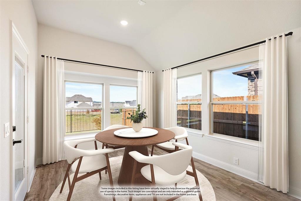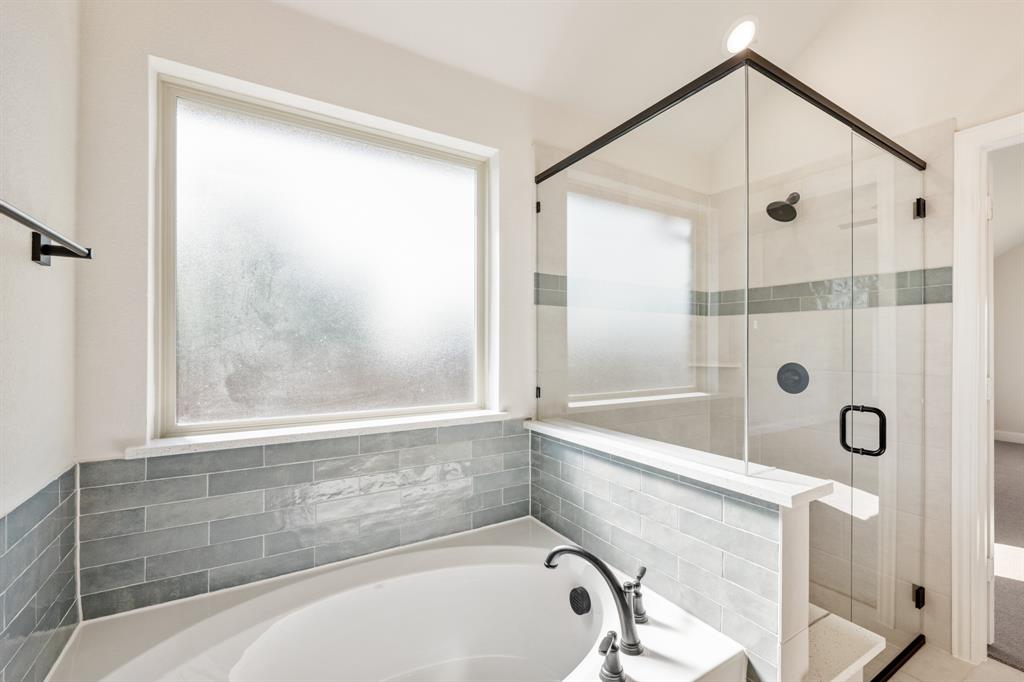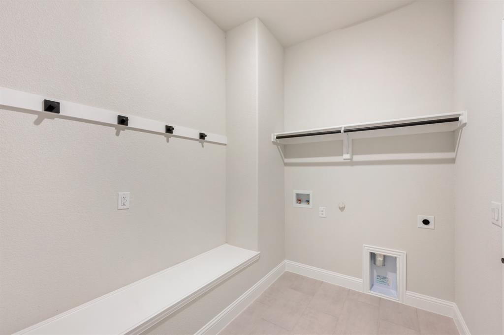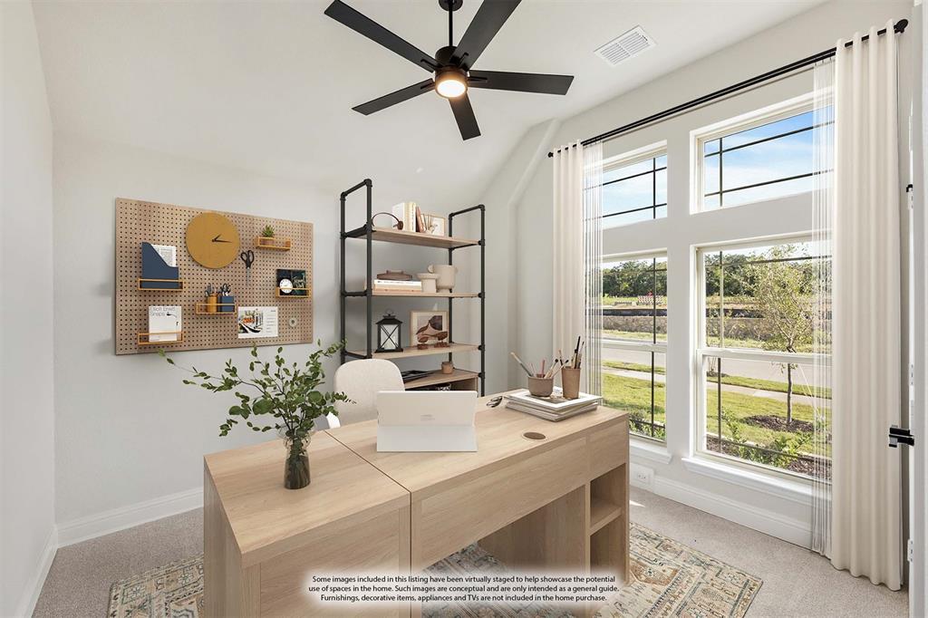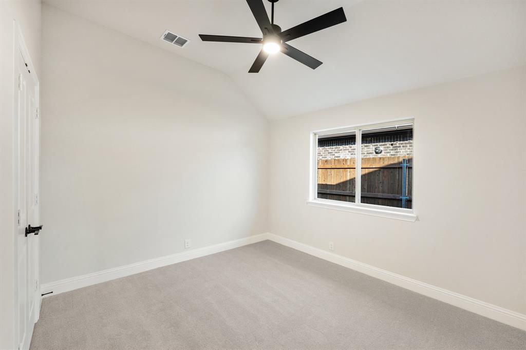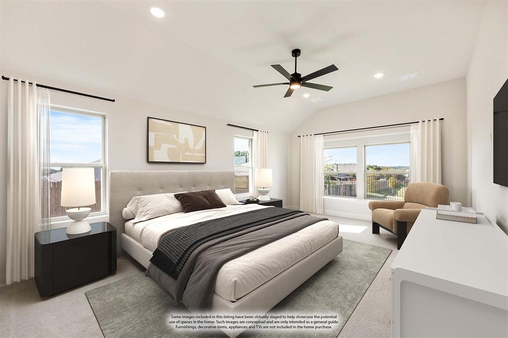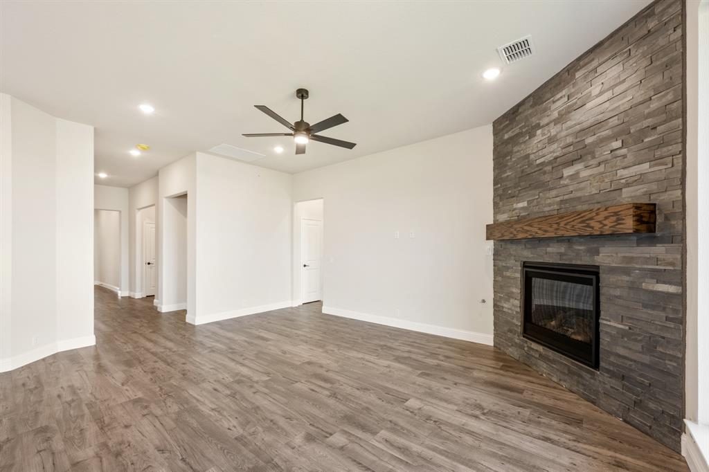 READY NOW! Backing to a greenbelt with a FABULOUS VIEW, this Brand-New Bloomfield Jasmine offers modern luxury, smart design and up to $15,000 in financing incentives. Thoughtfully designed single-story plan includes 3 beds, 2.5 baths, study, mud room and extended 2-car garage to fit Texas-sized trucks. Charming curb appeal with brick and stone exterior, 8’ Mahogany door with glass and iron, cedar garage door, full sod, sprinkler system and professional landscaping. The spacious backyard is ideal for entertaining with a covered patio, greenbelt view and gas drop for grilling. Inside, a transitional warm color palette is accented by vibrant pops of color. Features include a floor-to-ceiling stacked stone direct vent fireplace, laminate wood flooring in main living areas, plush carpet in bedrooms and designer tile in baths. The deluxe kitchen boasts quartz countertops, 4x16 subway backsplash tile, designer wood vent hood and Professional Series built-in stainless appliances including a GAS 5-burner cooktop, double convection ovens and Air Fry feature. Quartz countertops extend to all bathrooms. Additional upgrades include Smart Home features, 2” faux wood blinds, full gutters, 6’ stained wood fence with metal posts and 2 gates, plus wrought iron fencing along the greenbelt for an open yet private feel.
