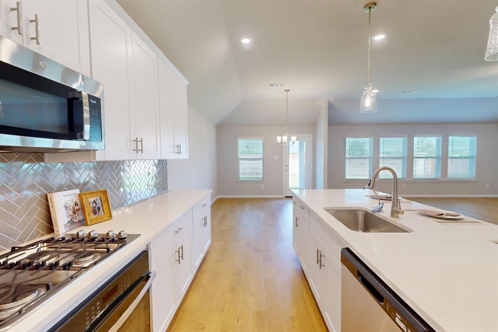 The interior showcases a flowing design that connects living spaces while maintaining privacy where needed. The kitchen serves as the heart of the home with a large island, plus ample counter space and storage options that are perfect for culinary enthusiasts.