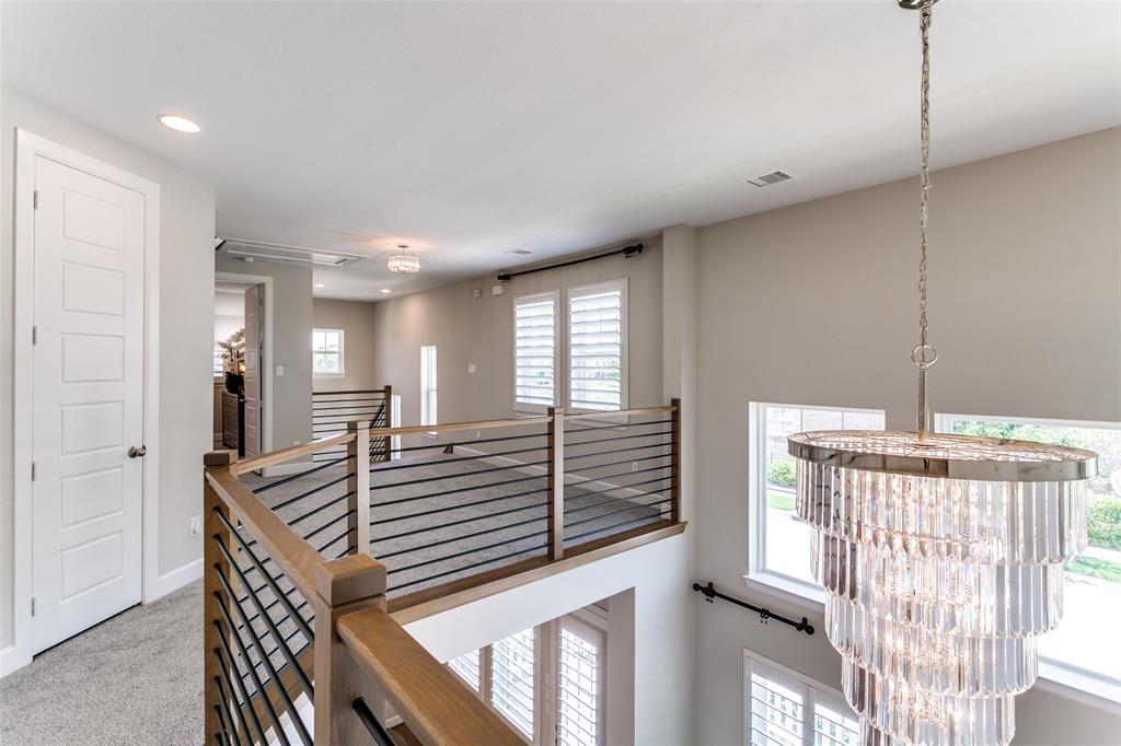 Adjacent to the primary suite is a second living area that opens to the level below, giving the home an airy and connected feel. A catwalk overlooking the living room leads to two additional bedrooms and a full bathroom.