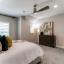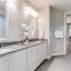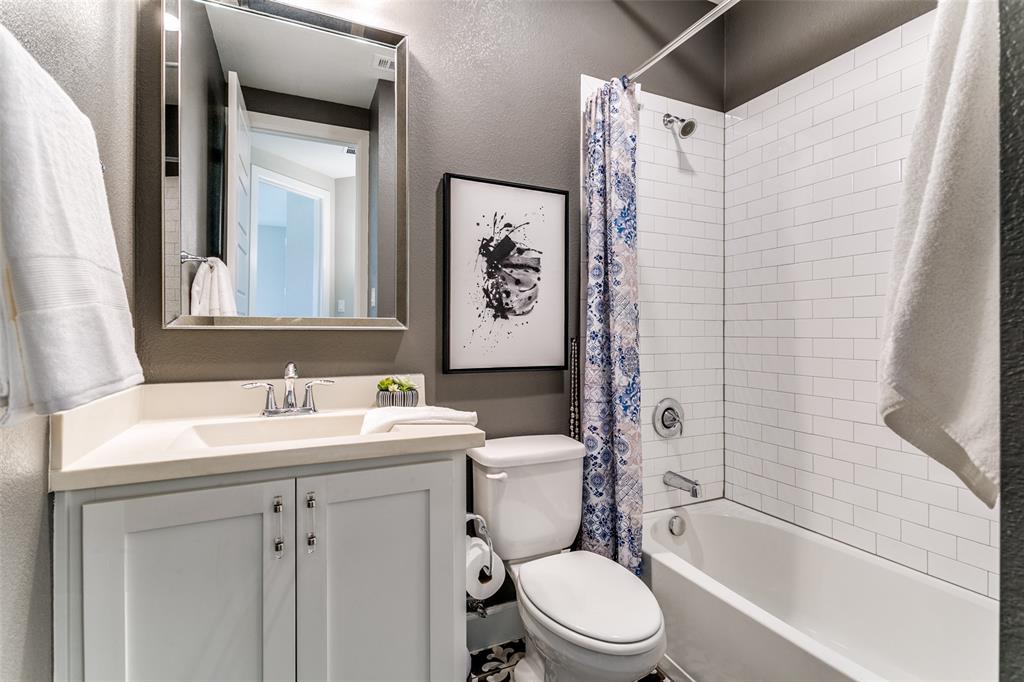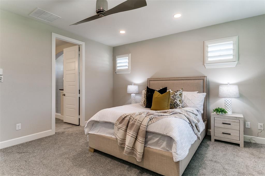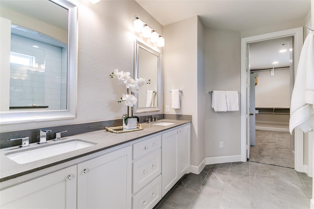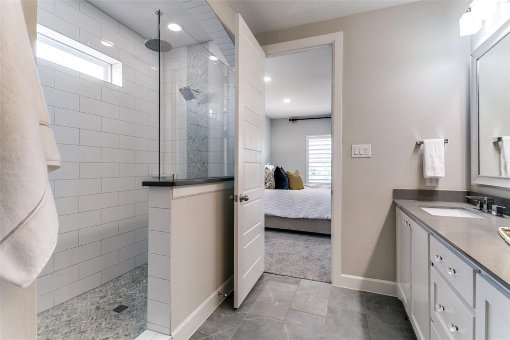 Upstairs, you'll find the spacious primary retreat that overlooks the serene lake and surrounding neighborhood. The luxurious ensuite bath includes a walk-in shower with dual rain showerheads, marble herringbone tile flowing up the wall, and timeless white subway tile for a refined spa-like experience.