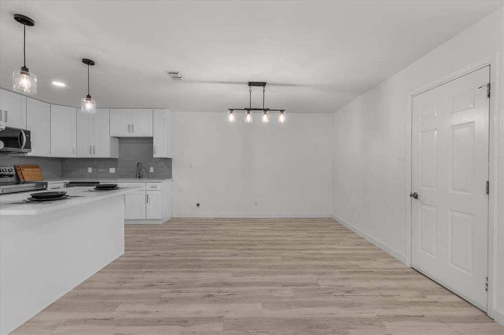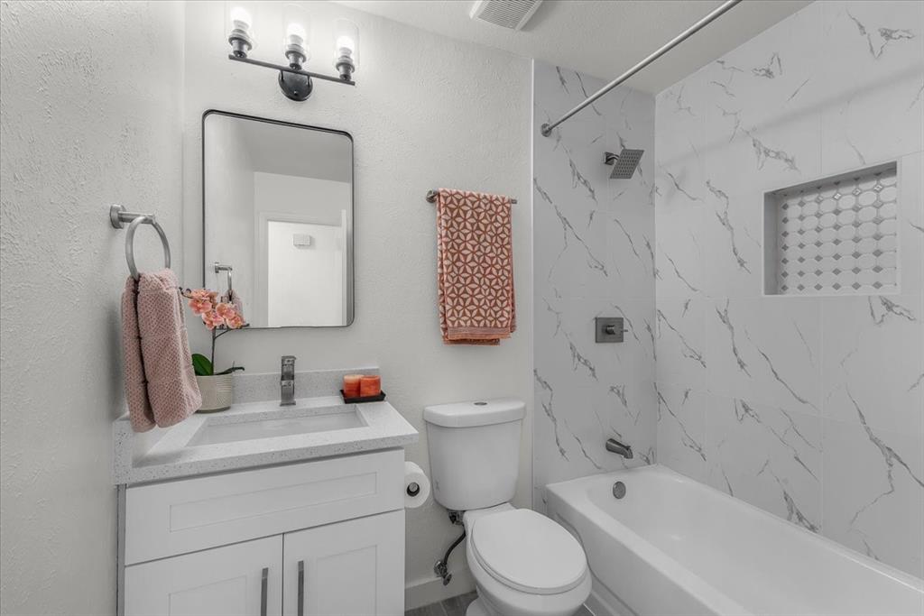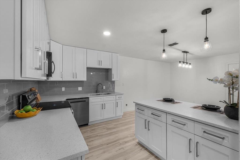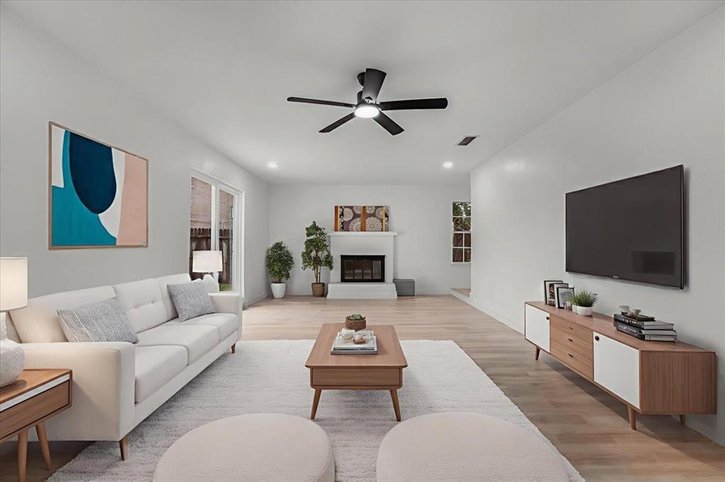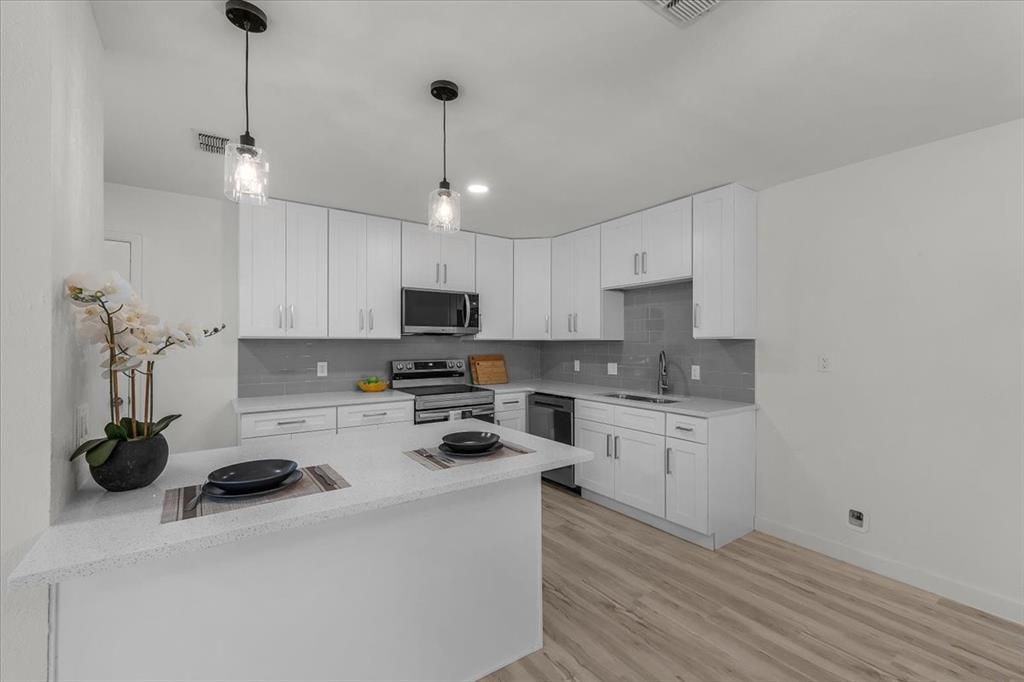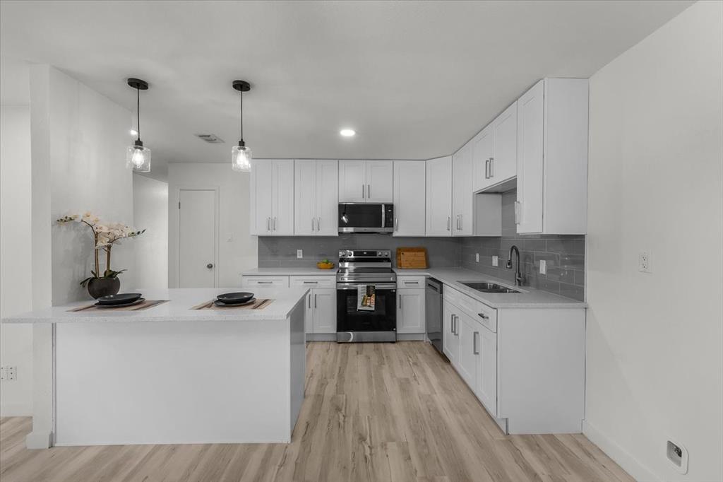 Welcome to this beautifully completely renovated residence, where meticulous modern upgrades elevate every corner! This stunning upgrade sits at a higher elevation with a commanding view of the surroundings in a quiet family friendly neighborhood near a desirable primary school. Upon entering, you'll be greeted by an abundance of natural light that illuminates the generous living space, perfectly complemented by elegant luxury vinyl plank flooring, creating an inviting atmosphere for intimate gatherings around the cozy wood burning fireplace. The open concept layout effortlessly connects the formal dining area to the modern kitchen, which dazzles with stunning high quality quartz countertops, brand-new cabinets and brand-new stainless-steel appliances. The kitchen island doubles as a charming breakfast nook, enhancing the home's allure. This thoughtfully designed space is perfect for today’s lifestyle providing you with amenities such as new ceiling fans with remotes, dimmable recessed lights with an option to switch between warm and cool daylight settings. The bathrooms have been fully renovated with all new fixtures and high-quality upgrades such as glass shower door and new vanities. Each bedroom features an efficient layout and generous closet space, offering a harmonious blend of comfort and style. Discover the charm of this fully updated home! An adjacent duplex property with the same mirror layout is also available for sale (as a separate listing) that can be purchased together.