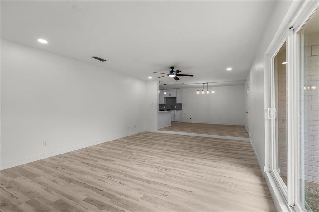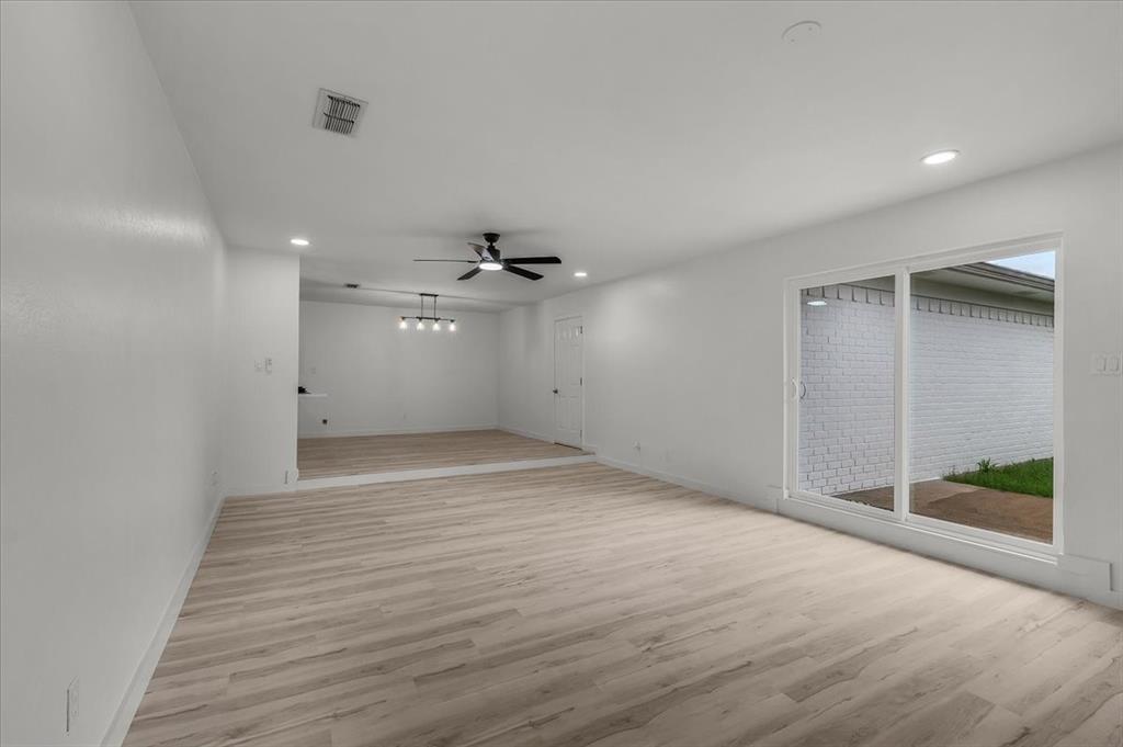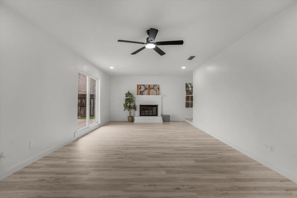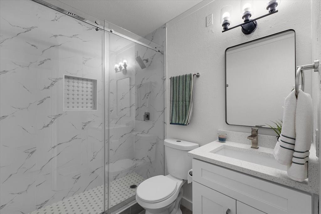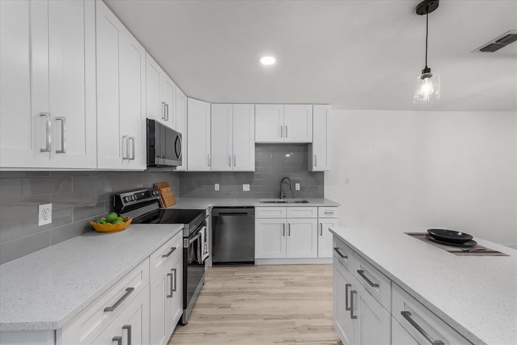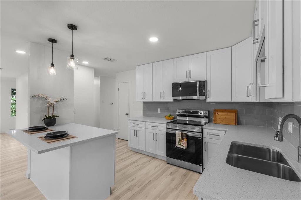 Welcome to this beautifully completely renovated residence, where meticulous modern upgrades elevate every corner! This stunning upgrade sits at a higher elevation with a commanding view of the surroundings in a quiet family friendly neighborhood near a desirable primary school. Upon entering, you'll be greeted by an abundance of natural light that illuminates the generous living space, perfectly complemented by elegant luxury vinyl plank flooring, creating an inviting atmosphere for intimate gatherings around the cozy wood burning fireplace. The open concept layout effortlessly connects the formal dining area to the modern kitchen, which dazzles with stunning high quality quartz countertops, brand-new cabinets and brand-new stainless-steel appliances. The kitchen island doubles as a charming breakfast nook, enhancing the home's allure. This thoughtfully designed space is perfect for today’s lifestyle providing you with amenities such as new ceiling fans with remotes, dimmable recessed lights with an option to switch between warm and cool daylight settings. The bathrooms have been fully renovated with all new fixtures and high-quality upgrades such as glass shower door and new vanities. Each bedroom features an efficient layout and generous closet space, offering a harmonious blend of comfort and style. Discover the charm of this fully updated home! An adjacent duplex property with the same mirror layout is also available for sale (as a separate listing) that can be purchased together.