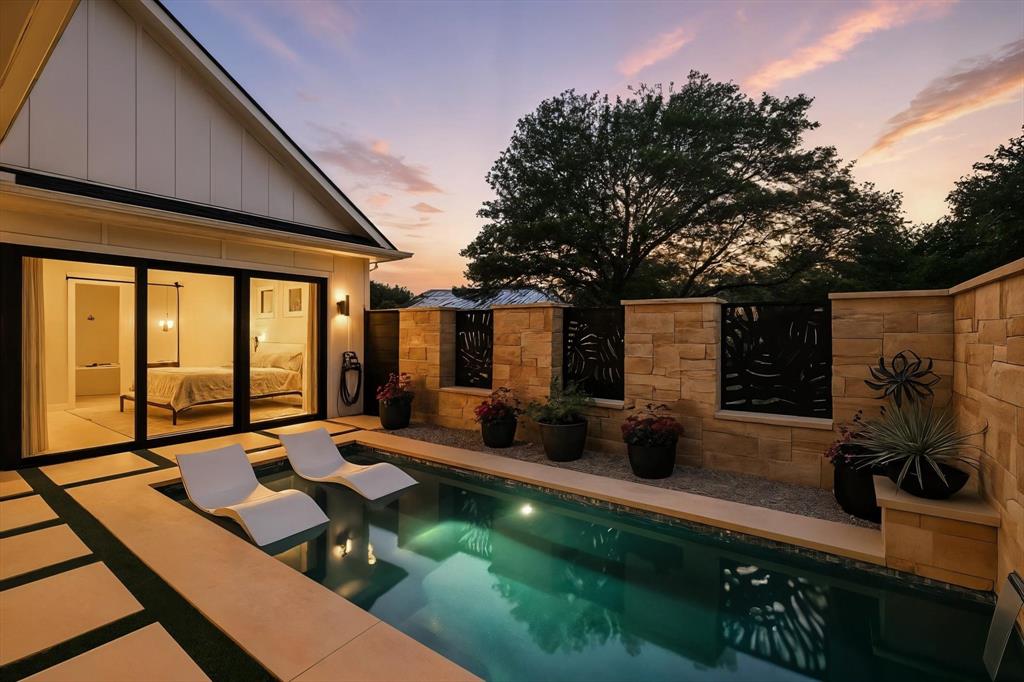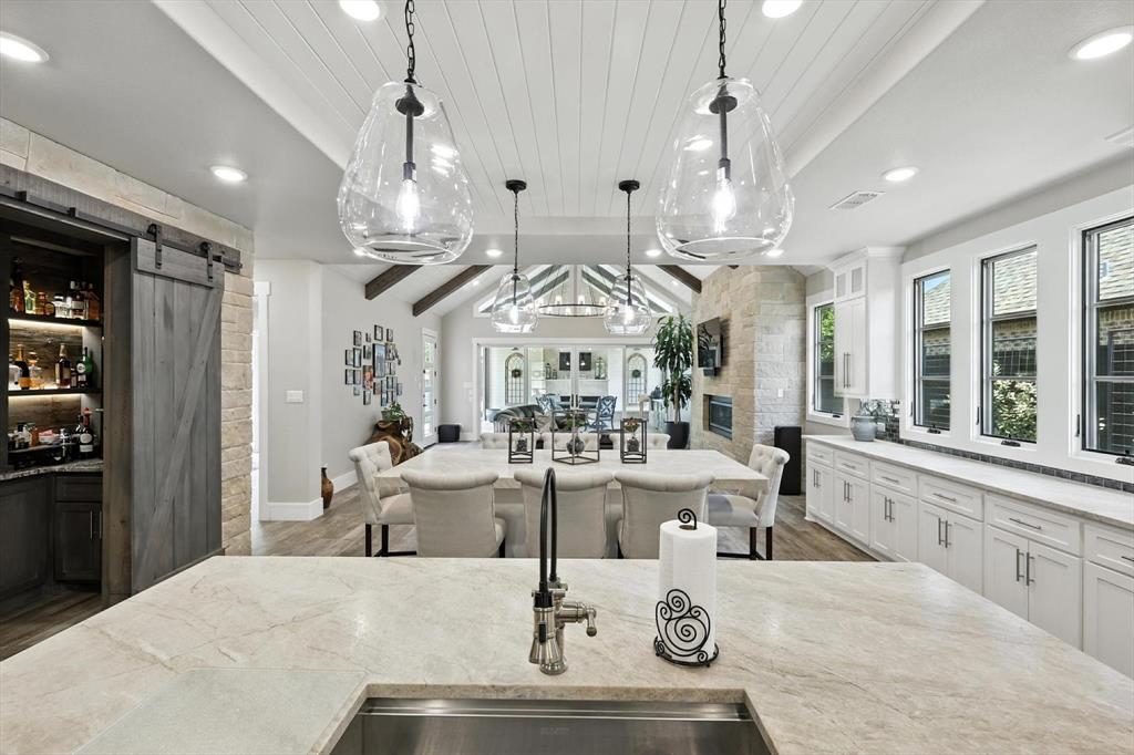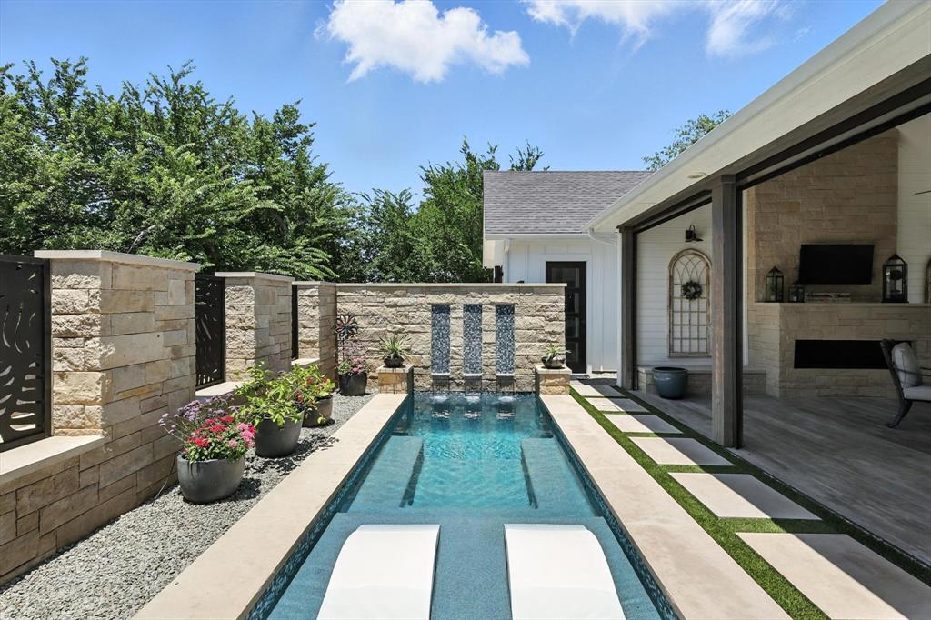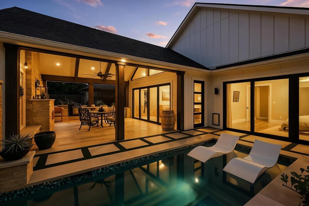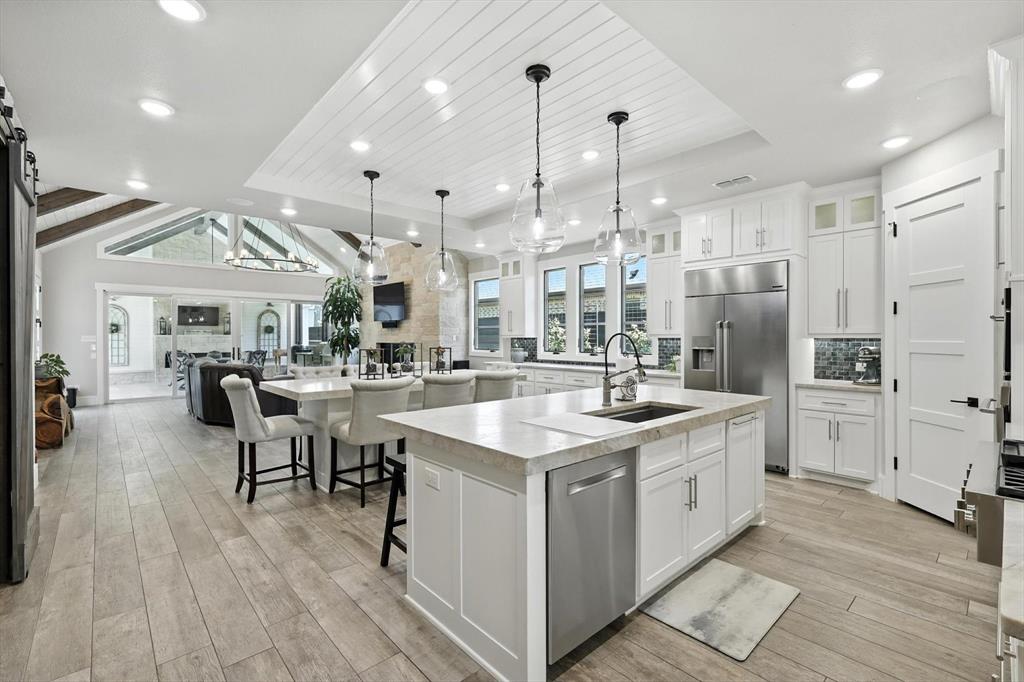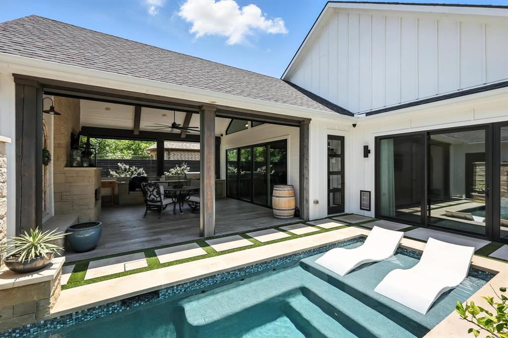 Step inside to find a chef-style kitchen with double islands, a wine bar, and seamless flow into the family room and dining area. Sliding glass doors lead to a covered patio with an outdoor kitchen and a beautifully designed custom gunite spool featuring a tanning ledge, heater, and chiller for year-round comfort. The private backyard also includes a gas firepit and a rear-entry detached garage, maximizing both curb appeal and privacy.
