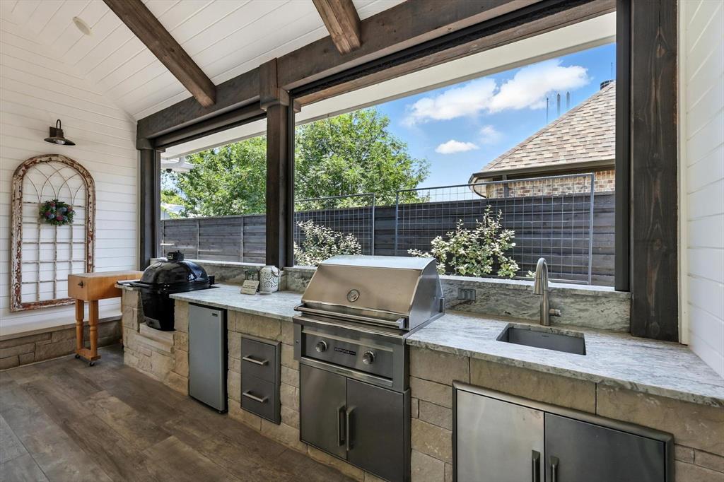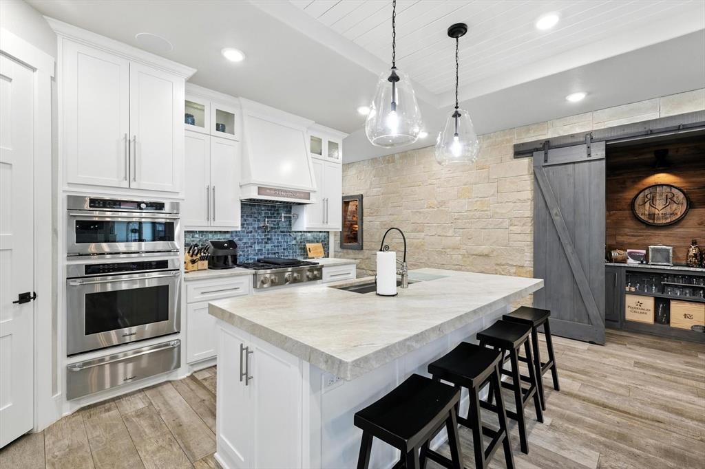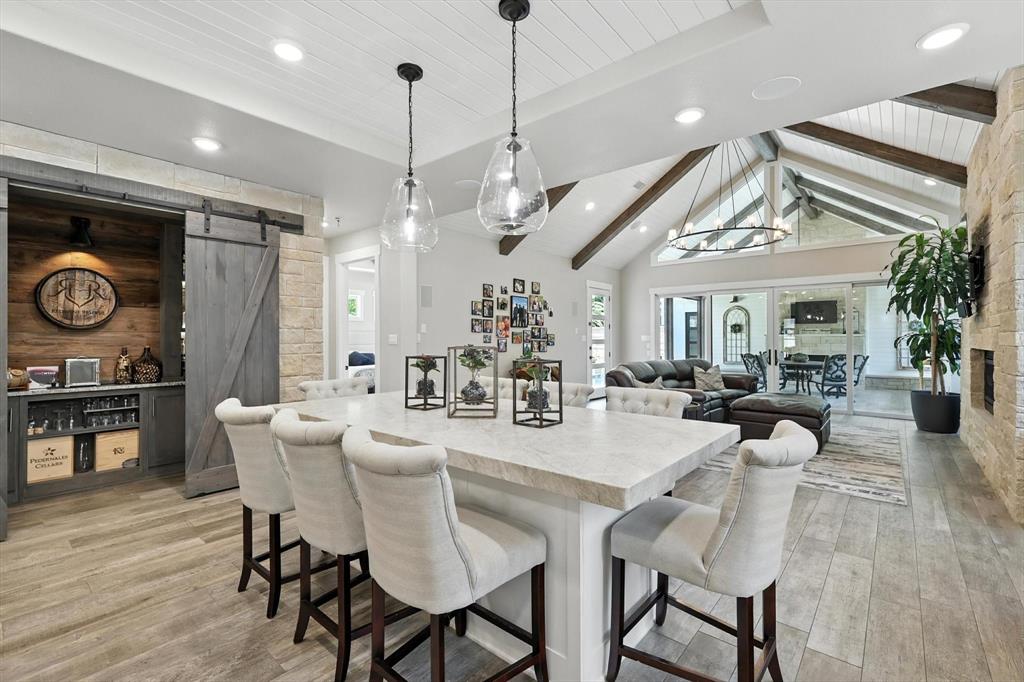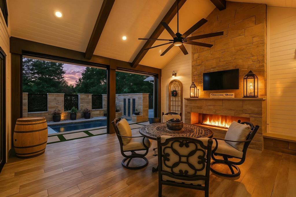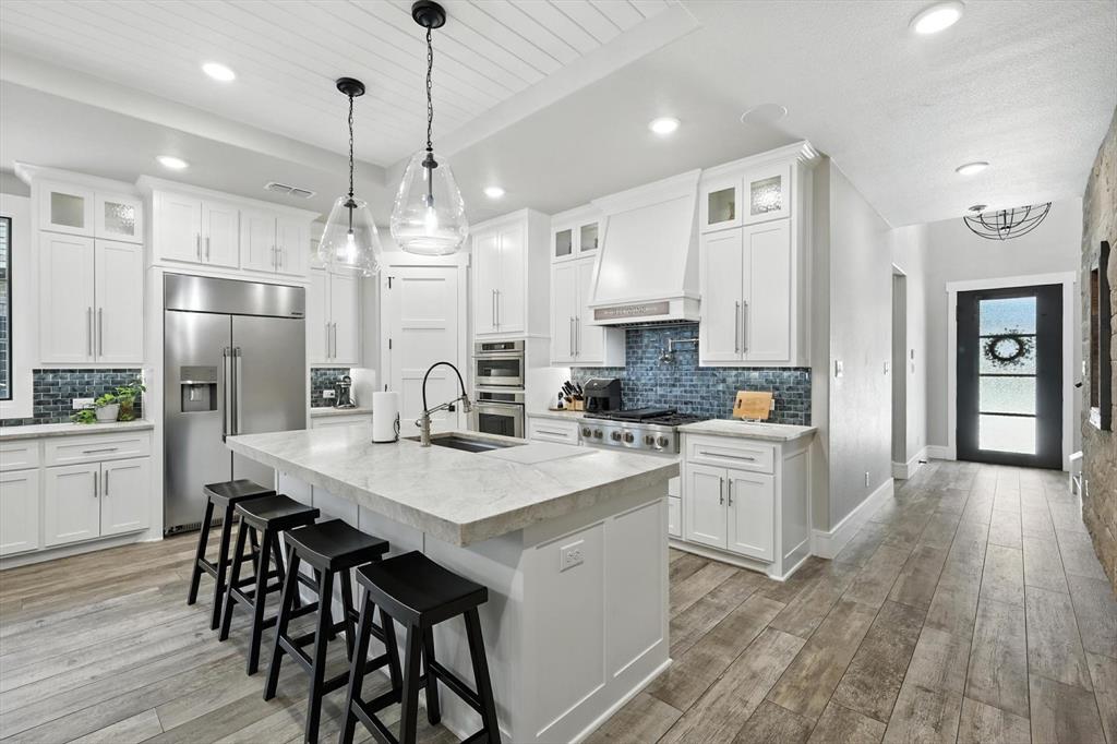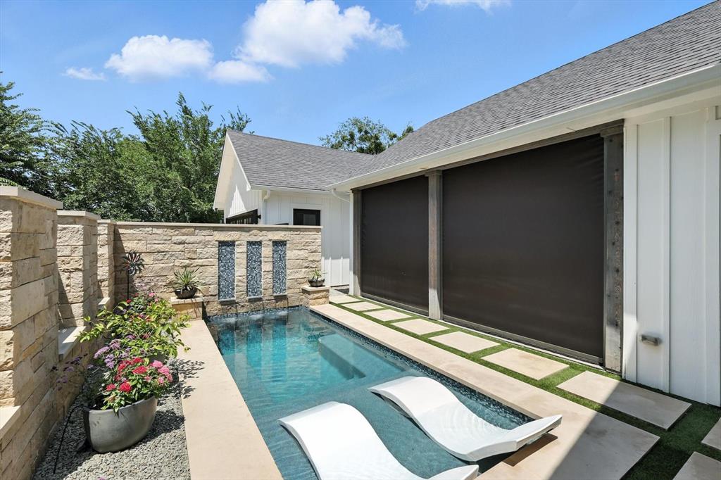 Step inside to find a chef-style kitchen with double islands, a wine bar, and seamless flow into the family room and dining area. Sliding glass doors lead to a covered patio with an outdoor kitchen and a beautifully designed custom gunite spool featuring a tanning ledge, heater, and chiller for year-round comfort. The private backyard also includes a gas firepit and a rear-entry detached garage, maximizing both curb appeal and privacy.