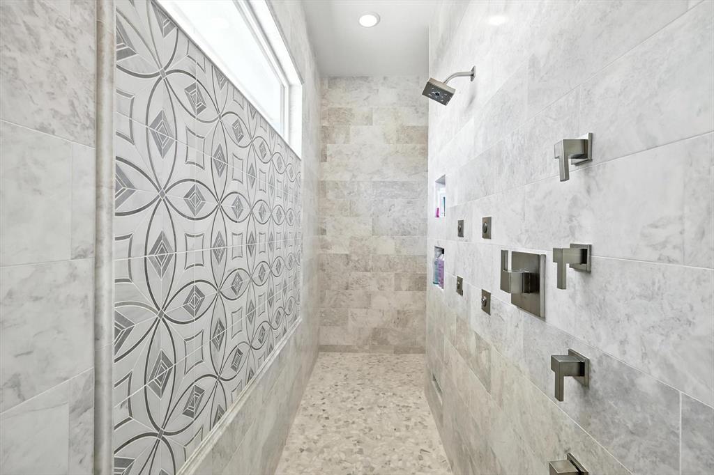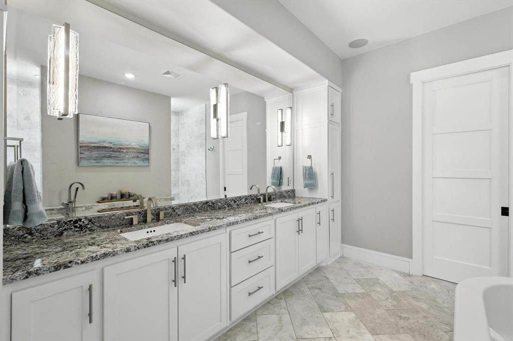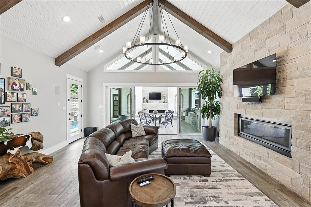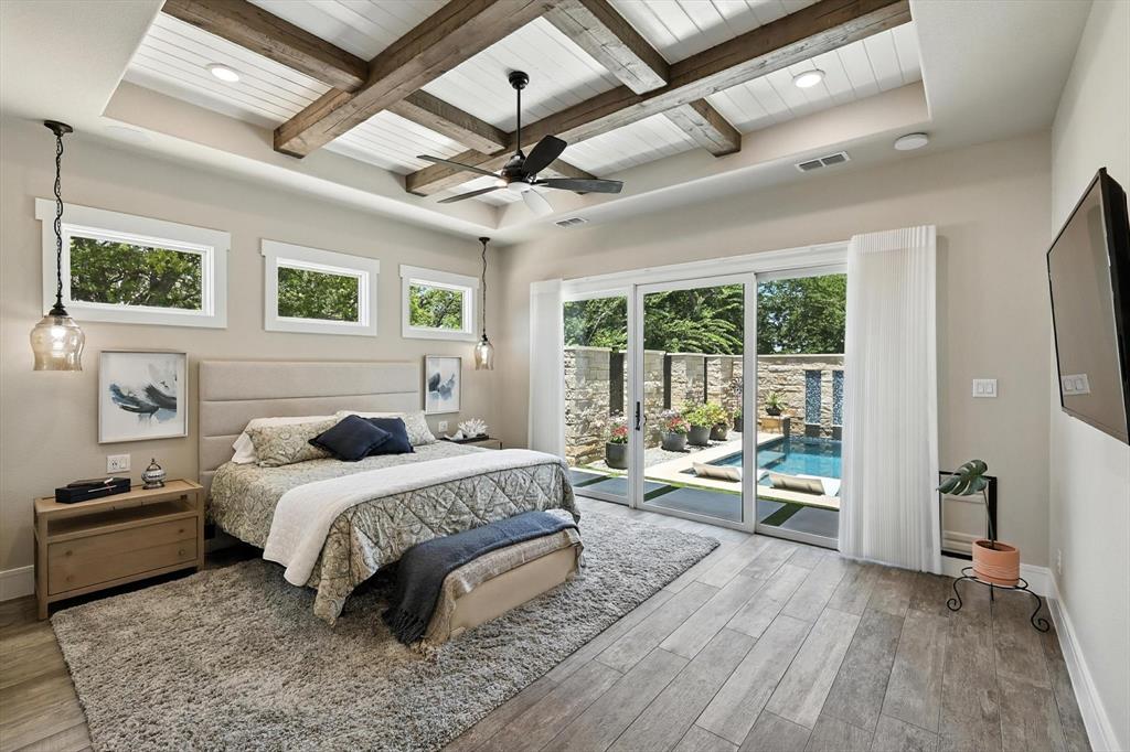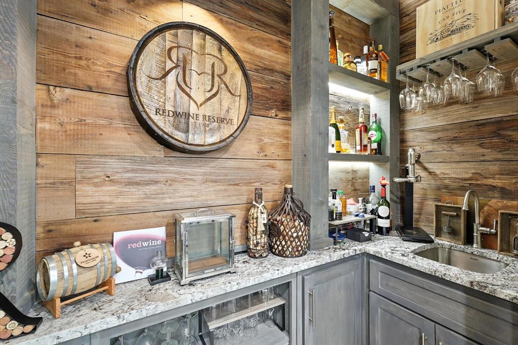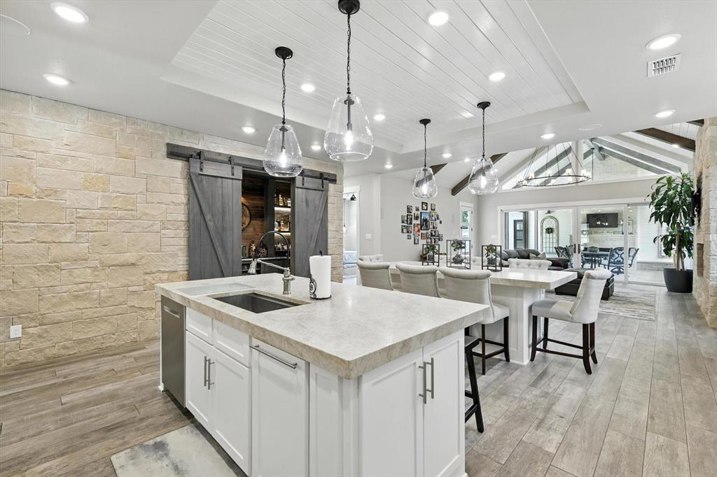 Step inside to find a chef-style kitchen with double islands, a wine bar, and seamless flow into the family room and dining area. Sliding glass doors lead to a covered patio with an outdoor kitchen and a beautifully designed custom gunite spool featuring a tanning ledge, heater, and chiller for year-round comfort. The private backyard also includes a gas firepit and a rear-entry detached garage, maximizing both curb appeal and privacy.