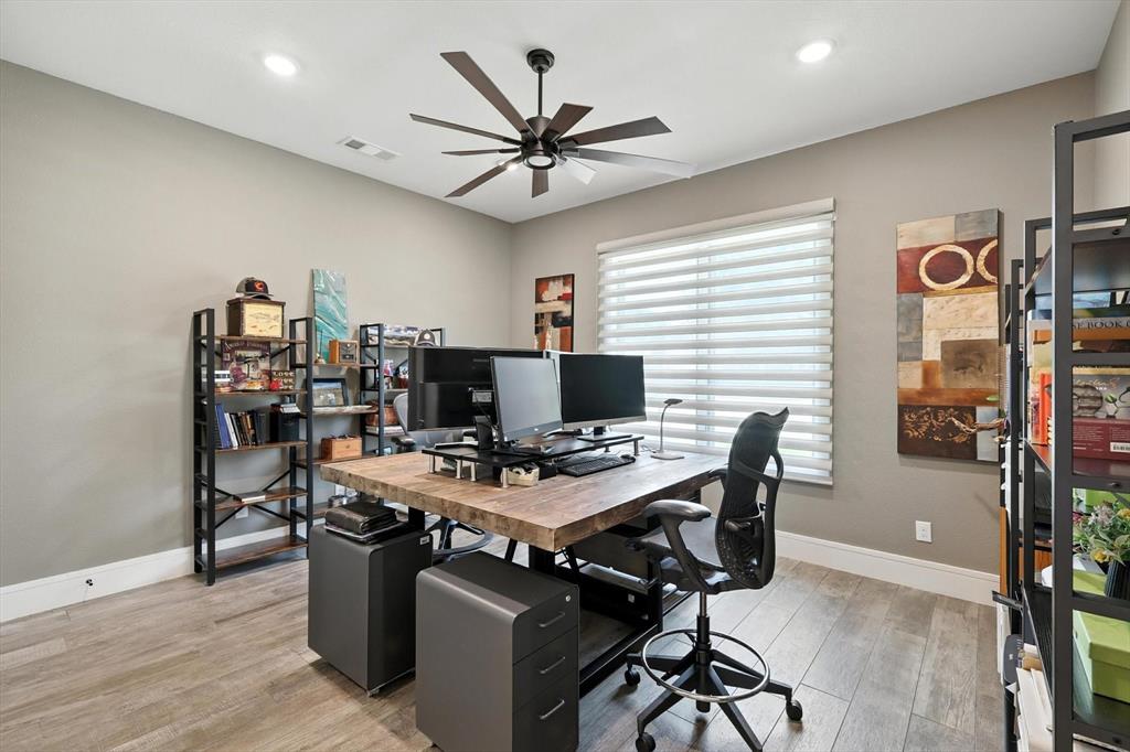 The functional floorplan includes two bedrooms downstairs—including a generous primary suite—plus an additional downstairs bedroom currently used as a home office. Upstairs offers two more bedrooms and a versatile game room for work, play, or guests.