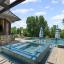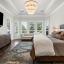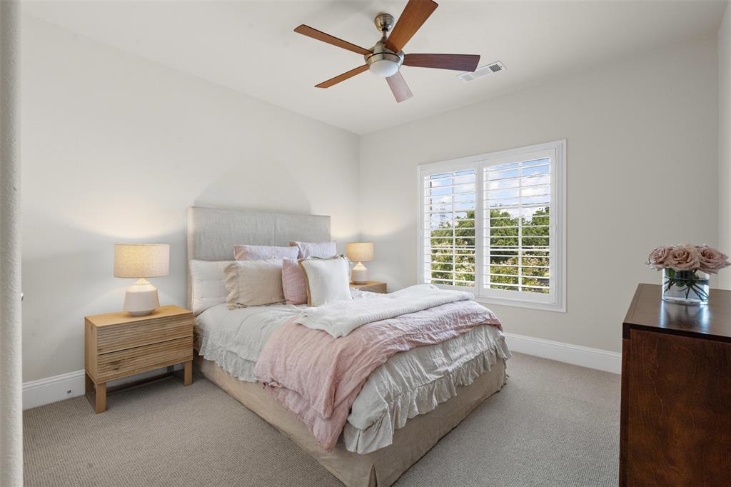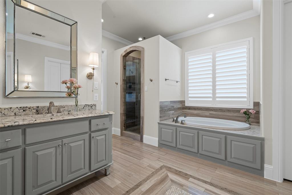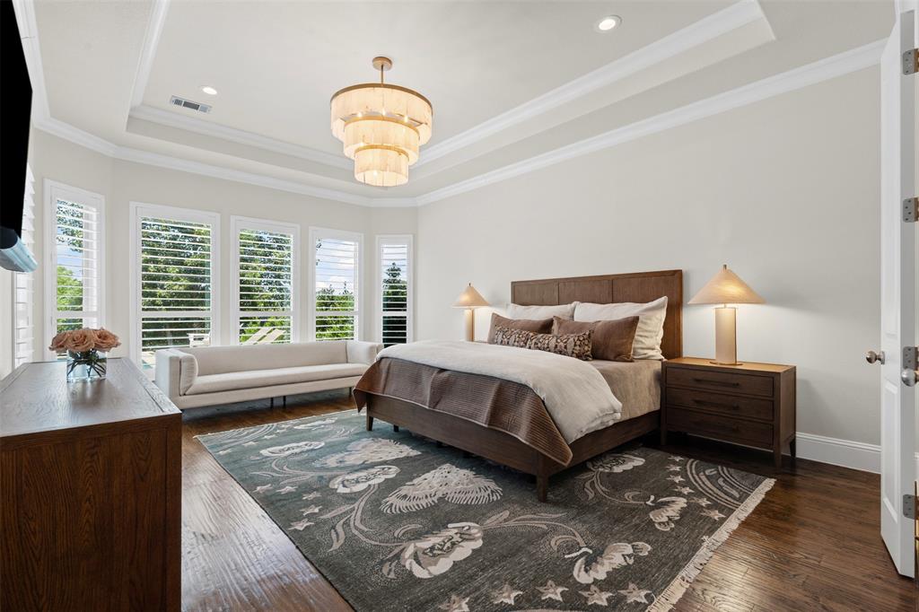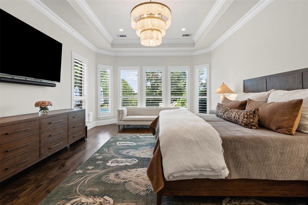 The luxurious primary suite features a sitting area with designer lighting and patio views. The bath is a true spa retreat with dual vanities, garden tub with inlaid tile floor, and a custom jewelry armoire.