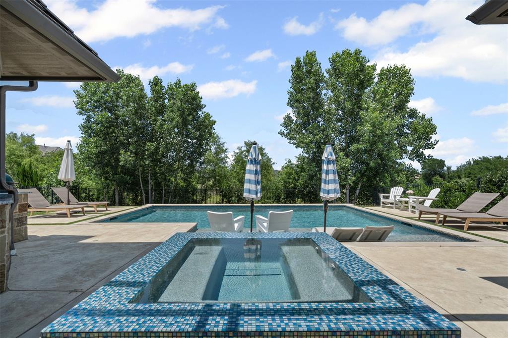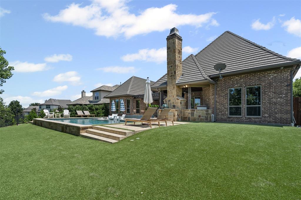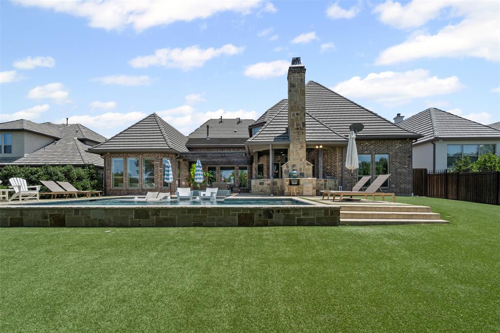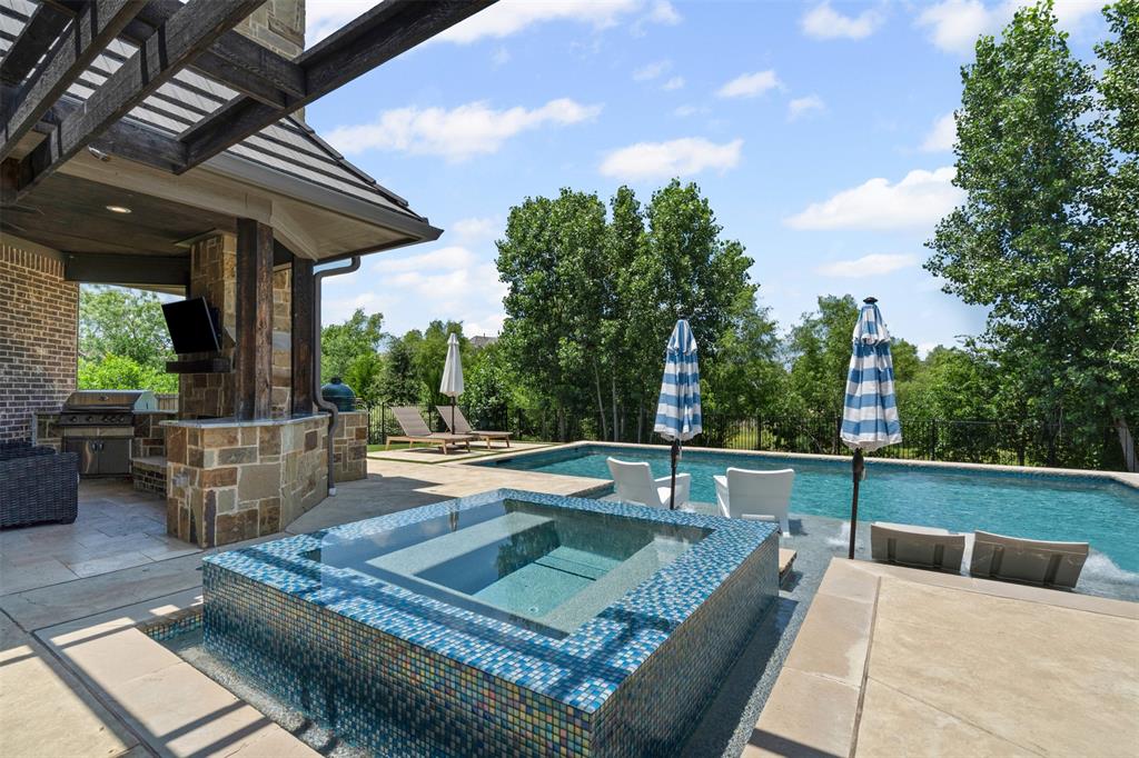 Enjoy year-round outdoor living with a covered patio, built-in grill, fireplace, pergola, mosaic-tiled pool and jacuzzi, and multiple seating areas all surrounded by new turf.