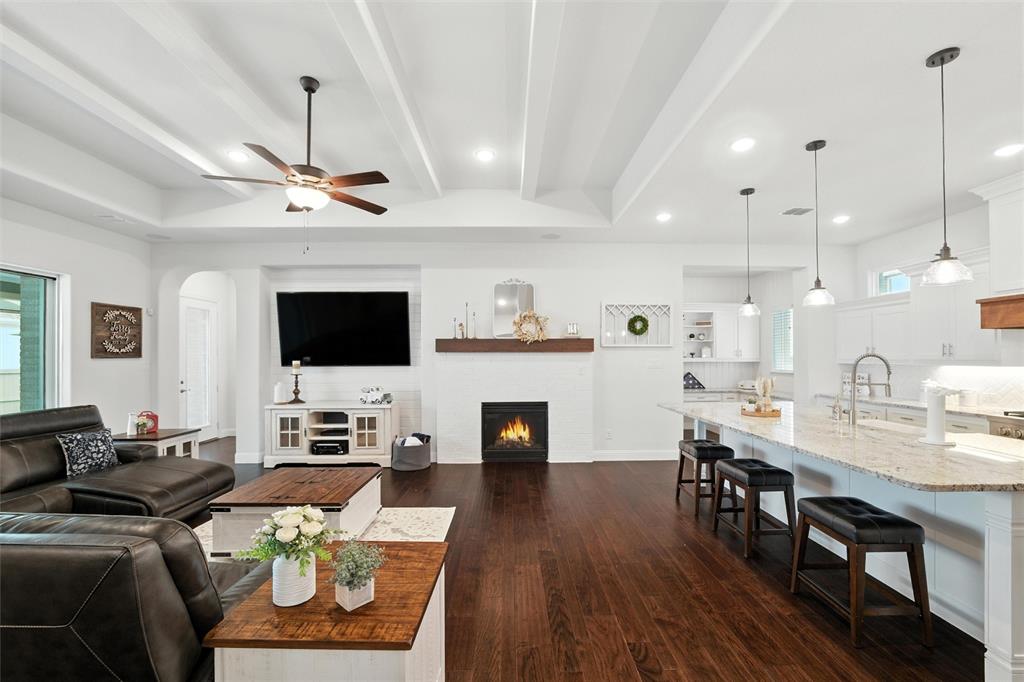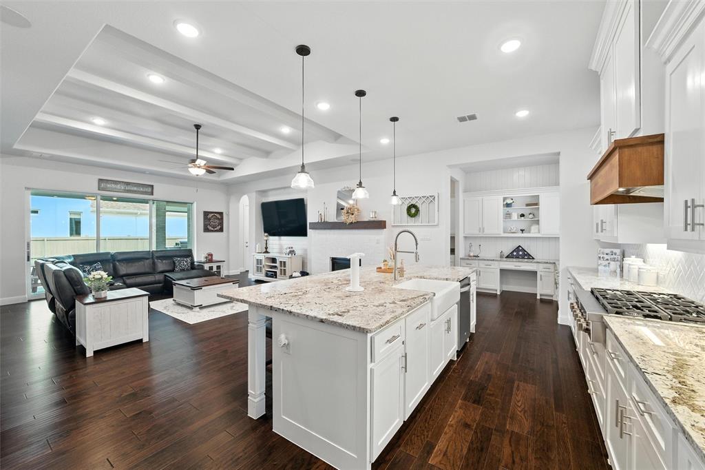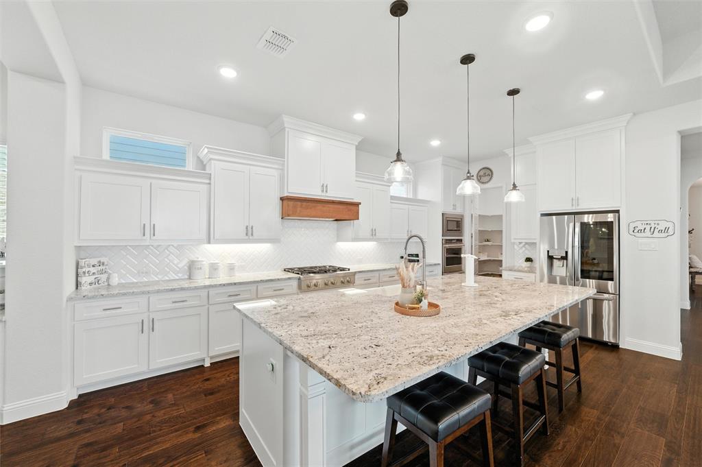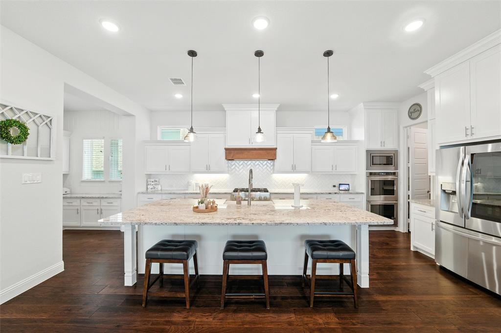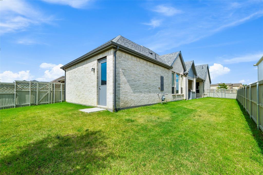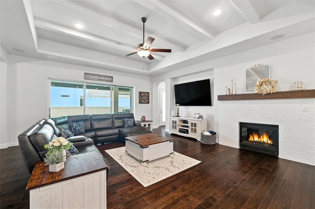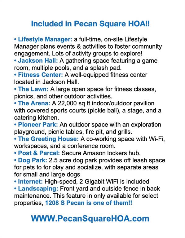 Stunning Drees Single Story Home on 70' Lot! Property eligible for Special F1nancing! 1% Rate Buy Down for 1 year with our preferred lender OR a 4.25% VA assumable loan. Beautiful drive up to this Craftsman-style brick home with a covered porch and Plantation Shutters across the front windows. Inside you are greeted by warm wood floors that extends thru the main living areas. Right of the Foyer is light-filled BdRm 4, Home Office, or 2nd Lv Area featuring ceiling fan and double closet. The large Living area seamlessly opens to a modern Kitchen featuring upgraded SS double ovens, microwave, dishwasher, 5 burner gas cooktop, upgraded 3cm granite counters, chevron pattern backsplash, 42in cabinets, a home office area & huge island with breakfast bar. LvRm has cozy fireplace with cedar mantle, high ceiling with accent beams, surround sound speakers, custom accent paneling, and triple sliding glass door to extended covered patio. Dining Area is open to the LvRm and has a custom butler pantry with built in bottle display. Large Primary Suite has wall of windows, cathedral ceiling, and a spa-like BathRm with dual vanities, huge shower, soaking tub, coffee bar, and custom WIC. BdRms 2 and 3 both have their own Ensuites Baths! Step out back to the outdoor living area with built in grill, gas start fireplace, custom sun shades, and flatscreen TV. The fenced yard wraps from the side patio all the way to the back and offers lots of grassy space for the fur babies to play! Split 3 car garage with double car & extended single, has 10.4 ceiling with extra tall door for lifted trucks, & mini split climate controlled. This thoughtfully designed home offers a perfect blend of elegance, energy efficiency, & practicality. Pecan Square is an amazing community, HOA includes community center, fitness center, 3 pools, pickle & basketball courts, planned community activities, dog park, front yard maintenance, & 2 Gig internet! Home under builder warranty! New Elm School in neighborhood!