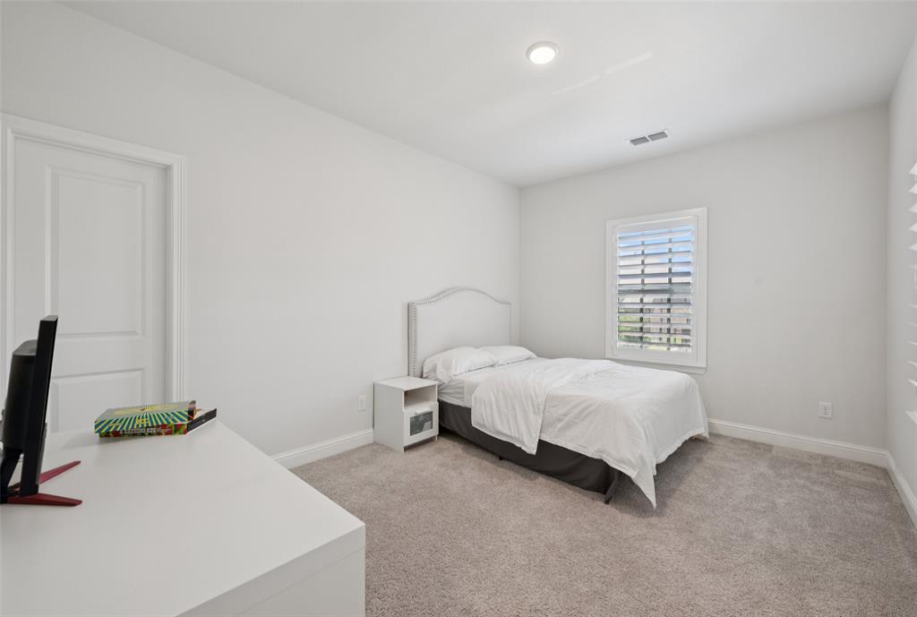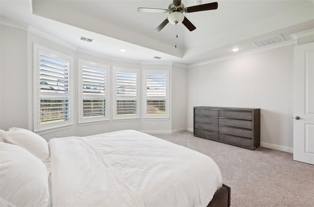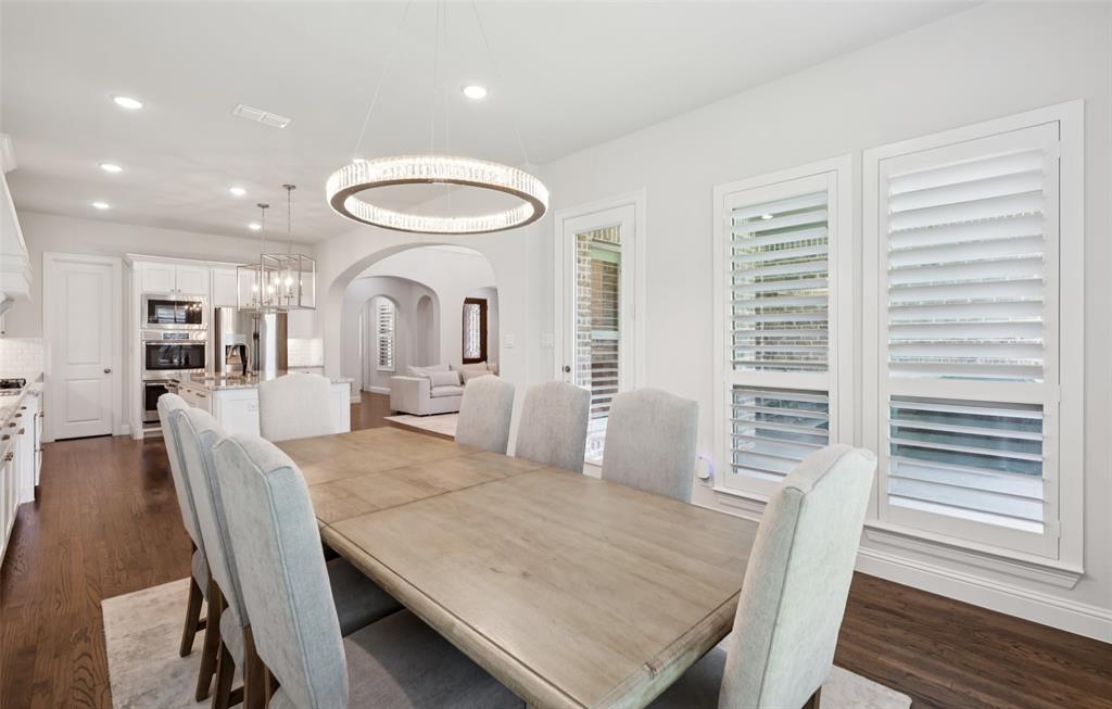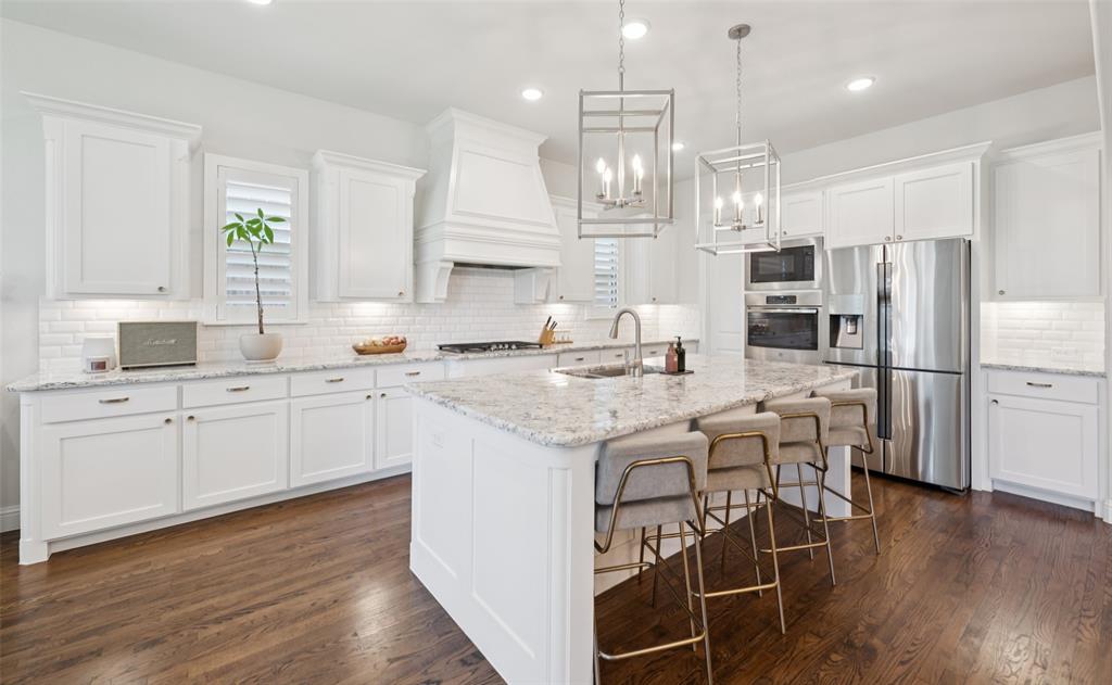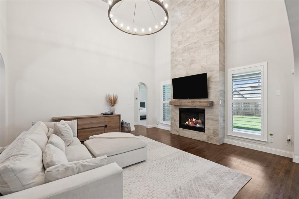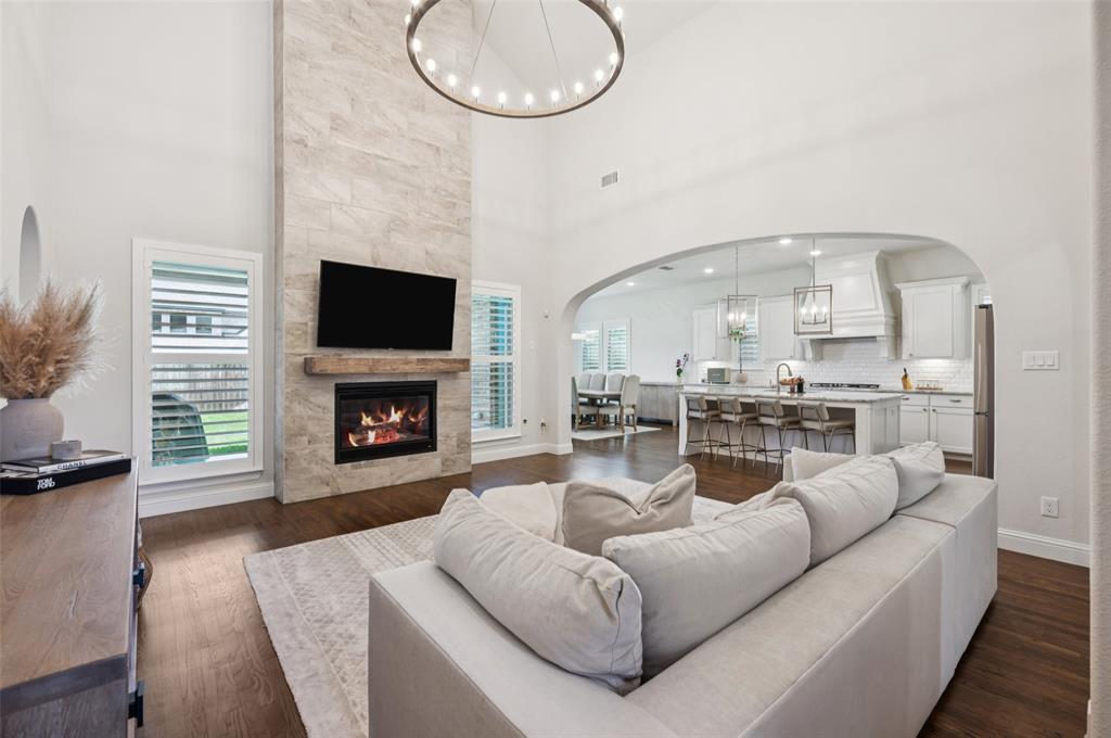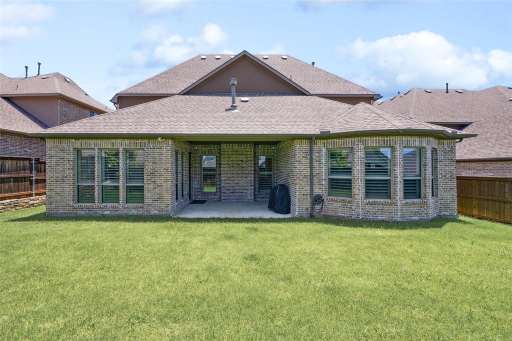 Welcome to this beautifully designed Darling Home in Prosper’s prestigious Lakewood community. From the moment you arrive, you’re greeted by a charming outdoor courtyard—a serene space perfect for morning coffee or evening relaxation. Step inside to discover rich wood flooring throughout the main living areas, plantation shutters, and elegant decorative lighting that elevate every room. The living room impresses with soaring ceilings and a cozy gas fireplace, and flows seamlessly into the chef’s kitchen featuring a large island with seating, crisp white cabinetry, granite countertops, a gas cooktop, and double ovens. The open-concept layout continues into the spacious dining area—ideal for entertaining. The primary suite, located on the main floor, offers a peaceful retreat with a bay window, vaulted ceiling, and crown molding. The spa-like bath includes a soaker tub, oversized shower, and a large walk-in closet that connects directly to the laundry room for added convenience. Also downstairs is a private home office, a half bathroom, and a guest bedroom with an ensuite bath—perfect for visitors or multigenerational living. Upstairs, enjoy a large game room with built-in cabinetry and a beverage fridge, a separate media room, two oversized secondary bedrooms, and two full bathrooms plus a half bath—plenty of space for everyone. Step into the backyard to find a spacious covered patio and freshly stained fence, ideal for outdoor entertaining or simply enjoying the quiet surroundings. Lakewood offers resort-style amenities including a sparkling pool, clubhouse, park, scenic pond, and tree-lined walking trails. Conveniently located near shopping, dining, the PGA Headquarters, and zoned to highly acclaimed Prosper ISD schools, including Walnut Grove High School. This home combines refined design, flexible living spaces, and an unbeatable location—don’t miss the opportunity to make it yours!