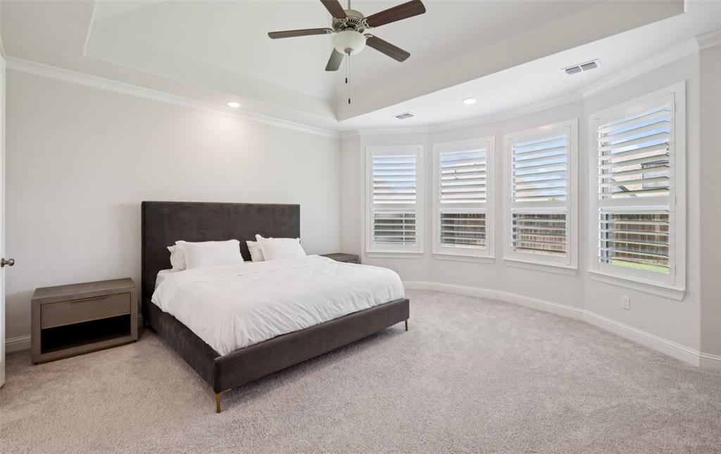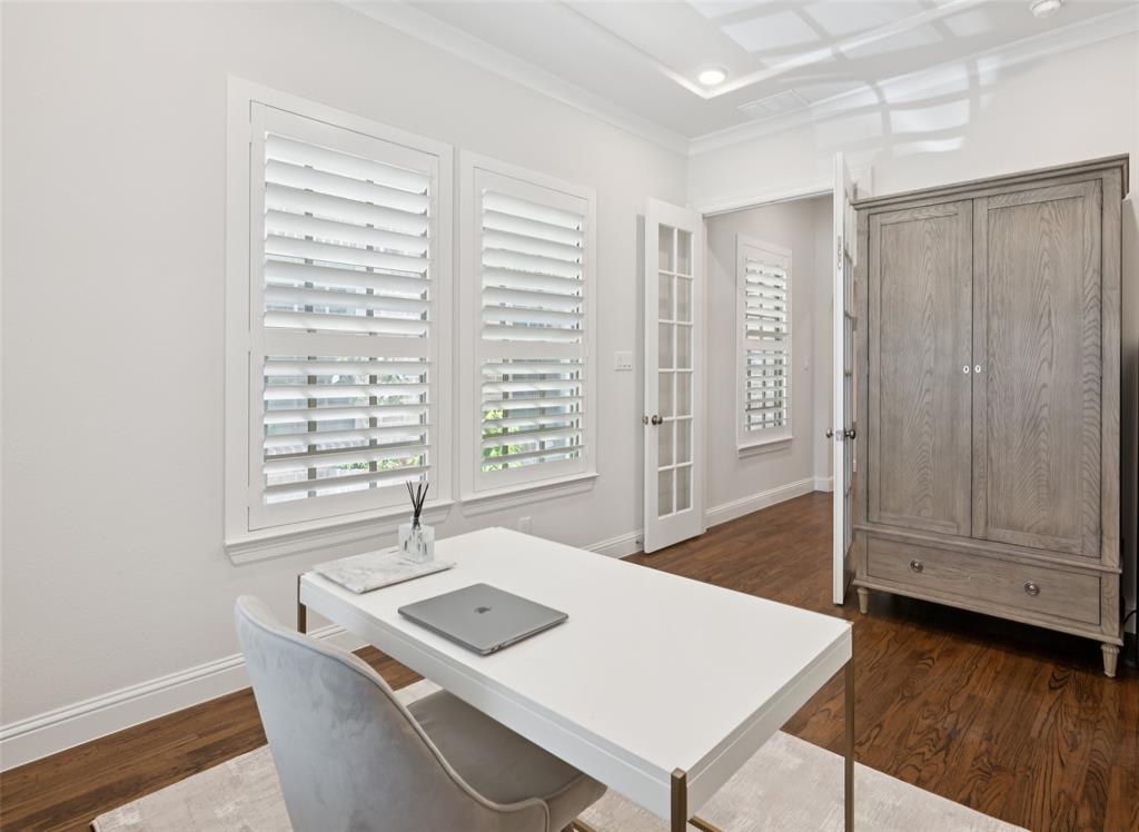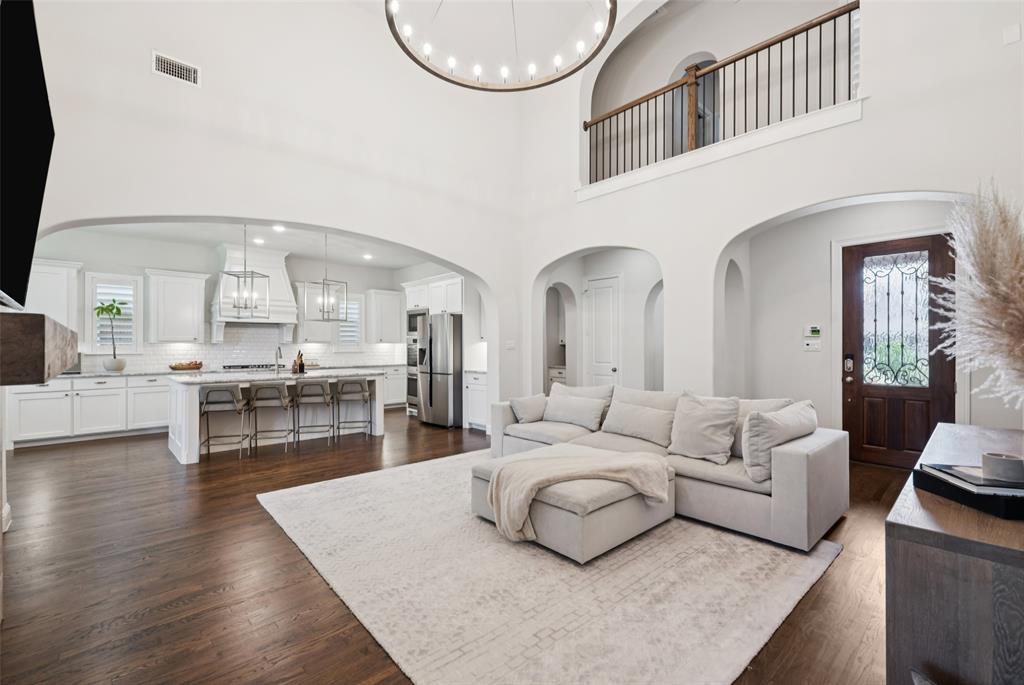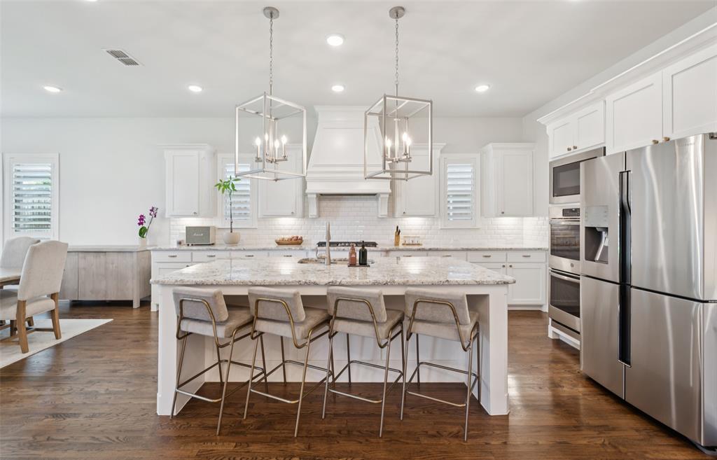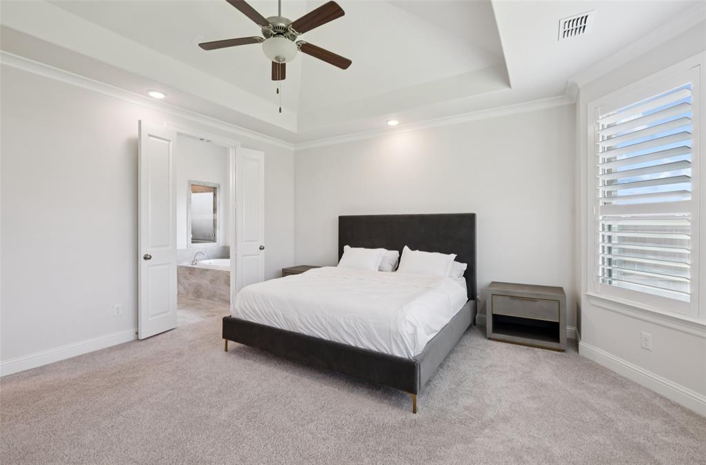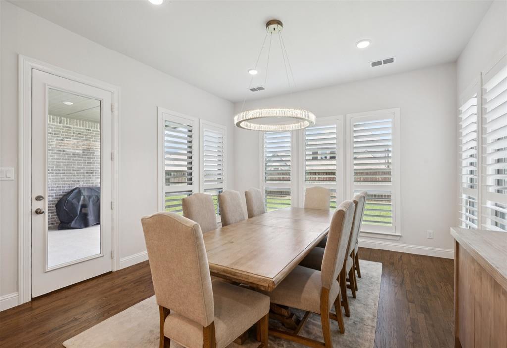 Welcome to this beautifully designed Darling Home in Prosper’s prestigious Lakewood community. From the moment you arrive, you’re greeted by a charming outdoor courtyard—a serene space perfect for morning coffee or evening relaxation. Step inside to discover rich wood flooring throughout the main living areas, plantation shutters, and elegant decorative lighting that elevate every room. The living room impresses with soaring ceilings and a cozy gas fireplace, and flows seamlessly into the chef’s kitchen featuring a large island with seating, crisp white cabinetry, granite countertops, a gas cooktop, and double ovens. The open-concept layout continues into the spacious dining area—ideal for entertaining. The primary suite, located on the main floor, offers a peaceful retreat with a bay window, vaulted ceiling, and crown molding. The spa-like bath includes a soaker tub, oversized shower, and a large walk-in closet that connects directly to the laundry room for added convenience. Also downstairs is a private home office, a half bathroom, and a guest bedroom with an ensuite bath—perfect for visitors or multigenerational living. Upstairs, enjoy a large game room with built-in cabinetry and a beverage fridge, a separate media room, two oversized secondary bedrooms, and two full bathrooms plus a half bath—plenty of space for everyone. Step into the backyard to find a spacious covered patio and freshly stained fence, ideal for outdoor entertaining or simply enjoying the quiet surroundings. Lakewood offers resort-style amenities including a sparkling pool, clubhouse, park, scenic pond, and tree-lined walking trails. Conveniently located near shopping, dining, the PGA Headquarters, and zoned to highly acclaimed Prosper ISD schools, including Walnut Grove High School. This home combines refined design, flexible living spaces, and an unbeatable location—don’t miss the opportunity to make it yours!