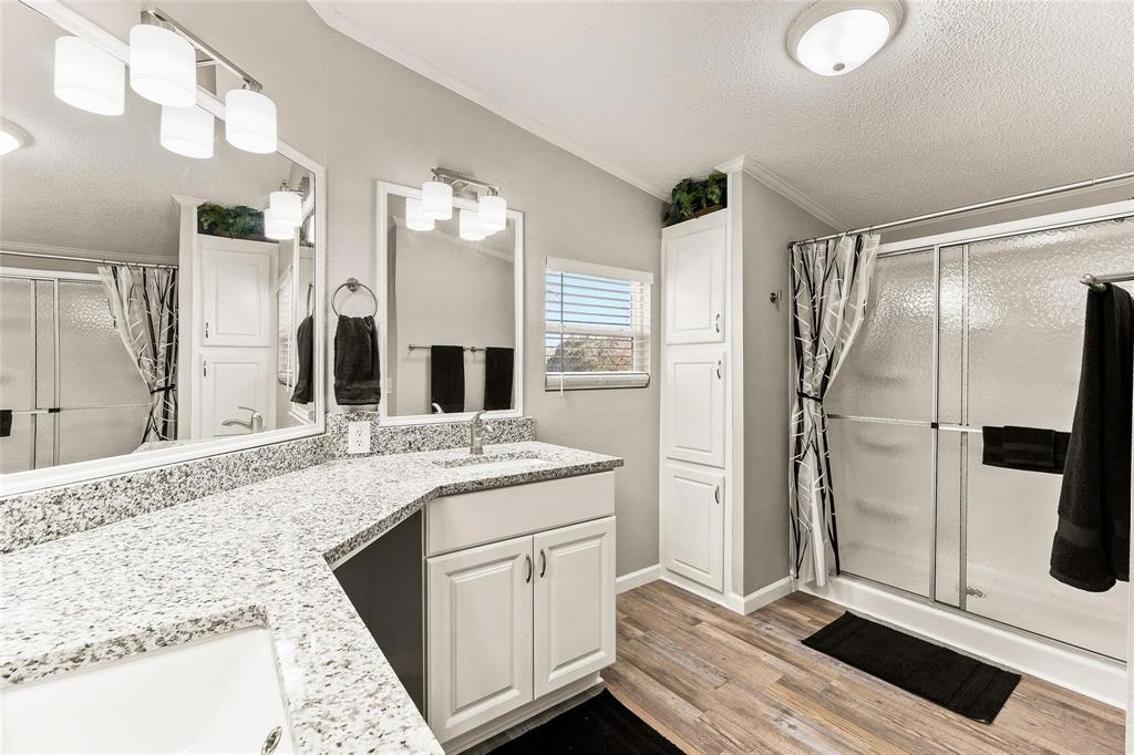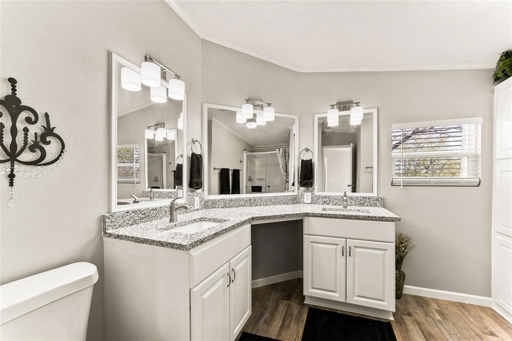 The renovated master bathroom offers dual vanities with granite counters and a spa-like atmosphere.