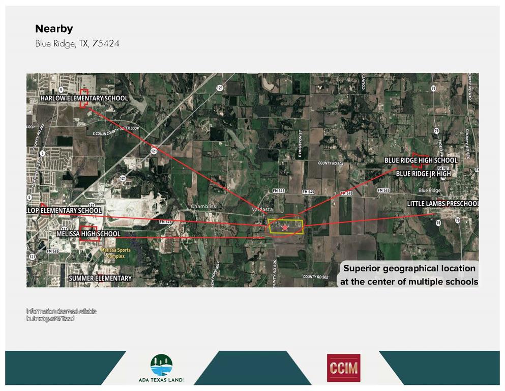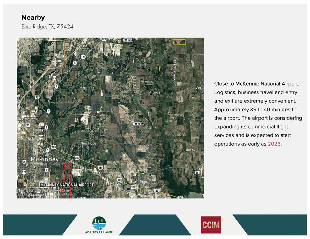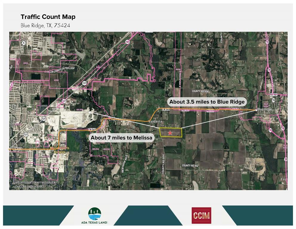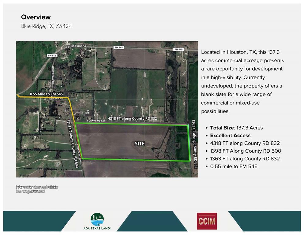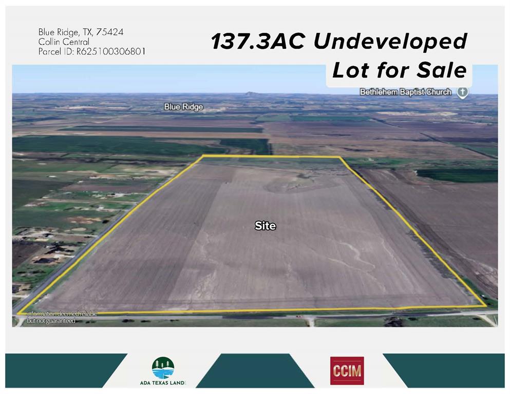 Prime 137.3-acre tract of undeveloped land in Blue Ridge, TX. This high-visibility parcel offers exceptional development potential with over 7,000 feet of combined road frontage: 4,318 FT along County Road 832, 1,398 FT along County Road 500, and 1,363 FT along County Road 832. Located just 0.55 miles from FM 545, the property allows easy access for commercial, industrial, agricultural, or mixed-use development. Situated approximately 35–40 minutes from McKinney National Airport, which is planning commercial flight expansion by 2026. Central location near multiple schools and in an area with significant nearby land development activity. Excellent opportunity for long-term investment and appreciation.