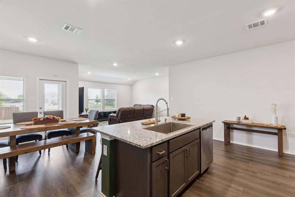 Step inside to an open-concept layout designed for both entertaining and daily living. The spacious living and dining areas flow seamlessly into the kitchen, where you’ll find a bold green center island, granite countertops, a new sink, and a generous breakfast nook filled with natural light.