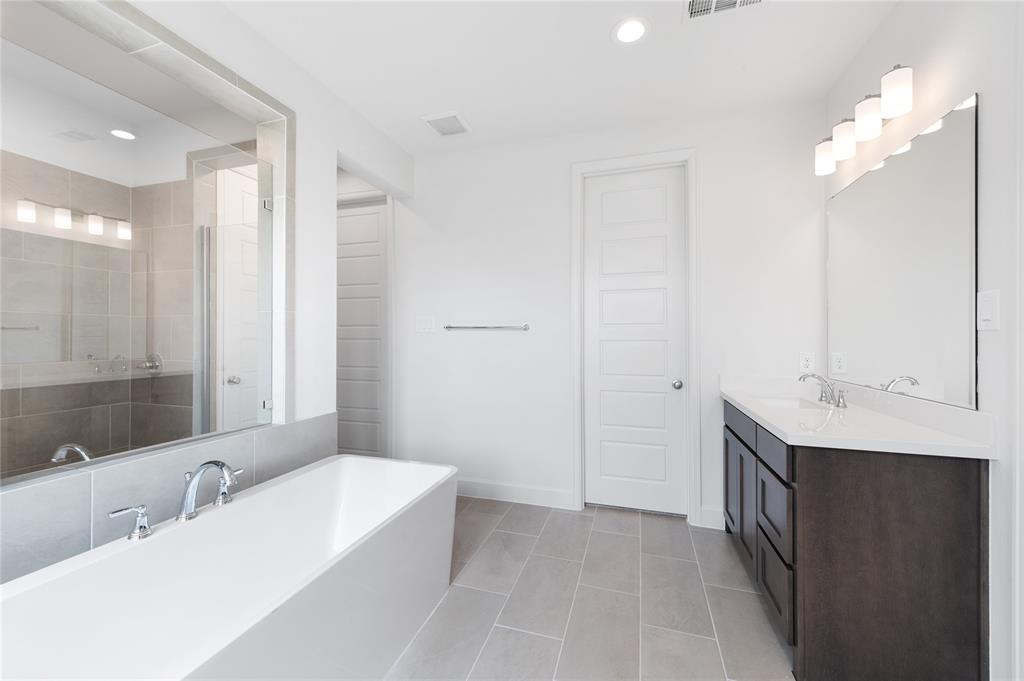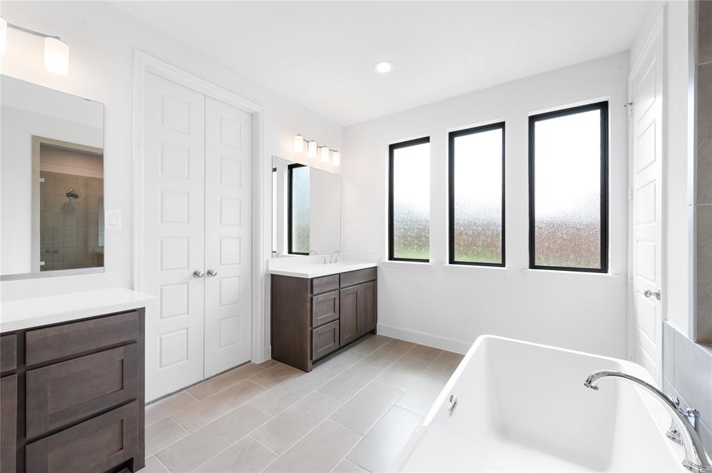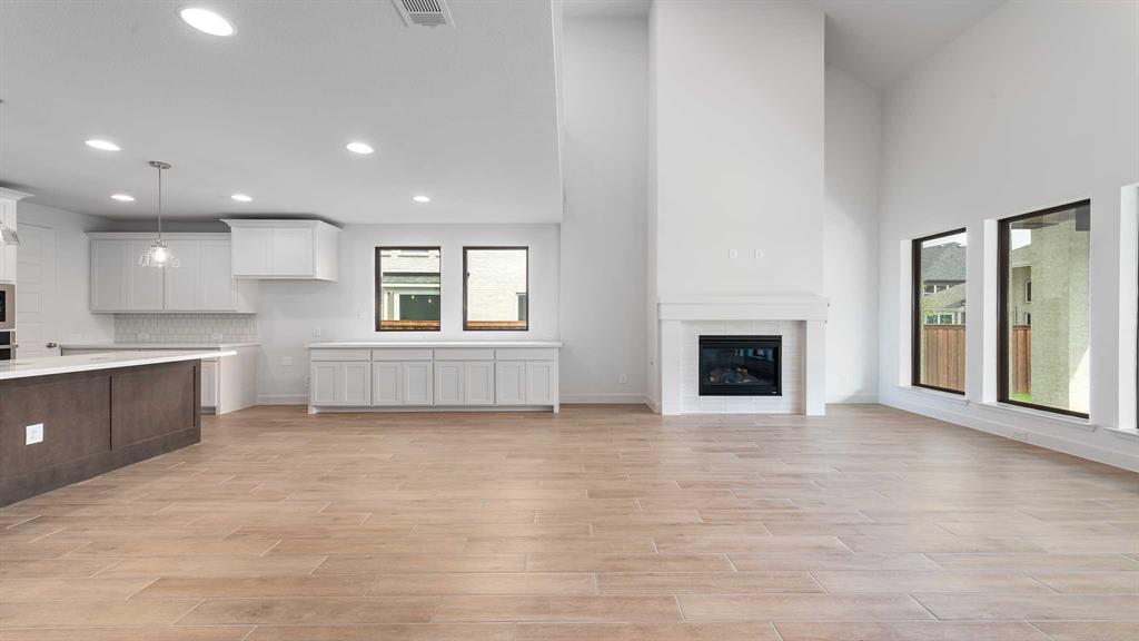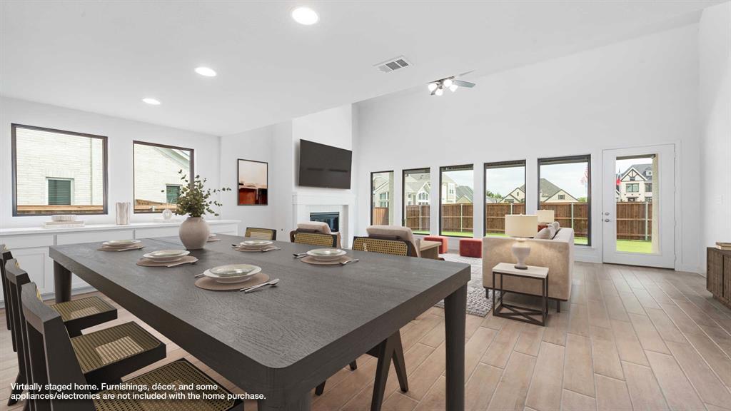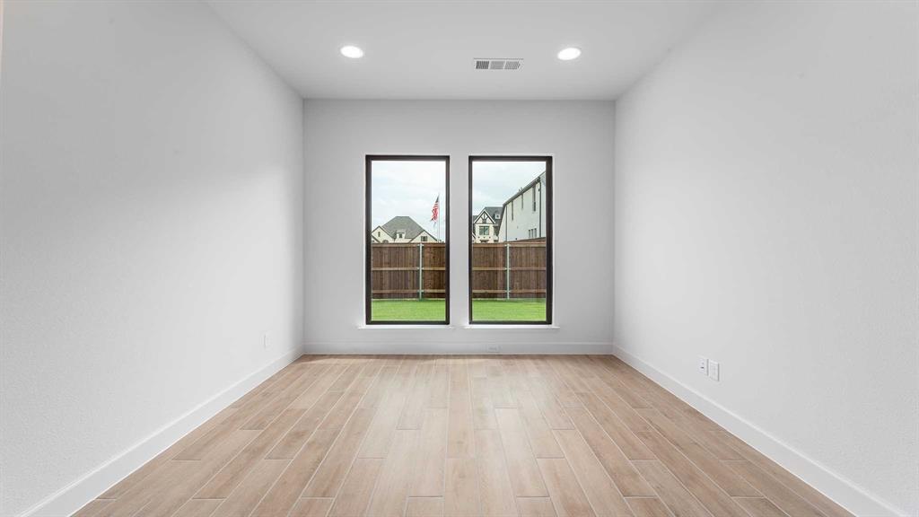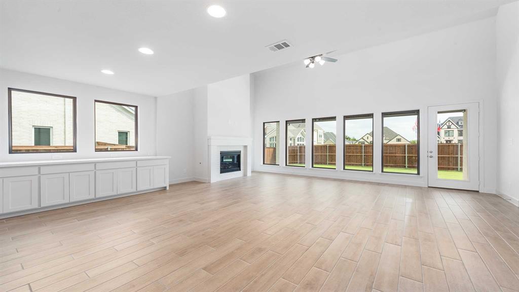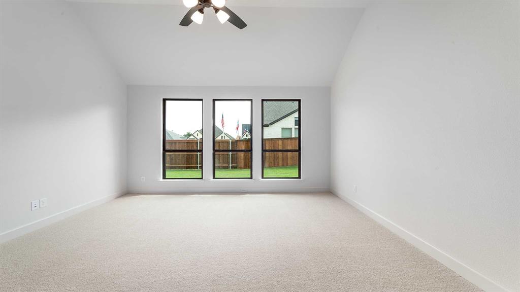 The front porch opens to reveal soaring 19-foot ceilings. Off the entryway, a private guest suite awaits, complete with a full bathroom and walk-in closet. The kitchen showcases an island with built-in seating, 5-burner gas cooktop, a corner pantry, and a seamless flow into the designated dining area. The open family room boasts a wood mantel fireplace and wall of windows. French doors lead into the home office just off the family room. The primary bedroom features three large windows, filling the room with light. Double doors open into the primary suite, offering dual vanities, a freestanding tub, separate glass-enclosed shower, linen closet, two spacious walk-in closets, and private access to the utility room. Upstairs, a spacious game room overlooks the family room below. French doors lead into the media room. Secondary bedrooms which share a full bathroom, complete the second level. Covered backyard patio. The mud room is located just off the two-car garage with additional storage space.