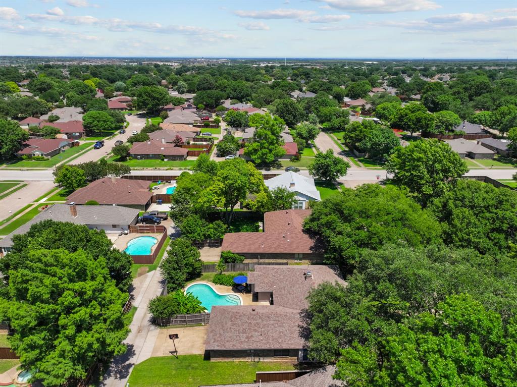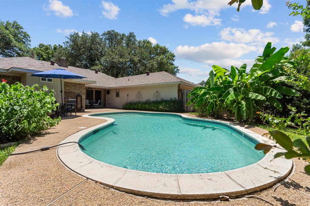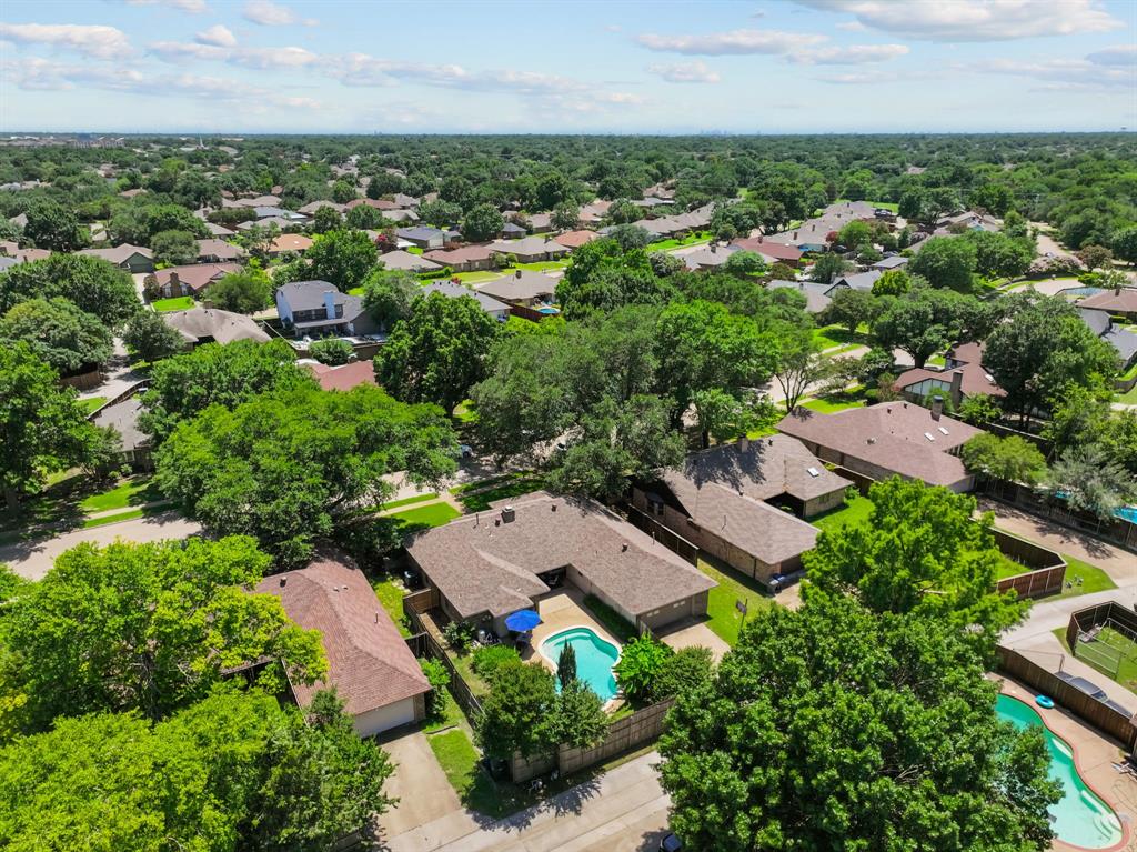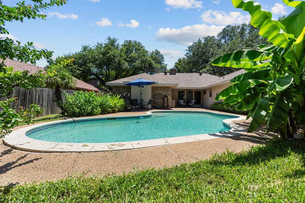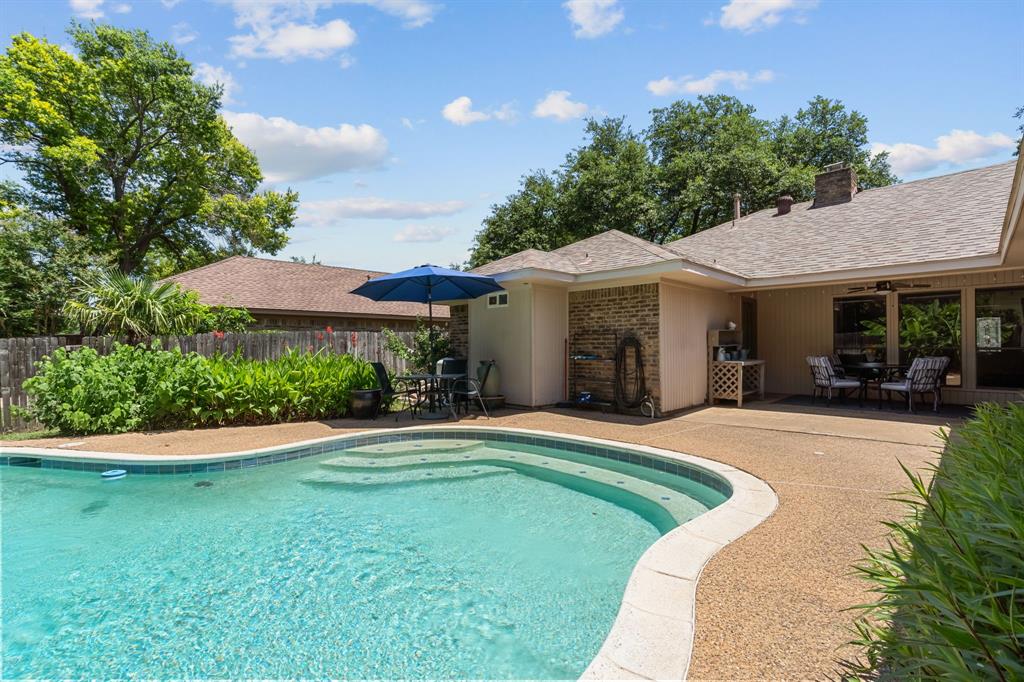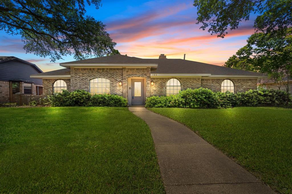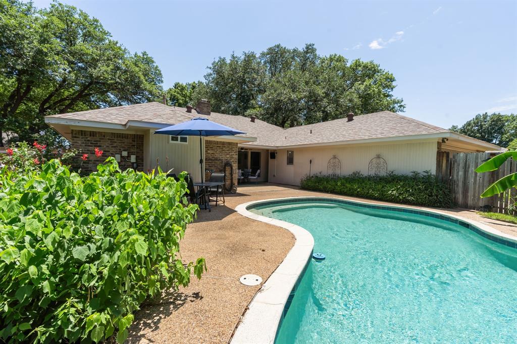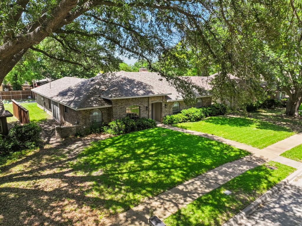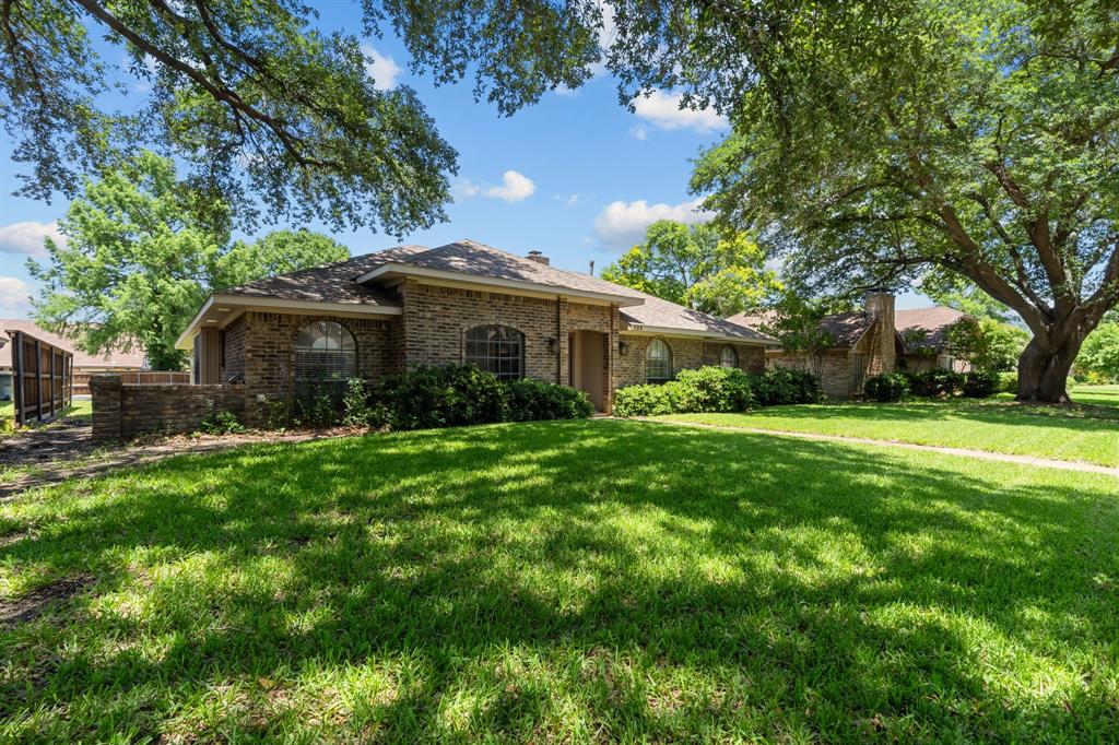 Welcome to this beautifully maintained, single-story brick home nestled in the heart of the well-established Glenbrook Meadows neighborhood. Step inside to find a formal dining room just off the entry, featuring rich hardwood floors and soaring ceilings—ideal for hosting dinner parties or holiday gatherings. The expansive living room is a showstopper with vaulted ceilings, classic wainscoting, and a dramatic floor-to-ceiling brick fireplace that anchors the space. The updated kitchen is a chef’s delight, showcasing granite countertops, stainless steel appliances, double ovens, an electric cooktop, and a designer tile backsplash. Entertain effortlessly with dual access: one side opens to the formal dining room through French doors, while the other leads to a cozy breakfast nook complete with a built-in hutch. At the back of the home, a versatile game room awaits—perfect for a pool table or home theater. This space includes an en-suite bath, wet bar, and direct access to the backyard patio, making it ideal for entertaining. Retreat to the sprawling primary suite, large enough to include a sitting area, and complete with double walk-in closets. The en-suite bathroom features granite countertops and offers a peaceful space to unwind. Generously sized guest bedrooms share a well-appointed bathroom with granite countertops and dual sinks. Step outside and enjoy the best of Texas summers under the covered patio or in the sparkling pool, surrounded by lush landscaping and a spacious open patio—perfect for outdoor dining and relaxation. Additional highlights include a full-size utility room with built-ins, a rear-entry two-car garage, and a community park just a short walk away. Enjoy convenient access to President George Bush Turnpike and the shops, dining, and entertainment at Firewheel Town Center.