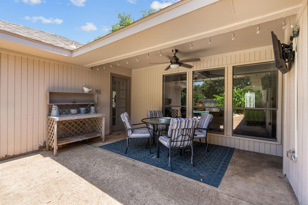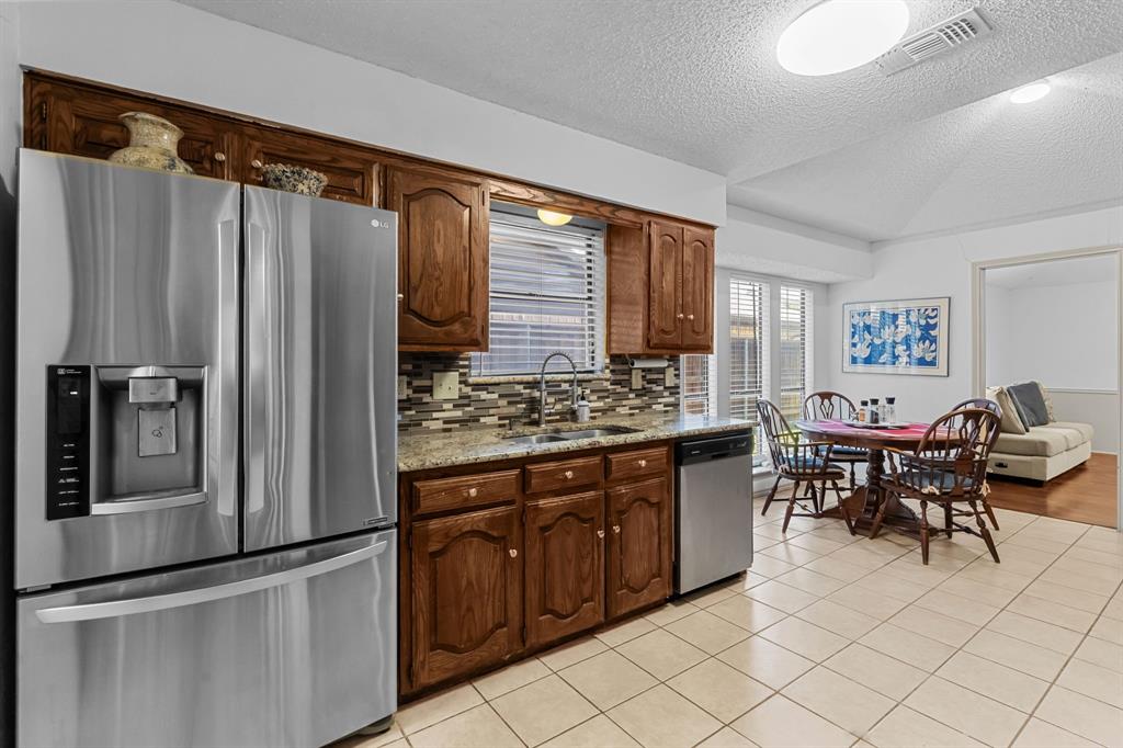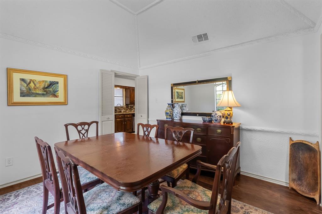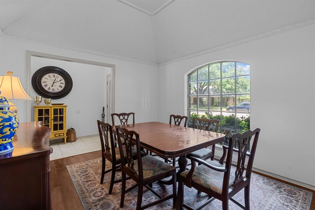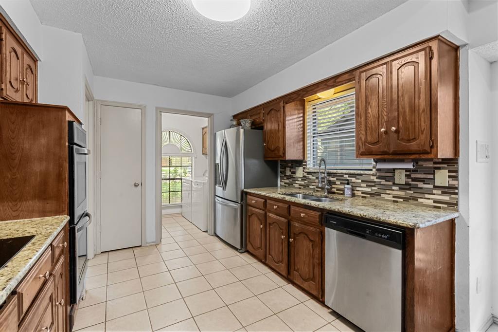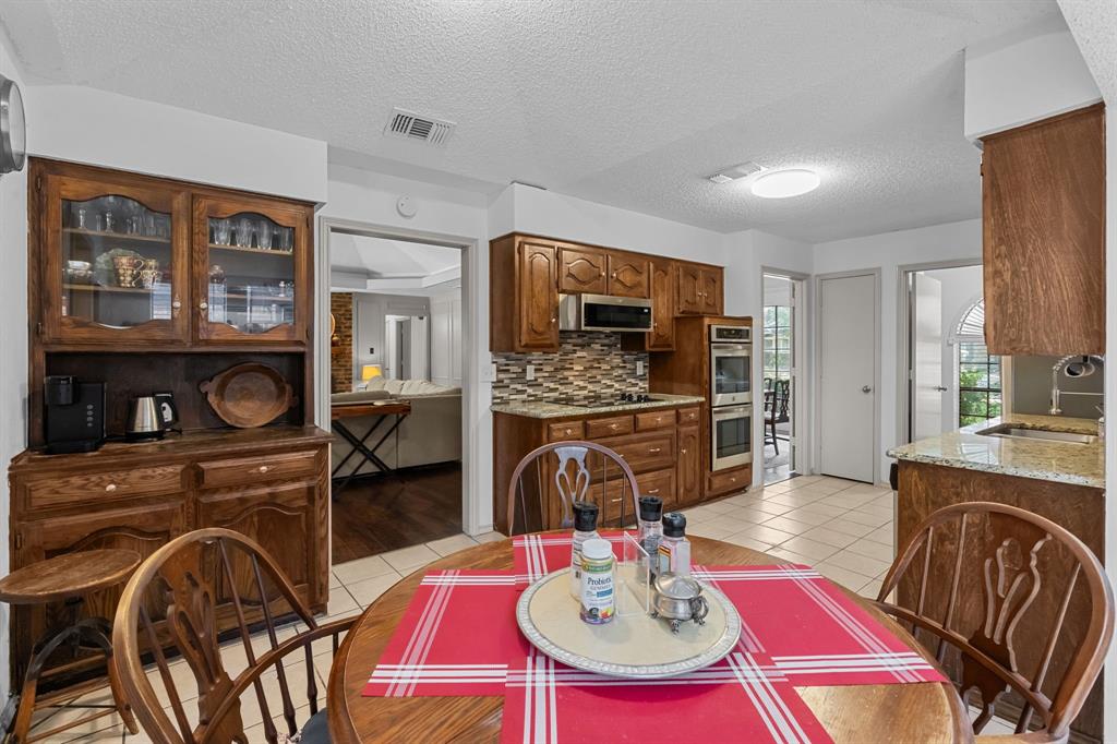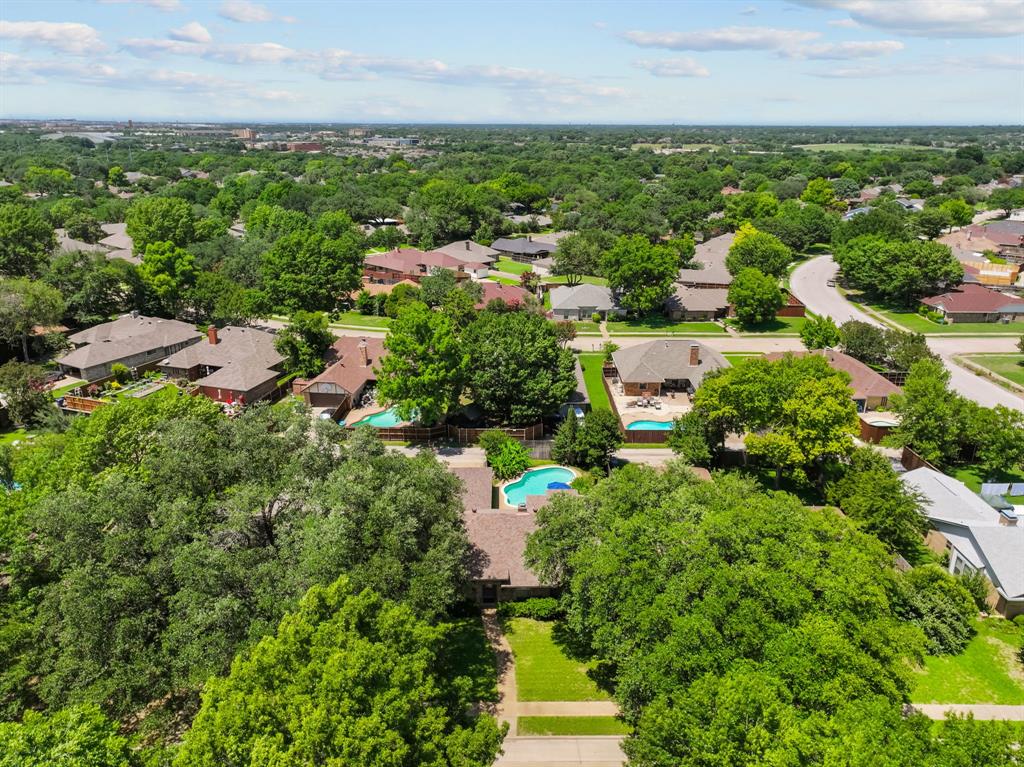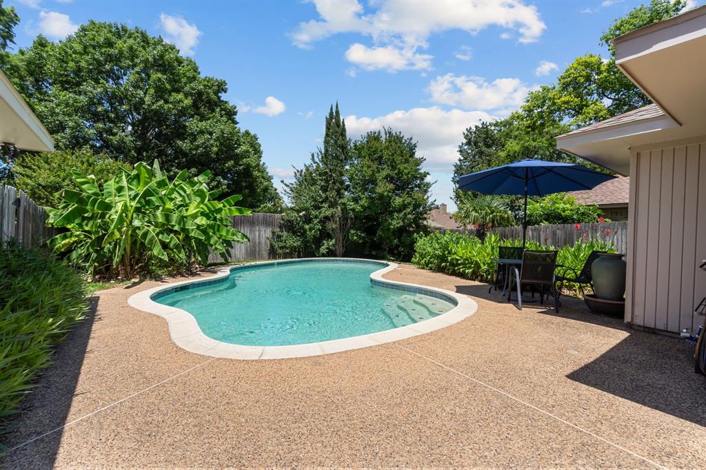 Welcome to this beautifully maintained, single-story brick home nestled in the heart of the well-established Glenbrook Meadows neighborhood. Step inside to find a formal dining room just off the entry, featuring rich hardwood floors and soaring ceilings—ideal for hosting dinner parties or holiday gatherings. The expansive living room is a showstopper with vaulted ceilings, classic wainscoting, and a dramatic floor-to-ceiling brick fireplace that anchors the space. The updated kitchen is a chef’s delight, showcasing granite countertops, stainless steel appliances, double ovens, an electric cooktop, and a designer tile backsplash. Entertain effortlessly with dual access: one side opens to the formal dining room through French doors, while the other leads to a cozy breakfast nook complete with a built-in hutch. At the back of the home, a versatile game room awaits—perfect for a pool table or home theater. This space includes an en-suite bath, wet bar, and direct access to the backyard patio, making it ideal for entertaining. Retreat to the sprawling primary suite, large enough to include a sitting area, and complete with double walk-in closets. The en-suite bathroom features granite countertops and offers a peaceful space to unwind. Generously sized guest bedrooms share a well-appointed bathroom with granite countertops and dual sinks. Step outside and enjoy the best of Texas summers under the covered patio or in the sparkling pool, surrounded by lush landscaping and a spacious open patio—perfect for outdoor dining and relaxation. Additional highlights include a full-size utility room with built-ins, a rear-entry two-car garage, and a community park just a short walk away. Enjoy convenient access to President George Bush Turnpike and the shops, dining, and entertainment at Firewheel Town Center.