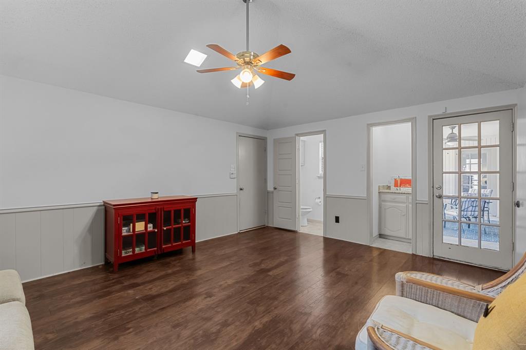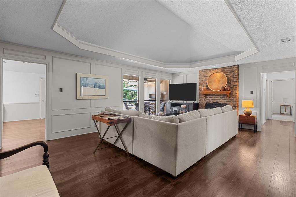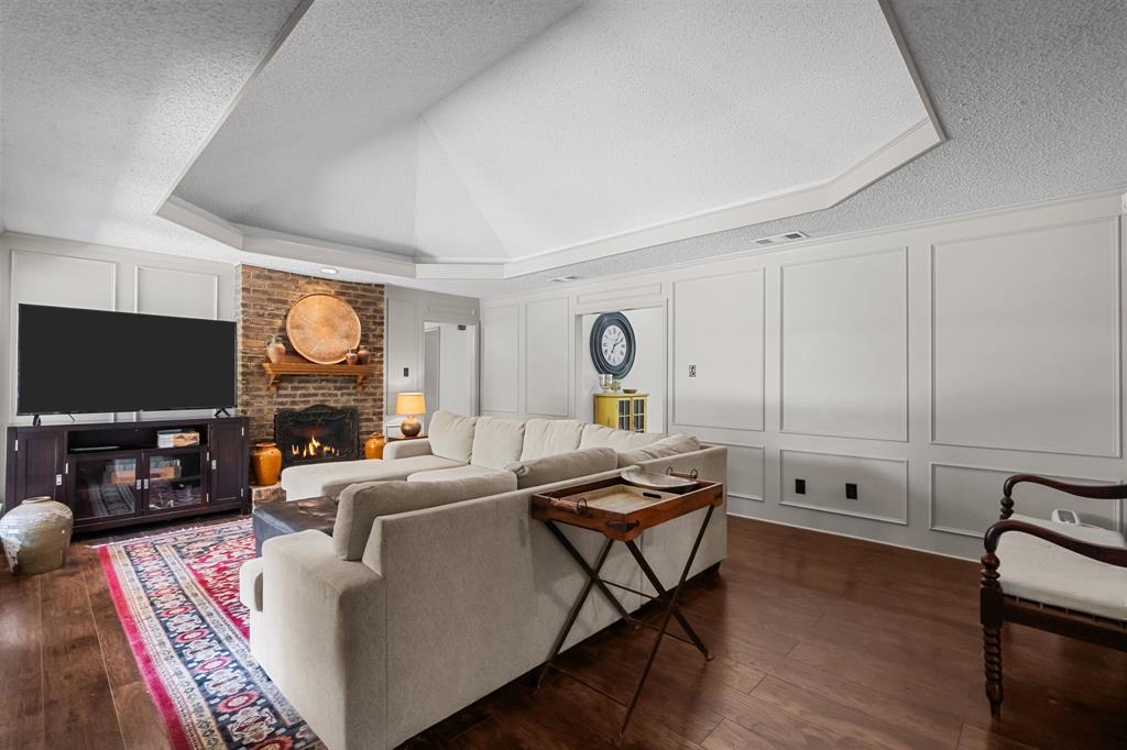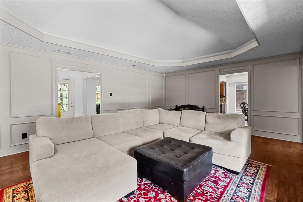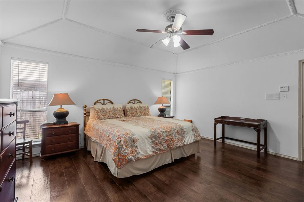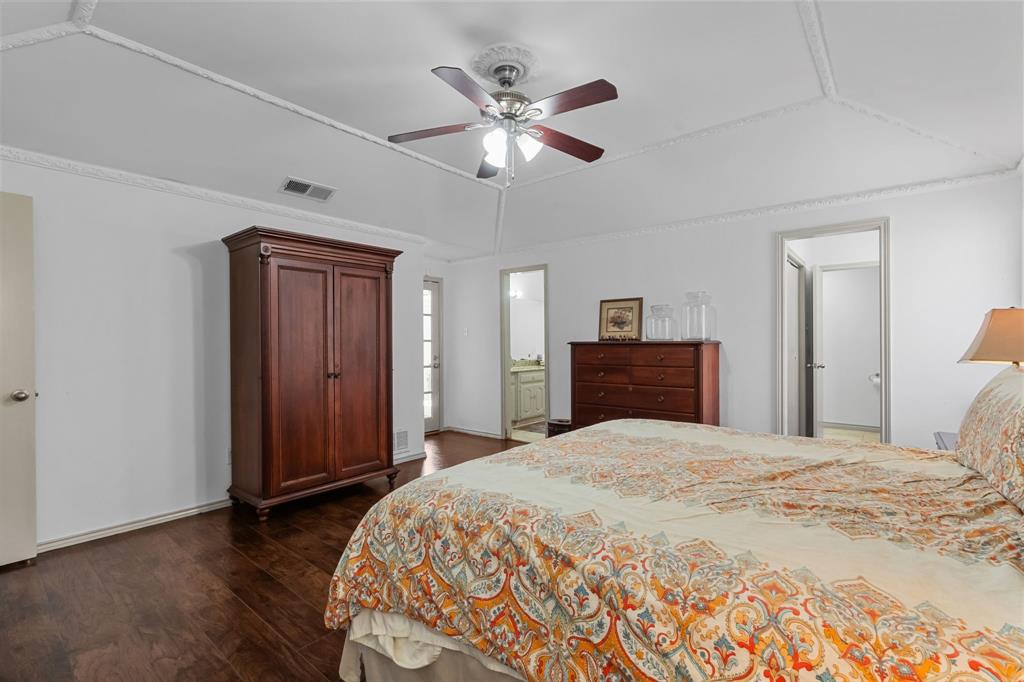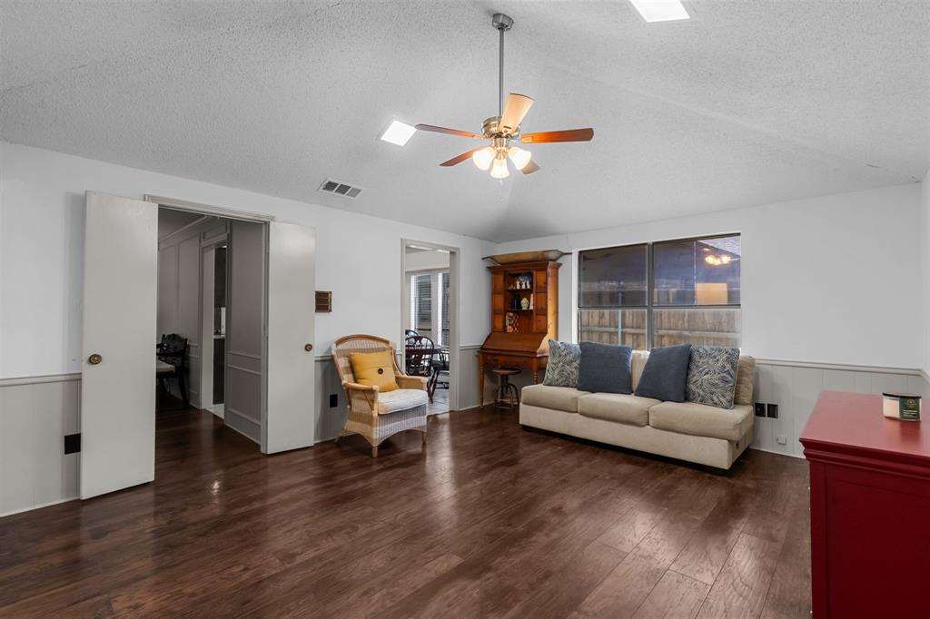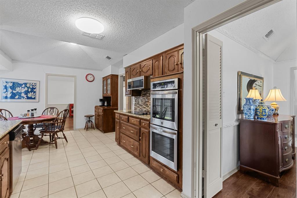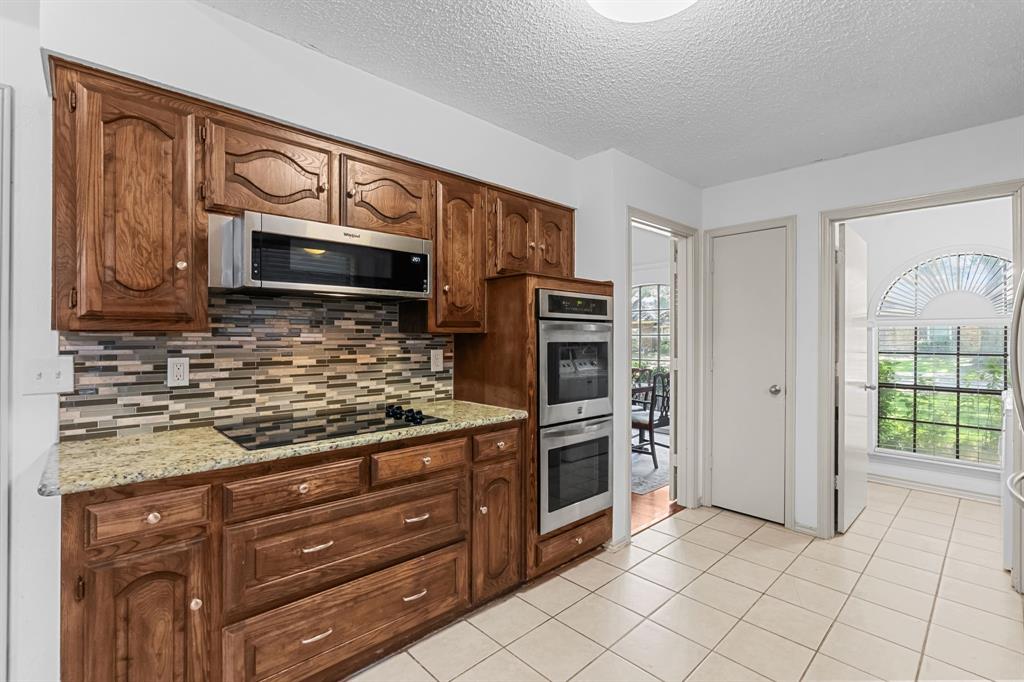 Welcome to this beautifully maintained, single-story brick home nestled in the heart of the well-established Glenbrook Meadows neighborhood. Step inside to find a formal dining room just off the entry, featuring rich hardwood floors and soaring ceilings—ideal for hosting dinner parties or holiday gatherings. The expansive living room is a showstopper with vaulted ceilings, classic wainscoting, and a dramatic floor-to-ceiling brick fireplace that anchors the space. The updated kitchen is a chef’s delight, showcasing granite countertops, stainless steel appliances, double ovens, an electric cooktop, and a designer tile backsplash. Entertain effortlessly with dual access: one side opens to the formal dining room through French doors, while the other leads to a cozy breakfast nook complete with a built-in hutch. At the back of the home, a versatile game room awaits—perfect for a pool table or home theater. This space includes an en-suite bath, wet bar, and direct access to the backyard patio, making it ideal for entertaining. Retreat to the sprawling primary suite, large enough to include a sitting area, and complete with double walk-in closets. The en-suite bathroom features granite countertops and offers a peaceful space to unwind. Generously sized guest bedrooms share a well-appointed bathroom with granite countertops and dual sinks. Step outside and enjoy the best of Texas summers under the covered patio or in the sparkling pool, surrounded by lush landscaping and a spacious open patio—perfect for outdoor dining and relaxation. Additional highlights include a full-size utility room with built-ins, a rear-entry two-car garage, and a community park just a short walk away. Enjoy convenient access to President George Bush Turnpike and the shops, dining, and entertainment at Firewheel Town Center.