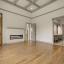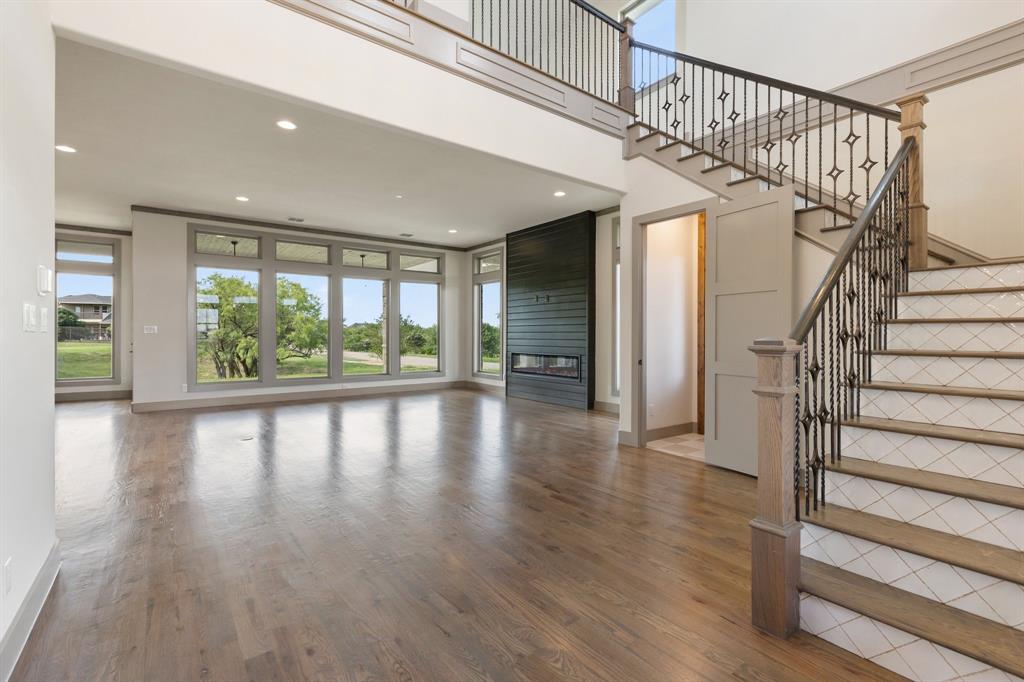 The living room is flooded with natural light and features a charming fireplace framed by a striking wood-accented wall, along with a grand staircase leading to a spacious loft and beautiful balcony.