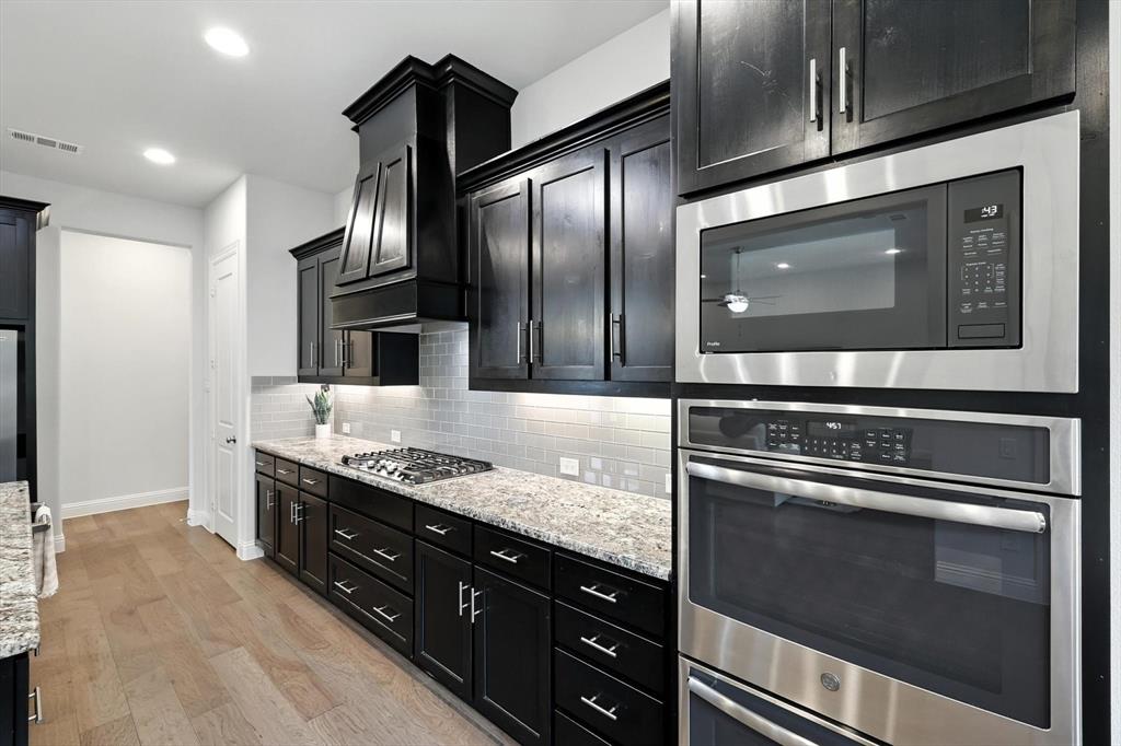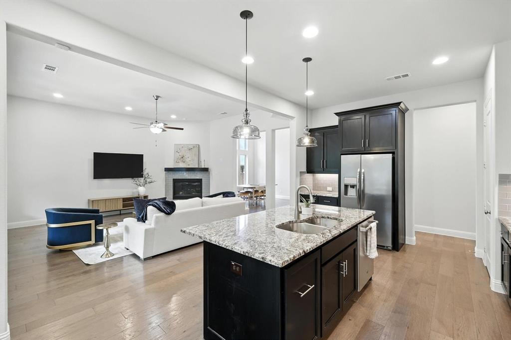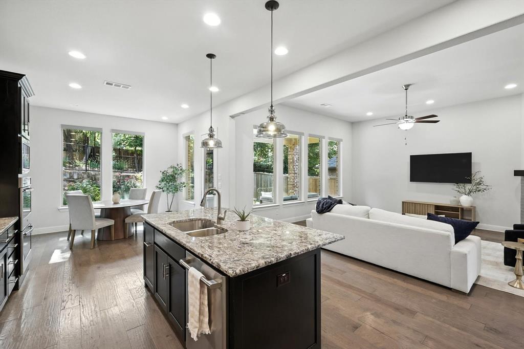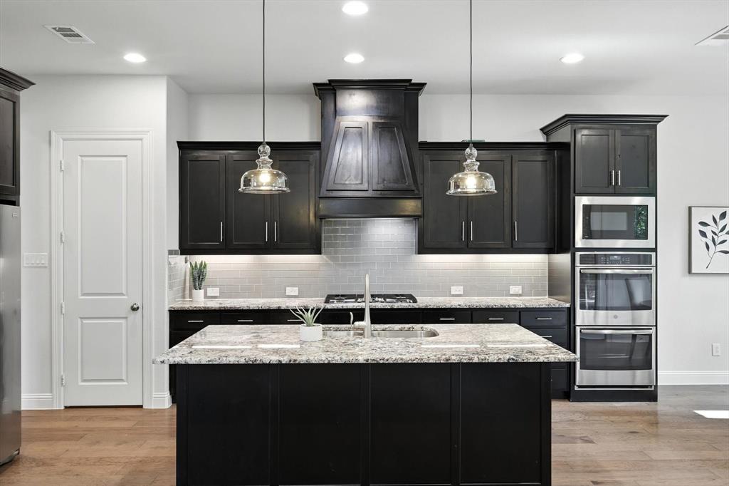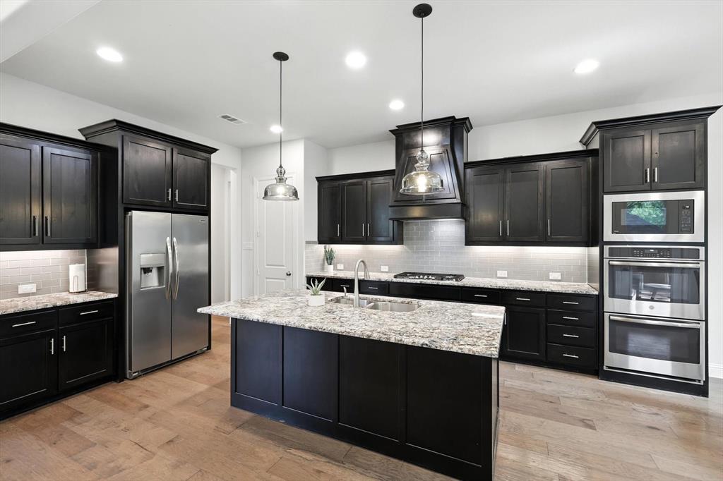 The chef’s kitchen is the heart of the home, complete with gleaming stainless steel appliances, double ovens, and a large granite island perfect for entertaining. It opens gracefully into the family room, offering the ideal setting for hosting gatherings or enjoying cozy evenings in.