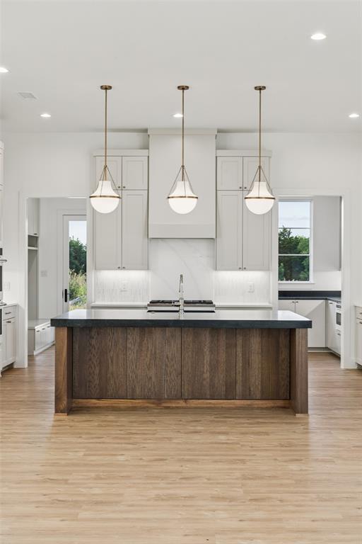 At the heart of the home, the gourmet kitchen impresses with a massive island, walk-in pantry, massive butler's pantry, custom cabinetry, and designer lighting. The adjacent dining area is both elegant and functional, framed by picture windows that overlook the backyard.