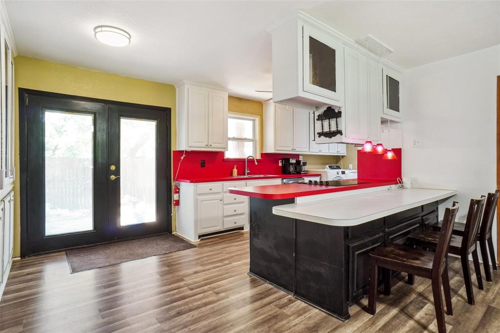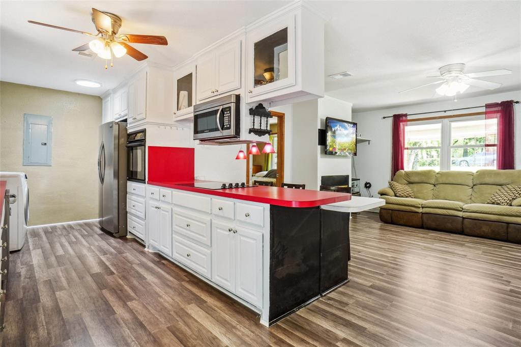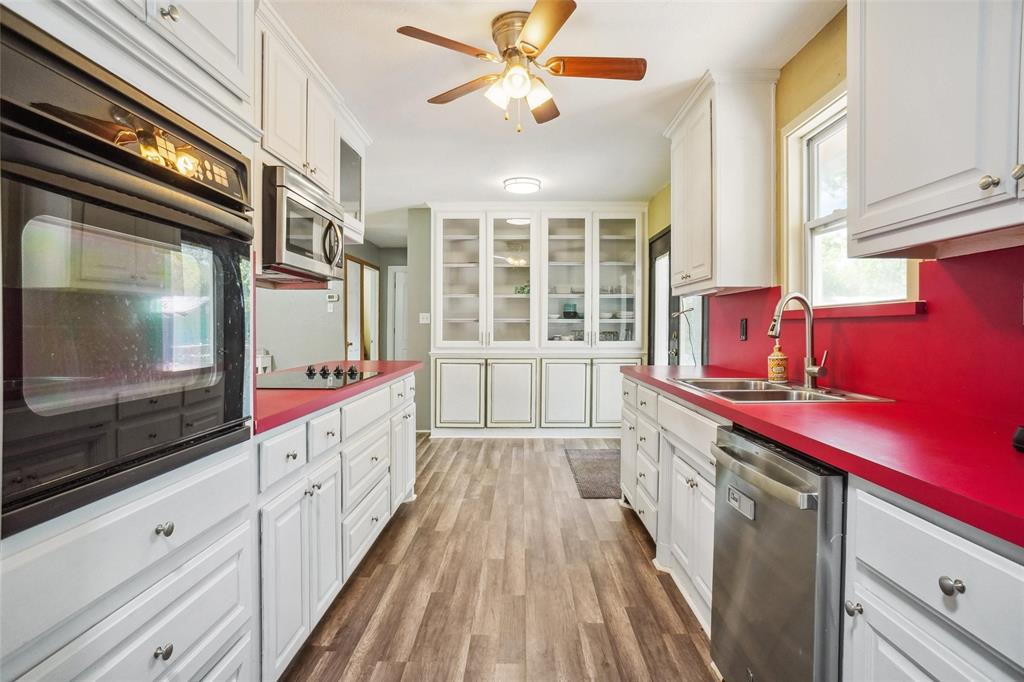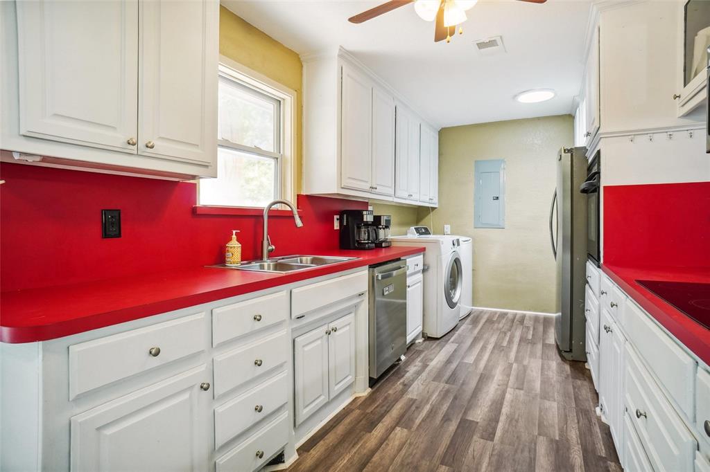 new dishwasher and freshly painted kitchen with updated electrical outlets and charming red accent countertops,