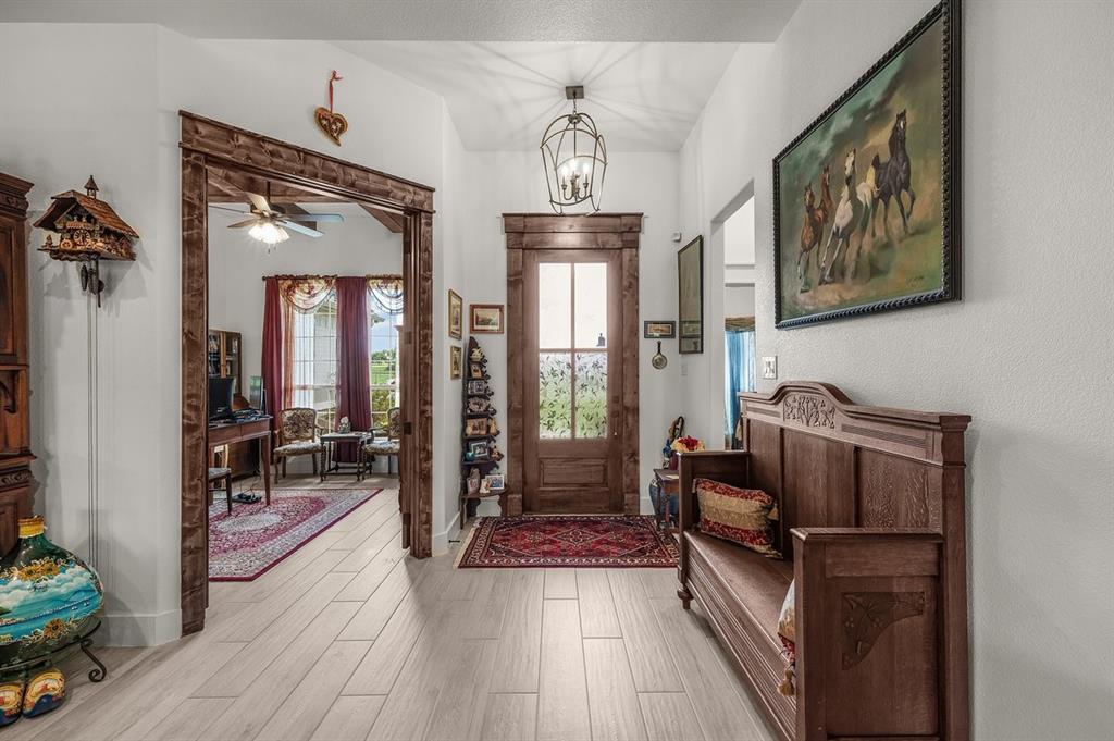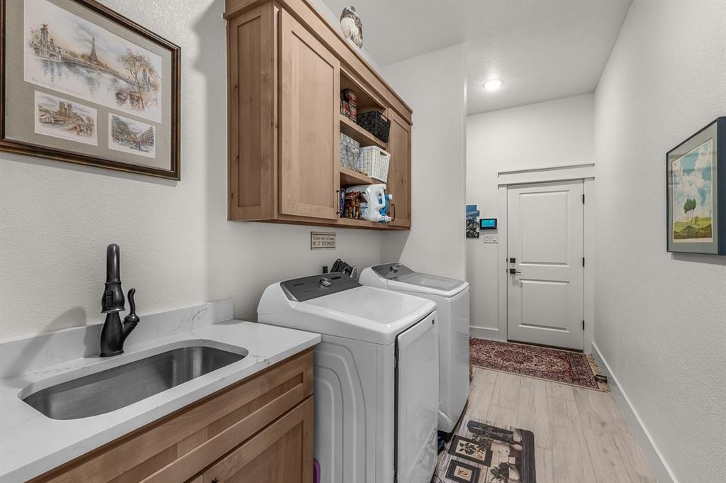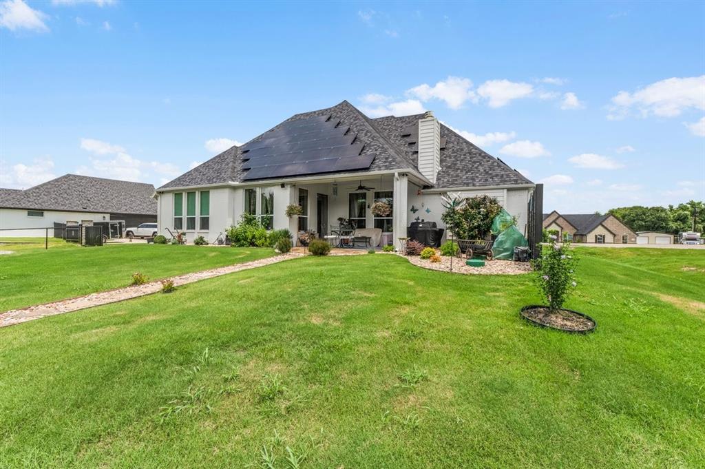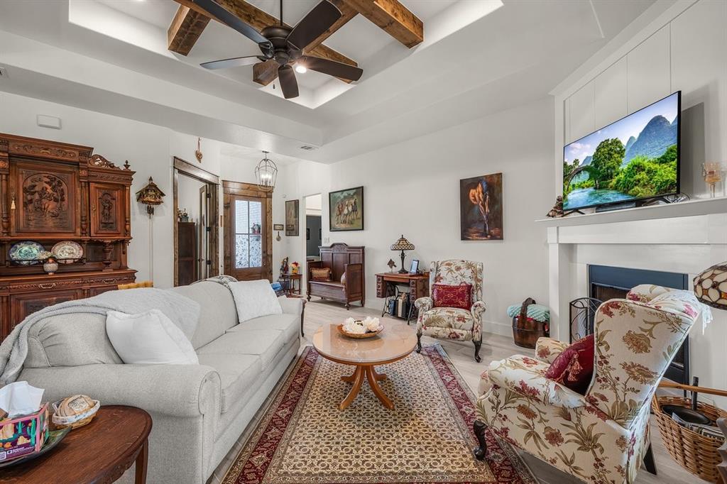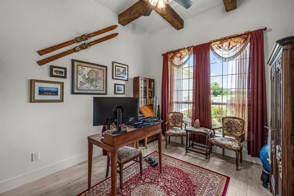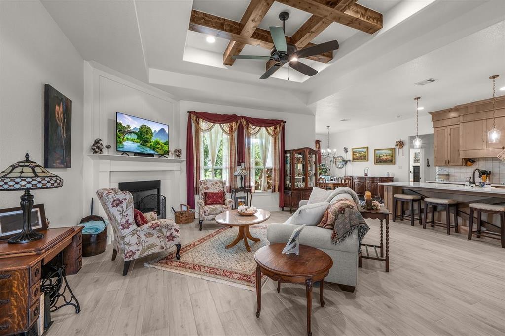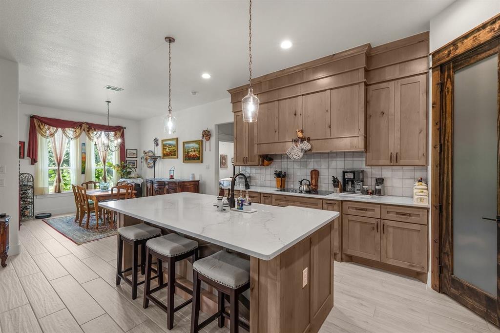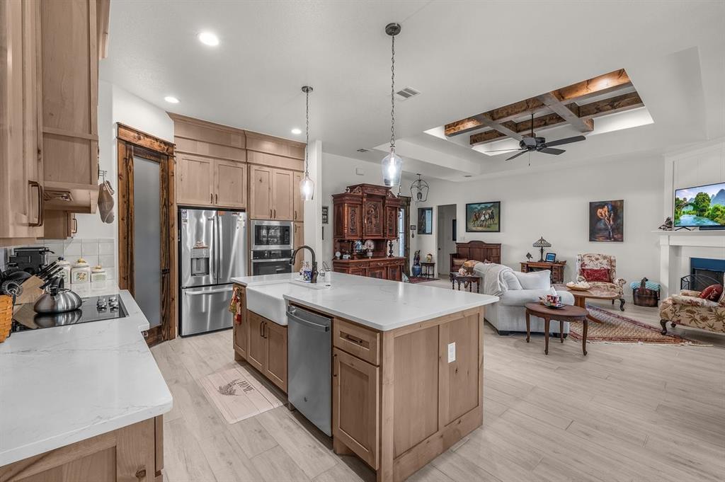 Thoughtfully designed, impeccably upgraded & thousands of dollars spent, this stunning 3 BR, 2 BA home with a dedicated office is nestled at the back of a quiet cul de sac, offering both privacy, charm and plenty of room to roam. From the moment you step inside, you’ll notice the attention to detail & craftsmanship throughout. The open concept layout is anchored by a gorgeous farmhouse style board & batten fireplace, perfectly complemented by coffered ceilings with exposed beams in both the family room & office. The main living areas feature plank tile, while the secondary bedrooms are outfitted with upgraded plush carpet for added comfort. The kitchen is a true showstopper featuring custom stained Alder cabinetry, sleek quartz countertops, a tiled backsplash, farmhouse sink, stainless steel appliances & a walk in pantry with a beautifully trimmed glass door. The dining area offers peaceful views of the backyard oasis. Retreat to the spacious primary suite, where you’ll find a luxurious en-suite bath with a soaker tub, a separate walk in tiled shower, dual sinks with a large vanity, privacy window & a custom-trimmed mirror. The walk-in closet is a dream, fully built out with floor to ceiling storage, up to the ceiling hanging rods, a bench & even a mirror. Additional highlights include: Office with 8-ft glass french doors, secondary bath with herringbone tile surround & a custom mirror, bedroom with a window seat niche, utility room with sink & mud bench, 5” baseboards, upgraded light fixtures, class 4 roof & fully insulated attic with floor boards, custom wood trim around all interior doors, solar panels with EV charging port, epoxy coated garage floors & an garage closet with AC currently used as a wine closet, a tastefully landscaped yard with mature trees, added retaining wall, fire pit, planter box & a creek running through the back for a peaceful country feel, covered back patio with sun shades & misters, 12x20 shed or shop pad, rain gutters, uplighting & more