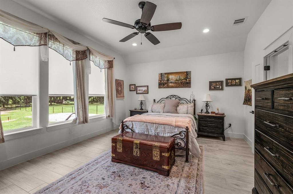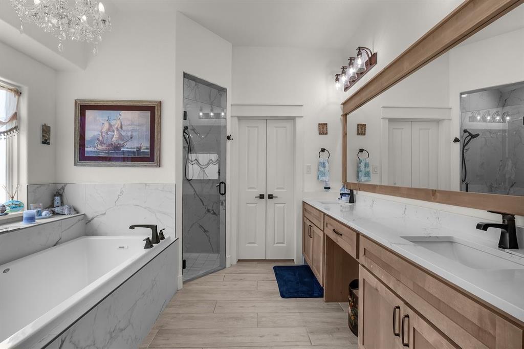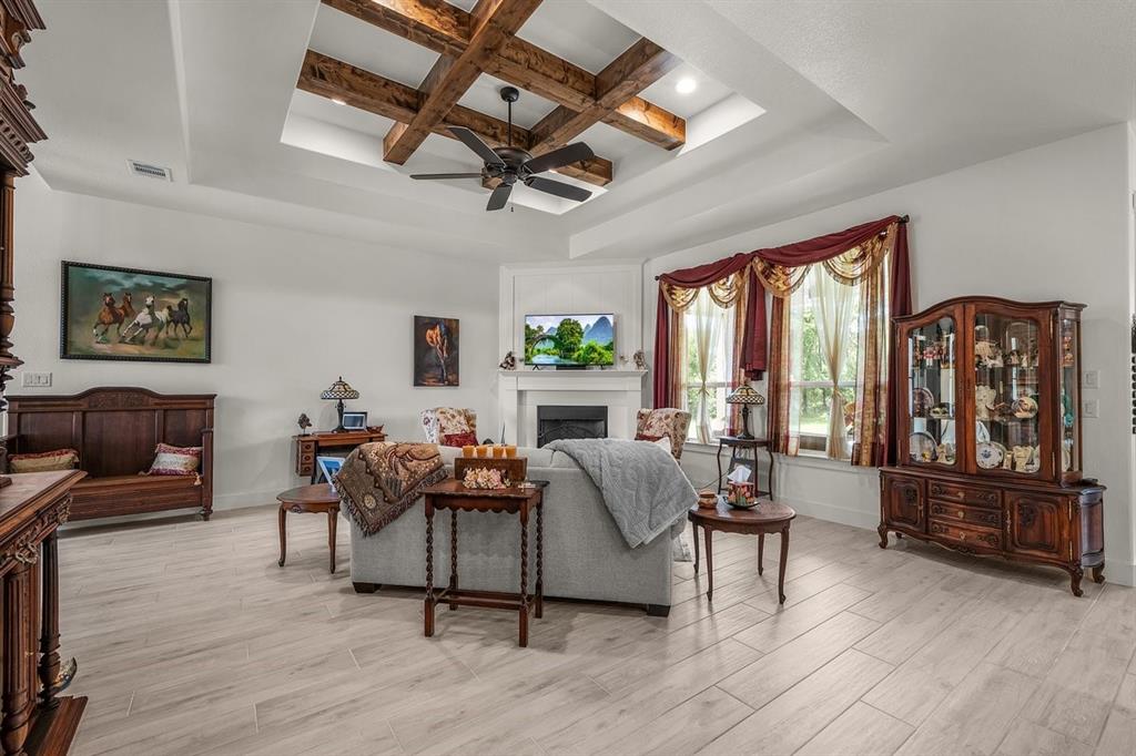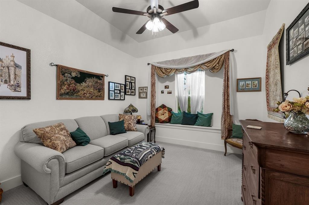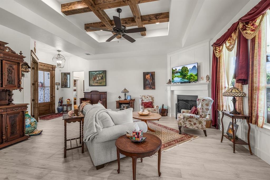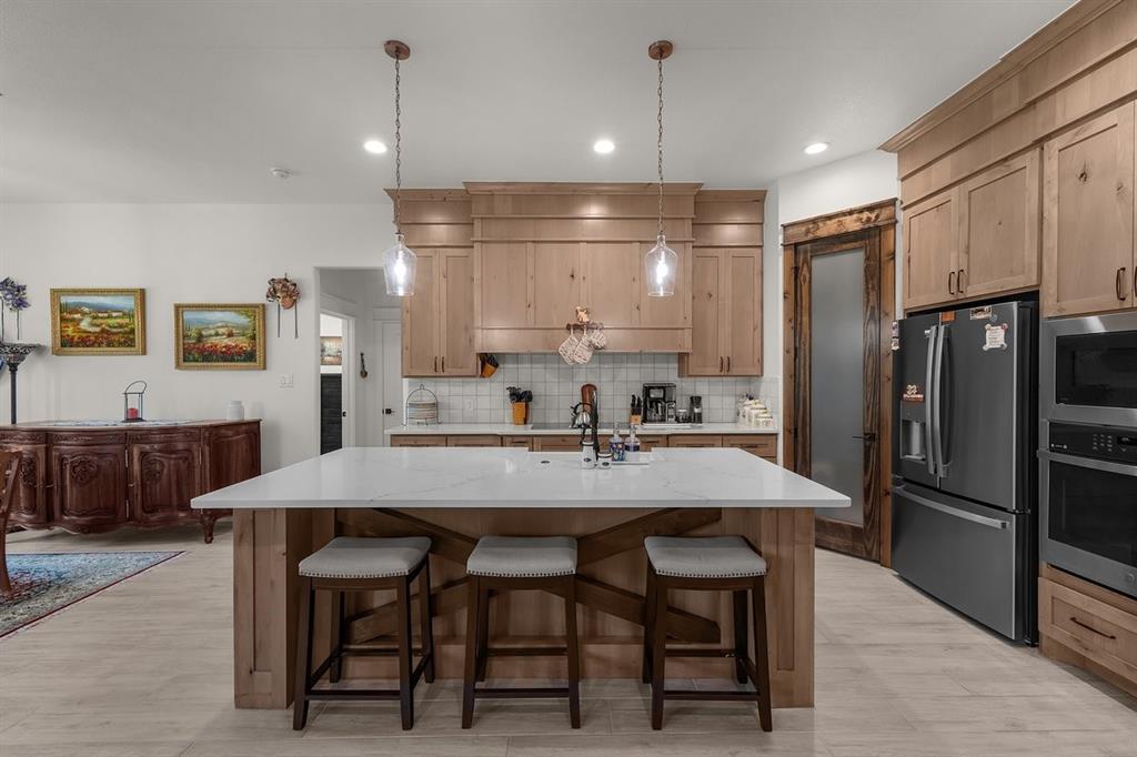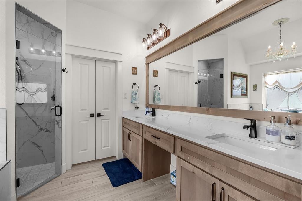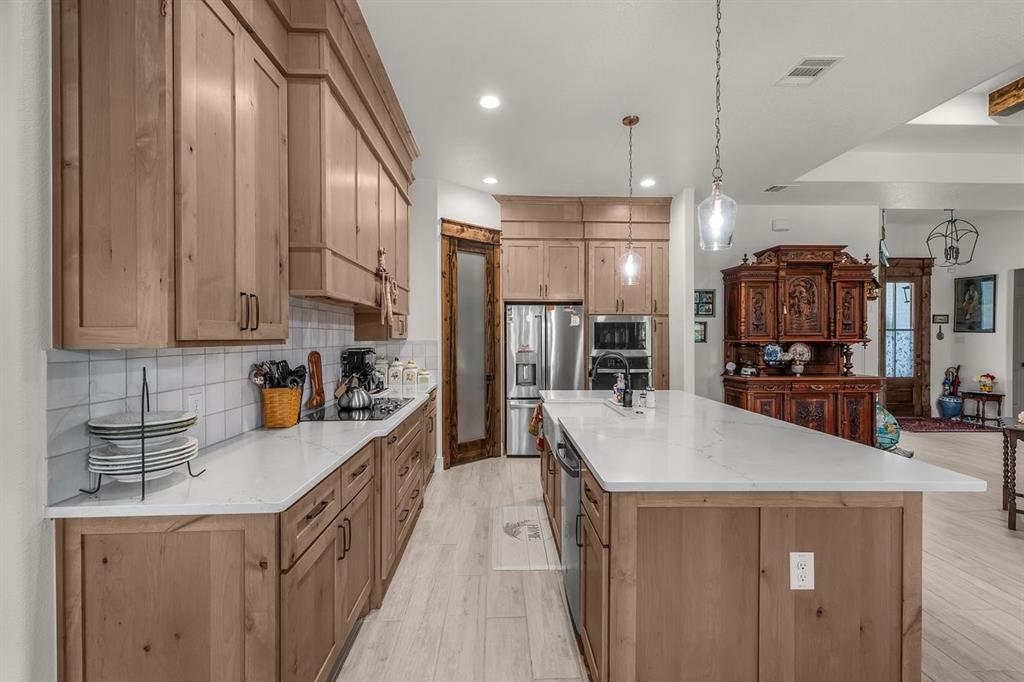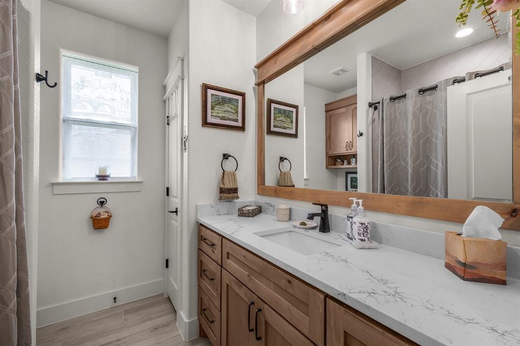 Thoughtfully designed, impeccably upgraded & thousands of dollars spent, this stunning 3 BR, 2 BA home with a dedicated office is nestled at the back of a quiet cul de sac, offering both privacy, charm and plenty of room to roam. From the moment you step inside, you’ll notice the attention to detail & craftsmanship throughout. The open concept layout is anchored by a gorgeous farmhouse style board & batten fireplace, perfectly complemented by coffered ceilings with exposed beams in both the family room & office. The main living areas feature plank tile, while the secondary bedrooms are outfitted with upgraded plush carpet for added comfort. The kitchen is a true showstopper featuring custom stained Alder cabinetry, sleek quartz countertops, a tiled backsplash, farmhouse sink, stainless steel appliances & a walk in pantry with a beautifully trimmed glass door. The dining area offers peaceful views of the backyard oasis. Retreat to the spacious primary suite, where you’ll find a luxurious en-suite bath with a soaker tub, a separate walk in tiled shower, dual sinks with a large vanity, privacy window & a custom-trimmed mirror. The walk-in closet is a dream, fully built out with floor to ceiling storage, up to the ceiling hanging rods, a bench & even a mirror. Additional highlights include: Office with 8-ft glass french doors, secondary bath with herringbone tile surround & a custom mirror, bedroom with a window seat niche, utility room with sink & mud bench, 5” baseboards, upgraded light fixtures, class 4 roof & fully insulated attic with floor boards, custom wood trim around all interior doors, solar panels with EV charging port, epoxy coated garage floors & an garage closet with AC currently used as a wine closet, a tastefully landscaped yard with mature trees, added retaining wall, fire pit, planter box & a creek running through the back for a peaceful country feel, covered back patio with sun shades & misters, 12x20 shed or shop pad, rain gutters, uplighting & more