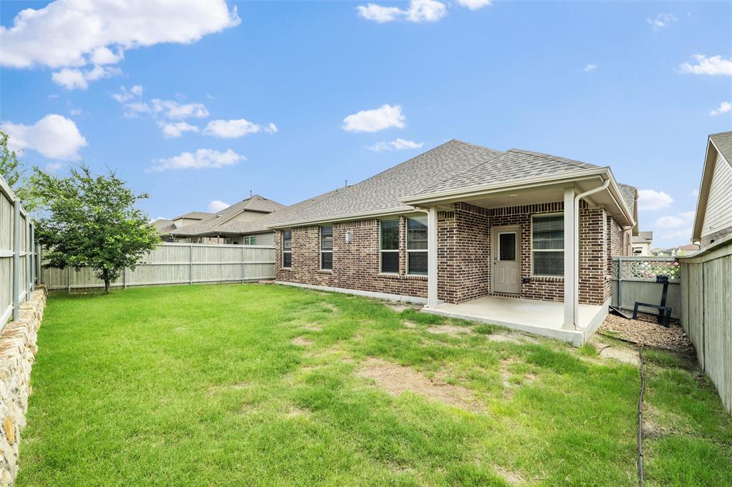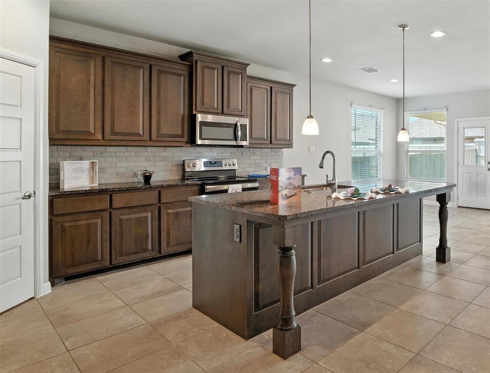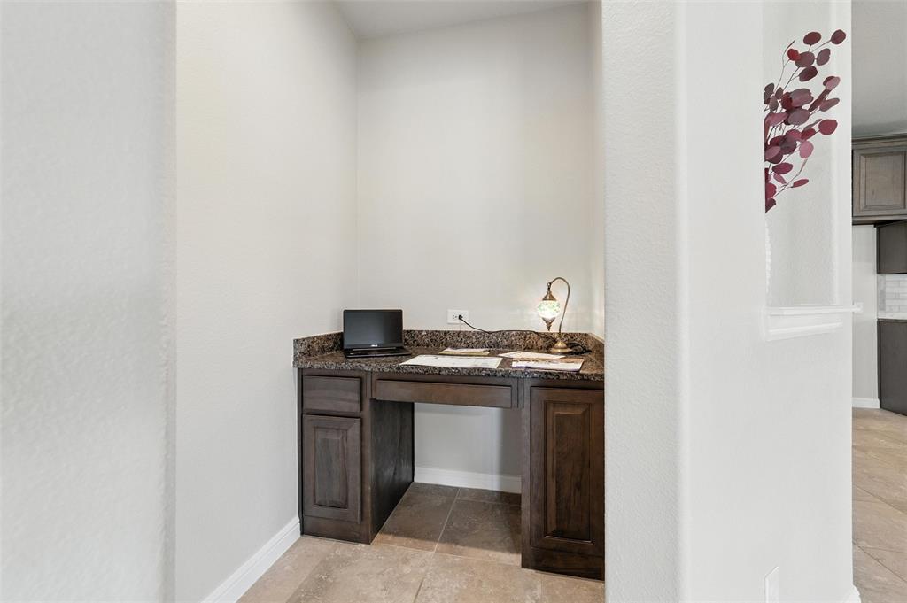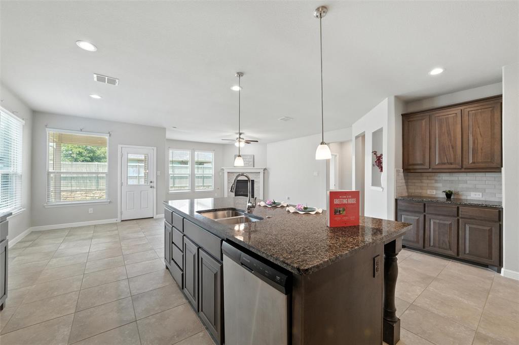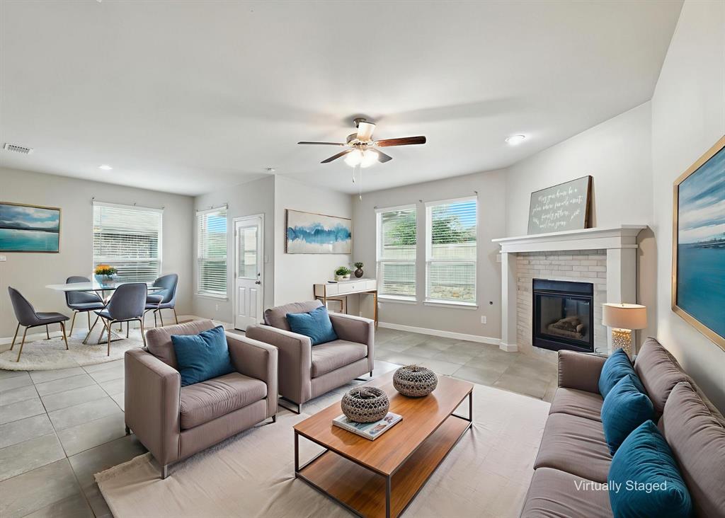 The open-concept layout features tile floors, a gas log fireplace, and a bright, spacious kitchen with a LARGE GRANITE ISLAND, walk-in pantry, and secondary prep area. A built-in cove office and mudroom add smart functionality, while the oversized utility room provides space for a second refrigerator or freezer. The primary suite offers a soaking tub, separate shower, dual vanities, and a big walk-in closet. Covered FRONT AND BACK PATIOS are perfect for morning coffee or afternoon BBQs, and the raised backyard fence adds privacy. Additional features include a GAS TANKLESS WATER HEATER, SMART THERMOSTAT, and FULL SPRINKLER SYSTEM.