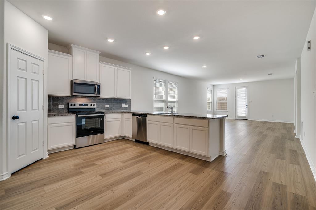 Experience relaxed, single-story living in this thoughtfully designed home by KB Home. The open concept kitchen and living area, complemented by a den, offer flexible living spaces. Enjoy the modern kitchen featuring upgraded backsplash, Moen high arch faucet, and stainless steel appliances. The primary bath showcases a raised cabinet, extended vanity, and a luxurious fiberglass enclosed shower. Outside, the extended patio, full house gutters, and automatic sprinkler system enhance your outdoor living. Further, the decorative touches like Kwikset smartkey entry door, faux wood blinds, USB receptacles, and a smart thermostat enrich the living experience, making this home a true gem.